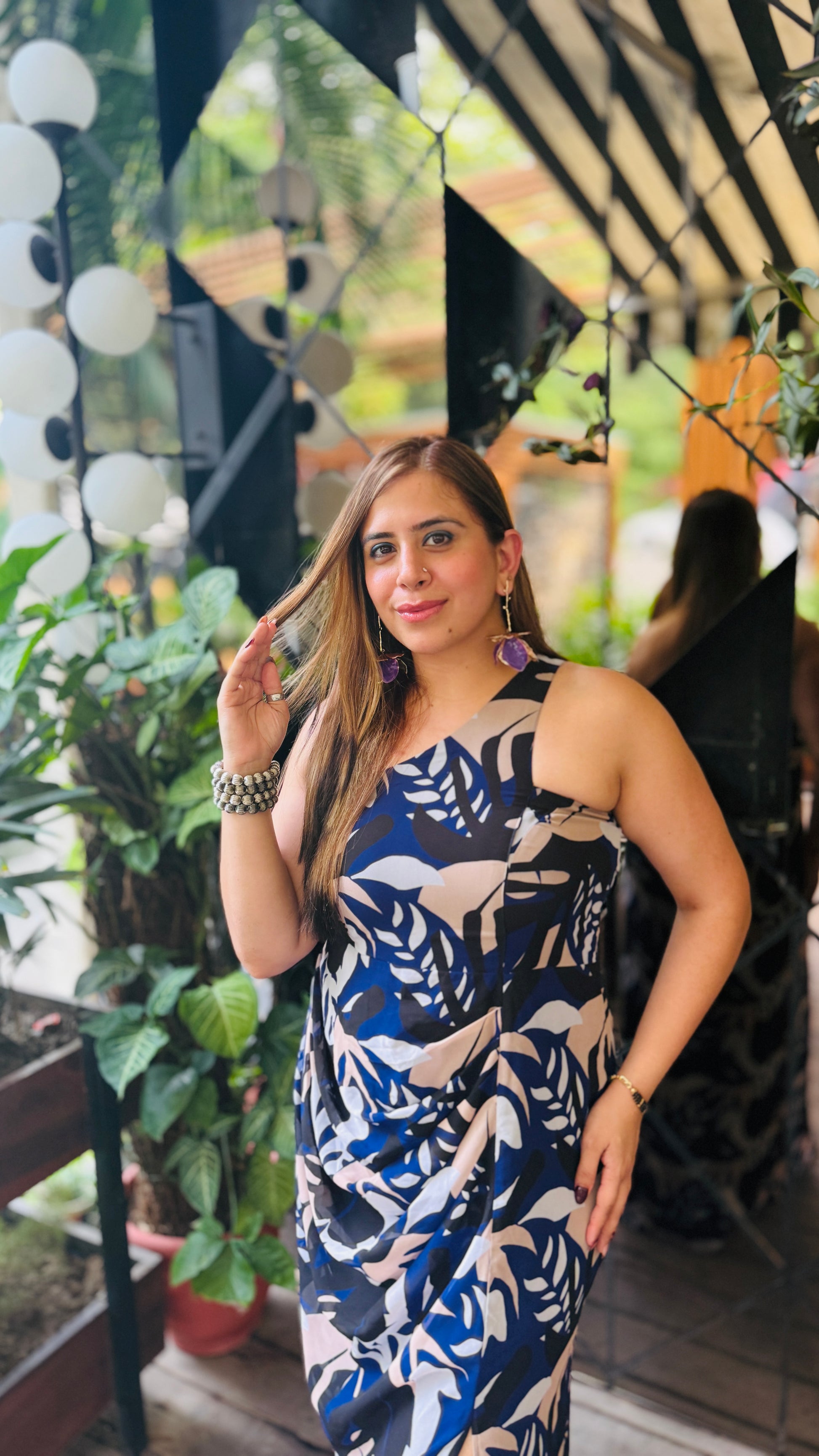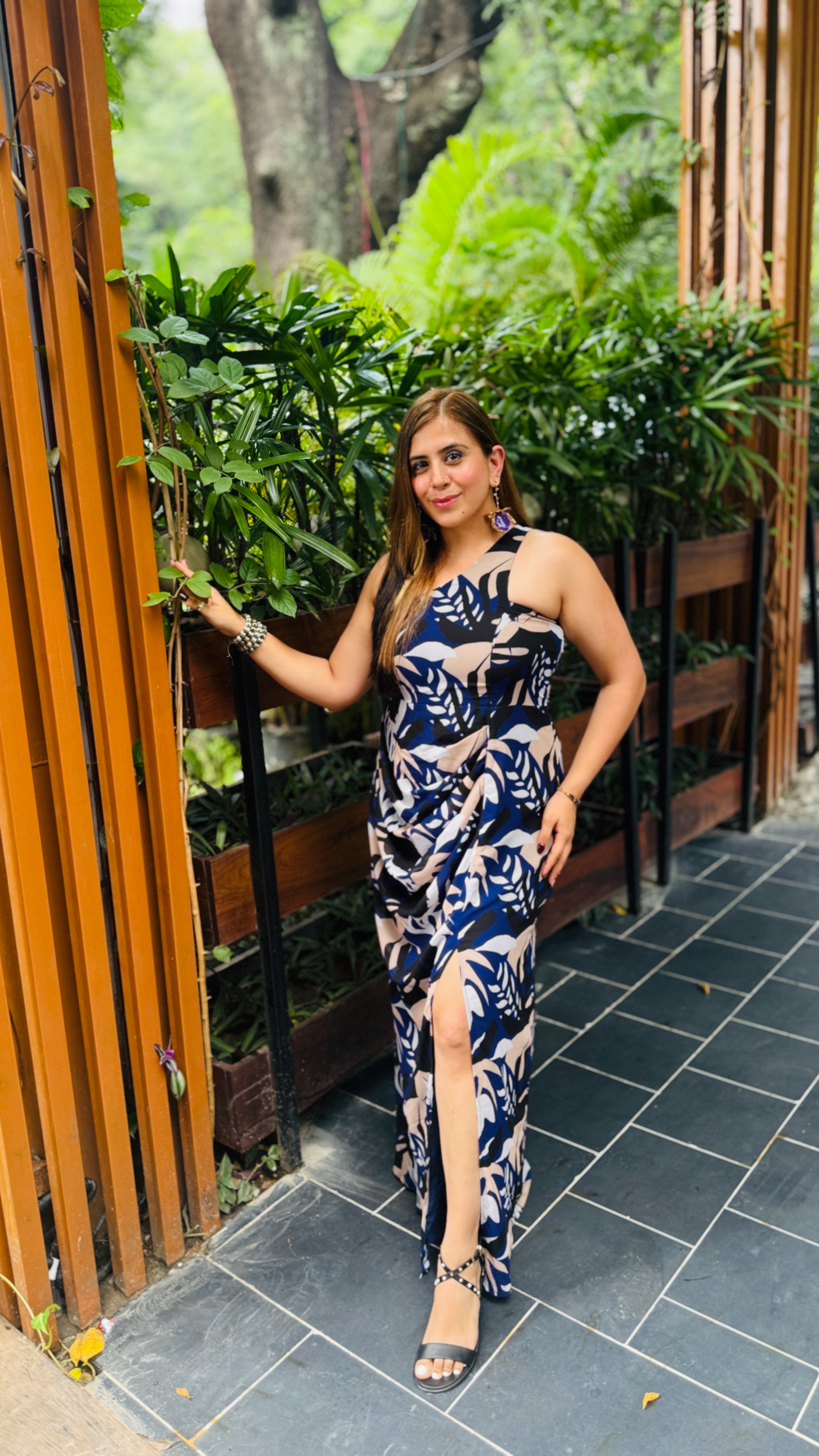 Elegant and fierce 🌿✨ Sleeveless jungle drape dress in navy and beige leaf print, featuring a stylish side drape. Paired with statement earrings, bracelet, and black heels 👠 — perfect resort-chic vibes 🌴. |