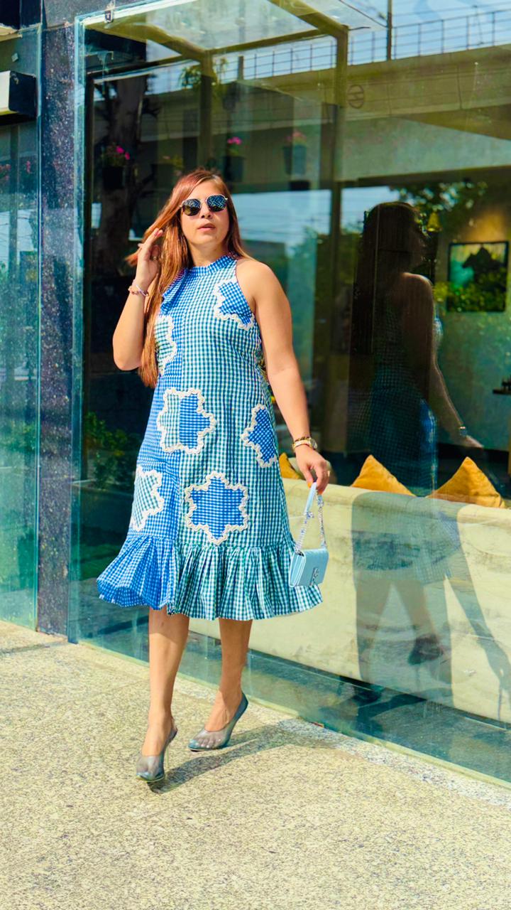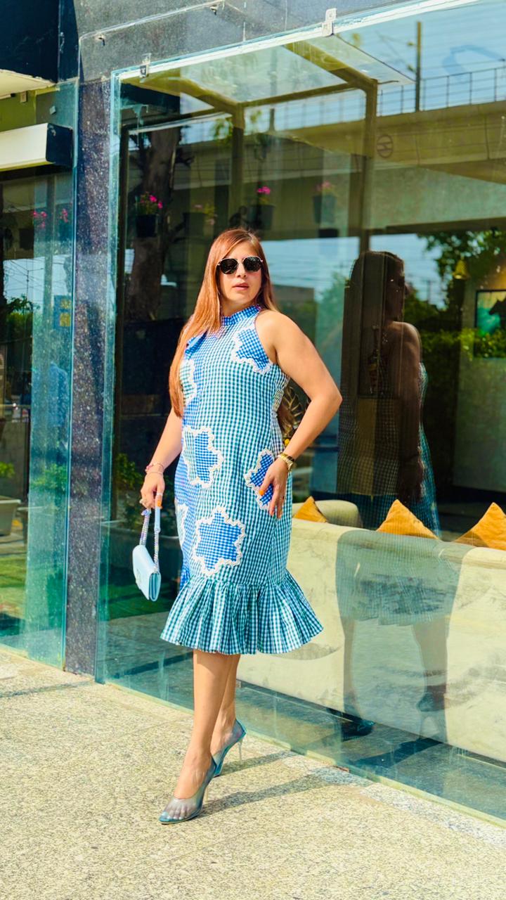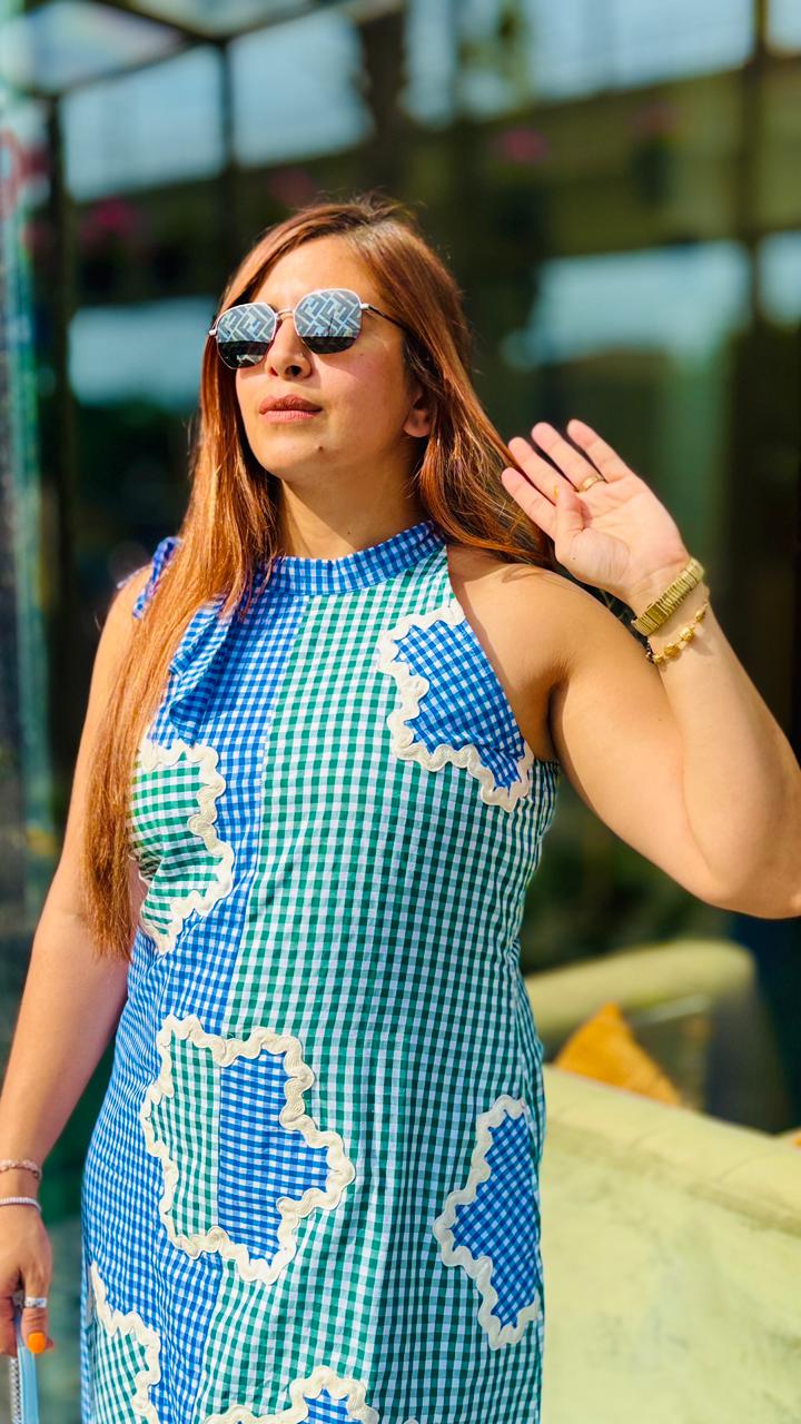 Lakhina Couture presents a refreshing blue-green midi dress crafted in breathable cotton with a soft cotton lining for all-day comfort. Designed with a full ban collar and shoulder tie-up detail, it features a sleeveless incut silhouette for a modern edge. Light, airy and effortlessly stylish—perfect for summer parties and casual elegance. |