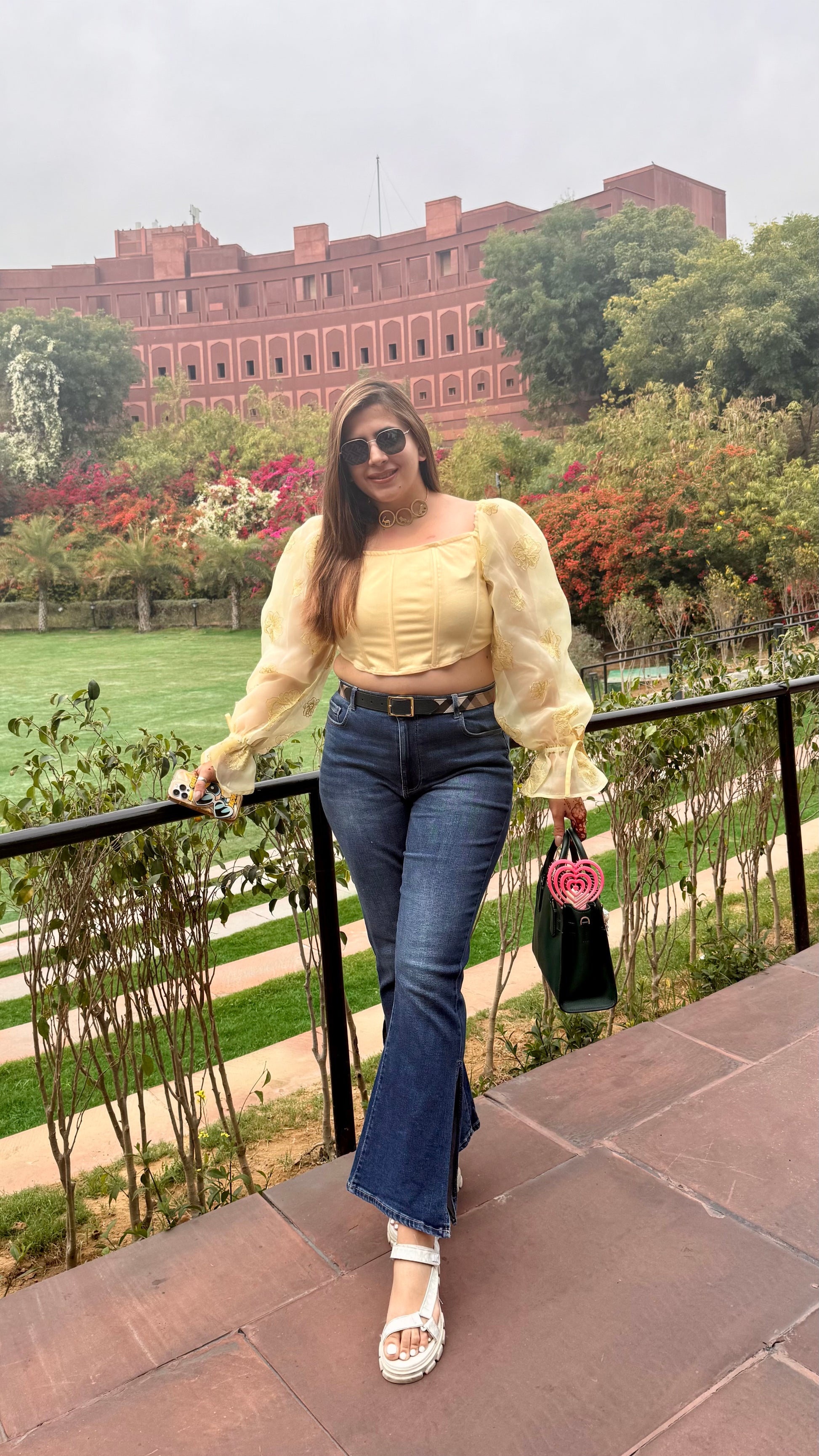 The Lemon Corset Crop Top 🍋✨ is a chic statement piece featuring a structured bodice, sheer puff sleeves with floral embroidery 🌼, and delicate tie-up details. Perfectly paired with denim for a trendy look! 💛👖 |