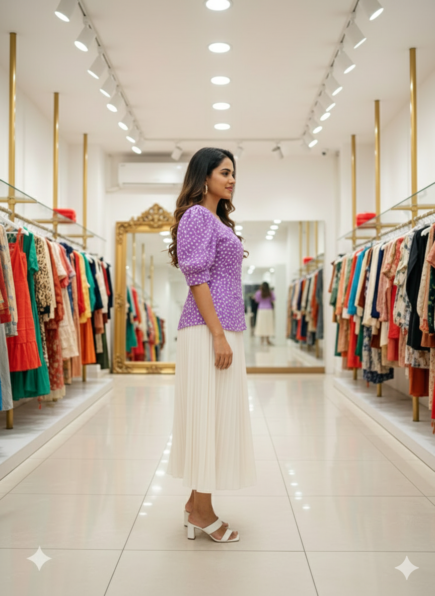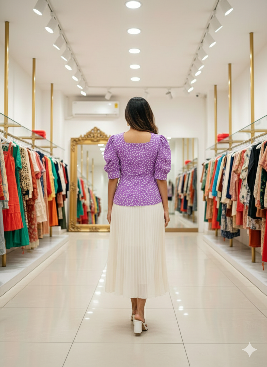 "🌸 Elevate your wardrobe with the Lilac Breeze Button-Up! This chic top features a playful print, square neckline, and puffed sleeves—perfect for adding a pop of color to your day. 🌿✨" |