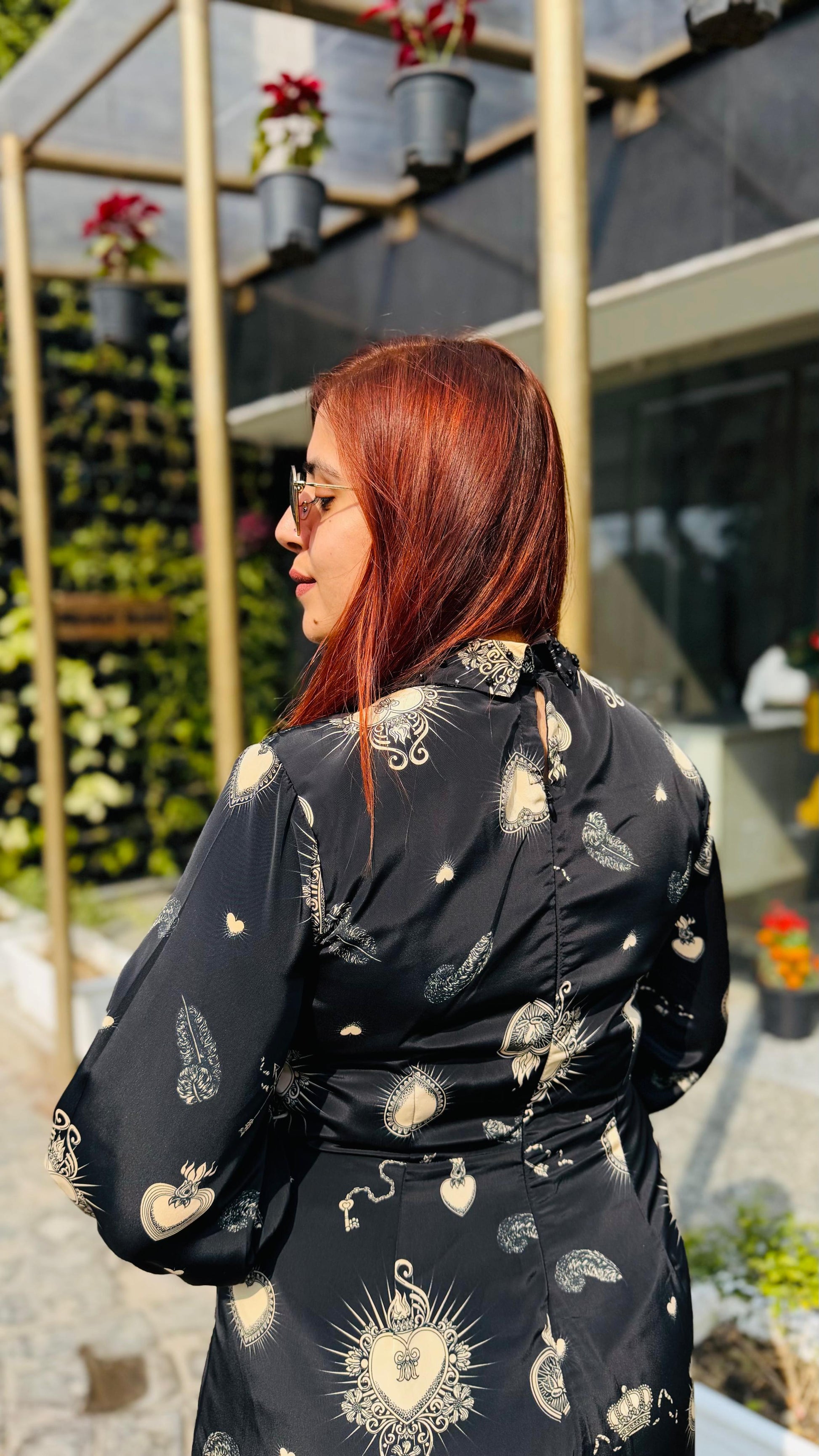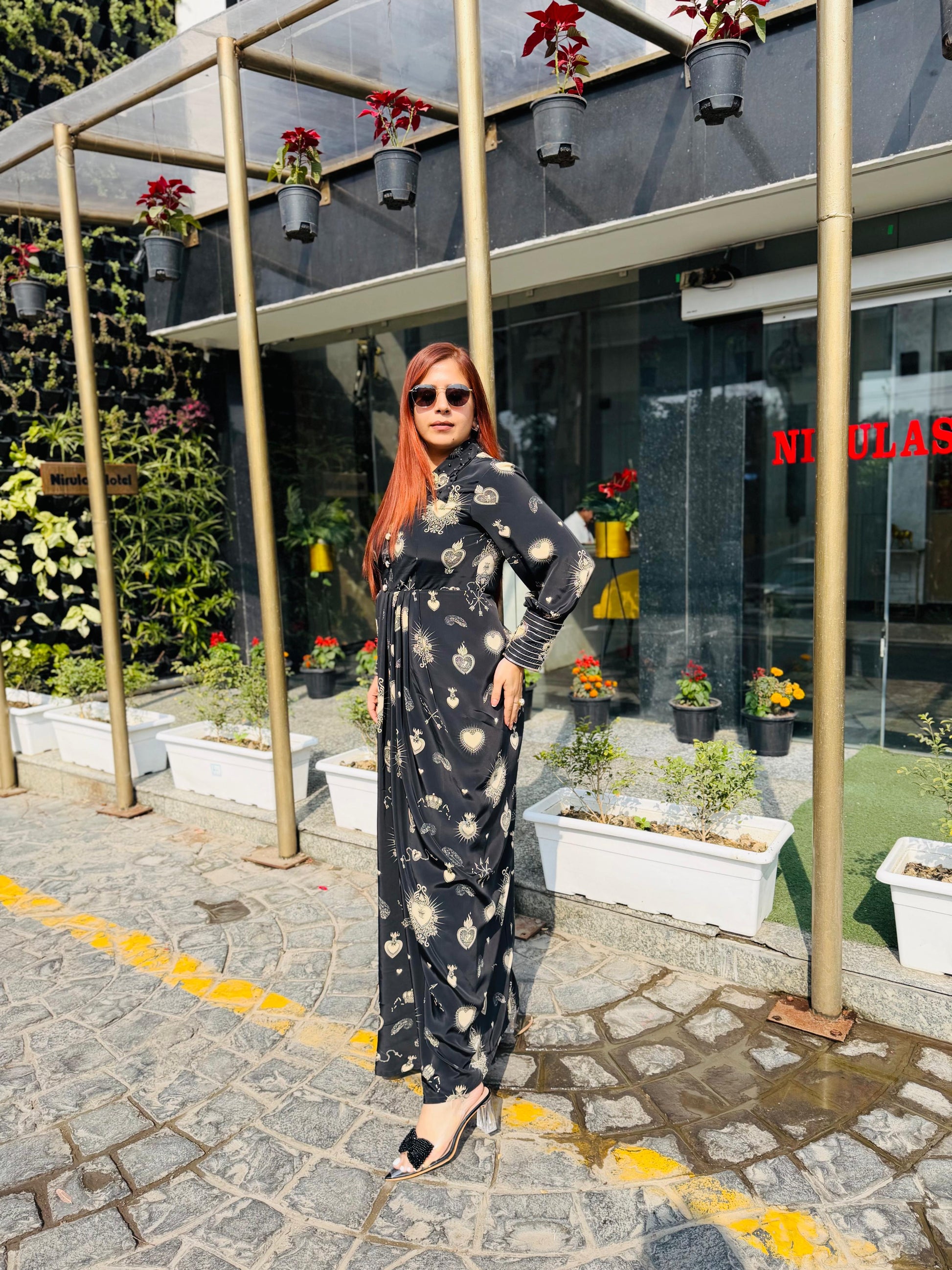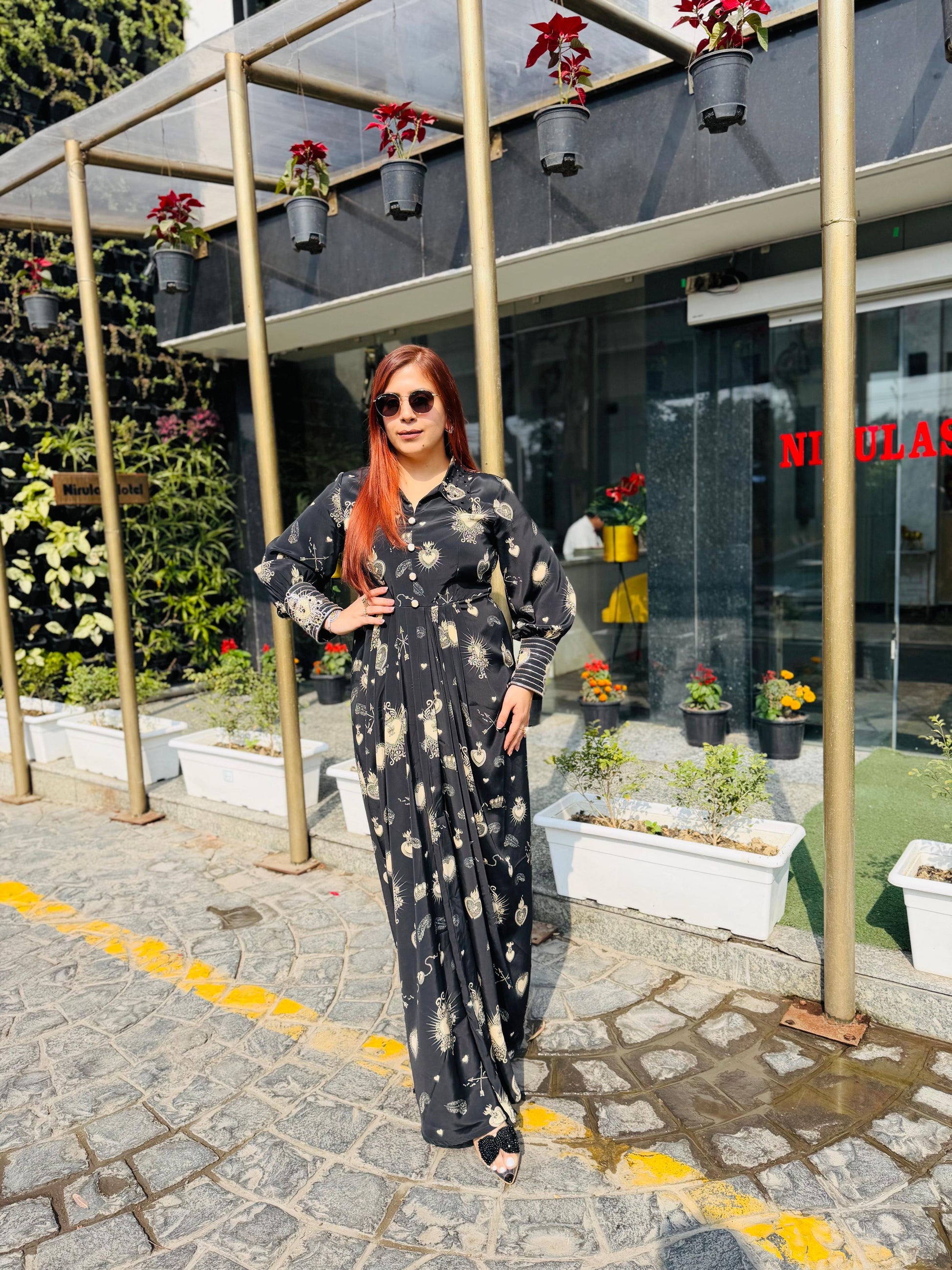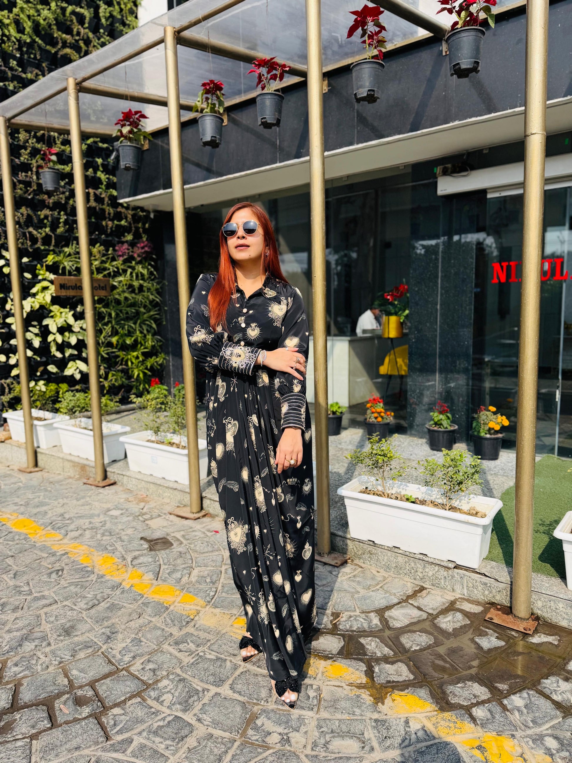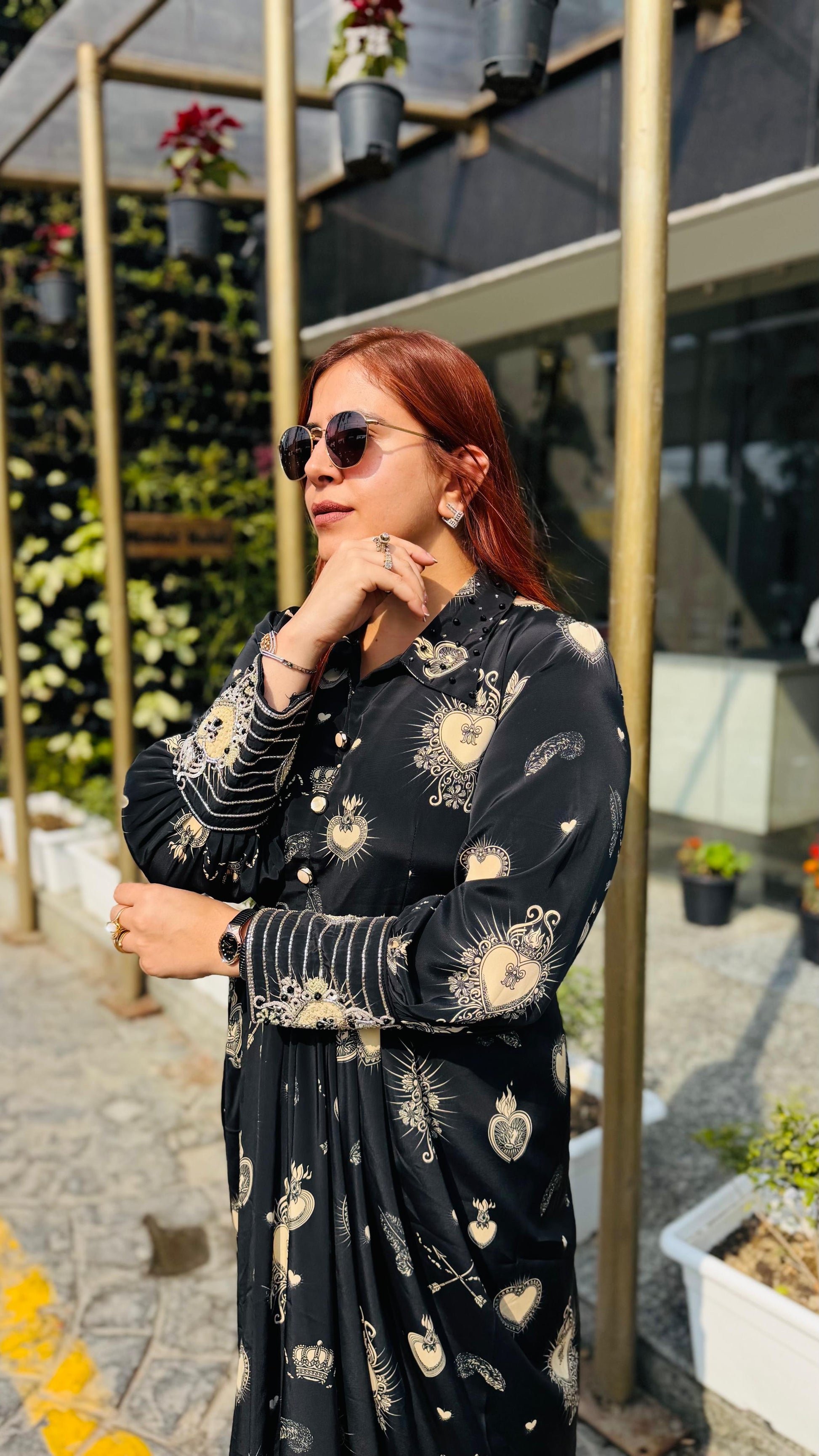 | Description | Lakhina Couture presents this elegant black satin drape, designed with a refined fall collar, structured yoke, and fluid drape detailing. Crafted for effortless everyday sophistication, it features full sleeves with statement cuffs and a tailored silhouette. Perfect for modern casual styling with a touch of luxury. |
