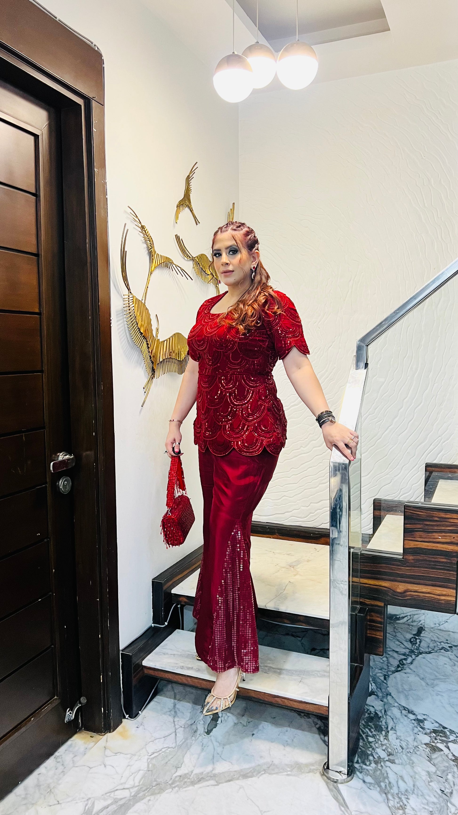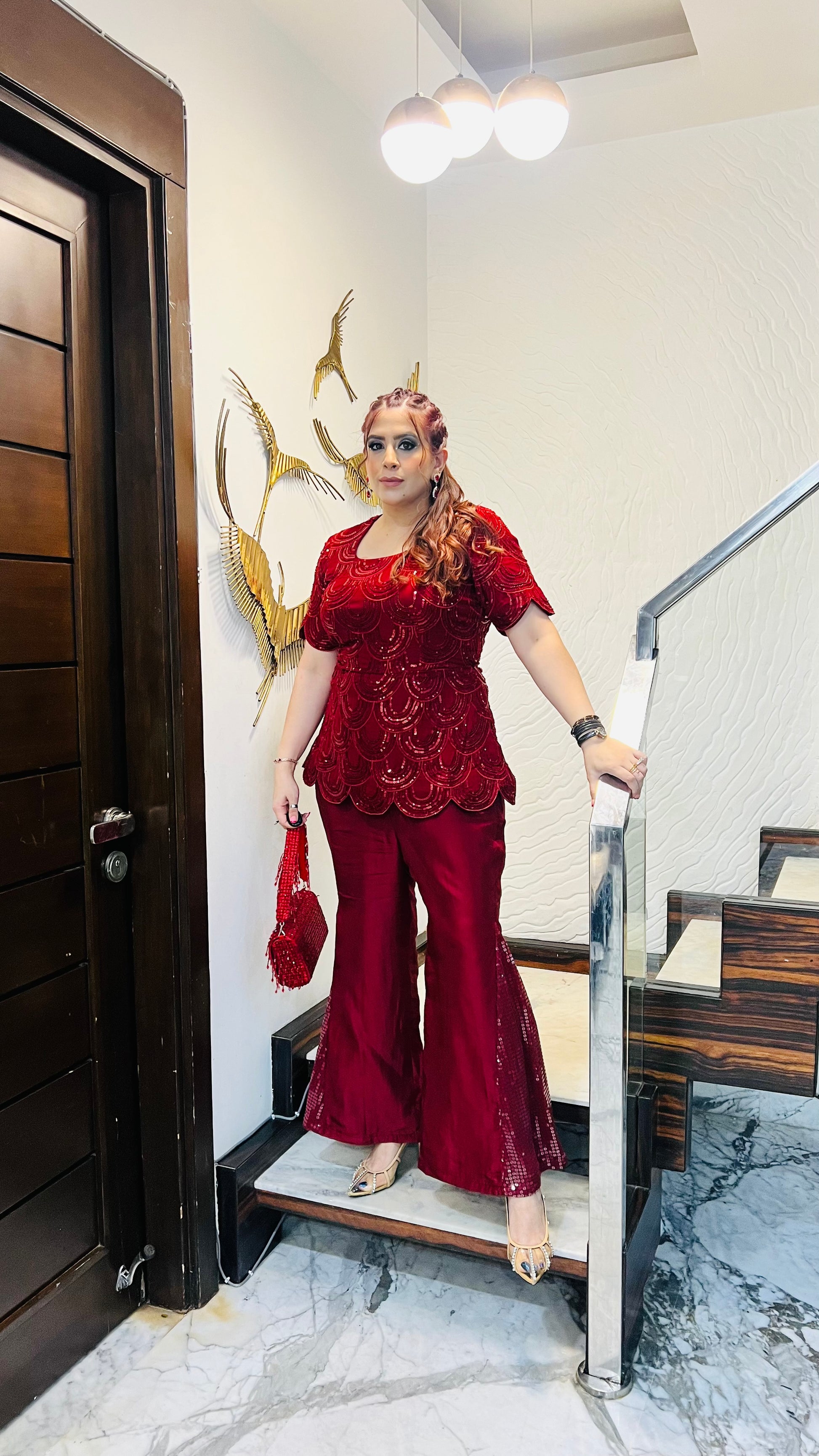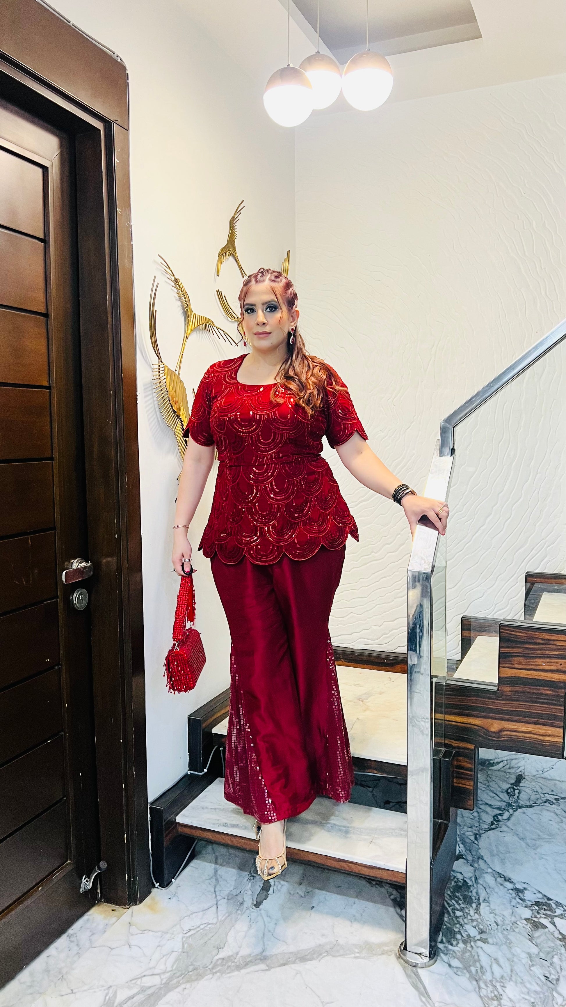 The Maroon Scallop Cocktail Co-Ord is a stunning blend of elegance and boldness💃. Featuring intricate scallop sequin details✨ and paired with flared pants, this ensemble is perfect for evening glamour🌟. |