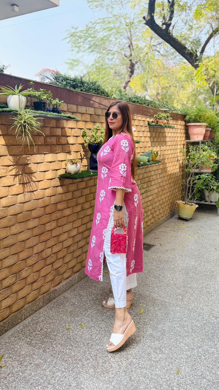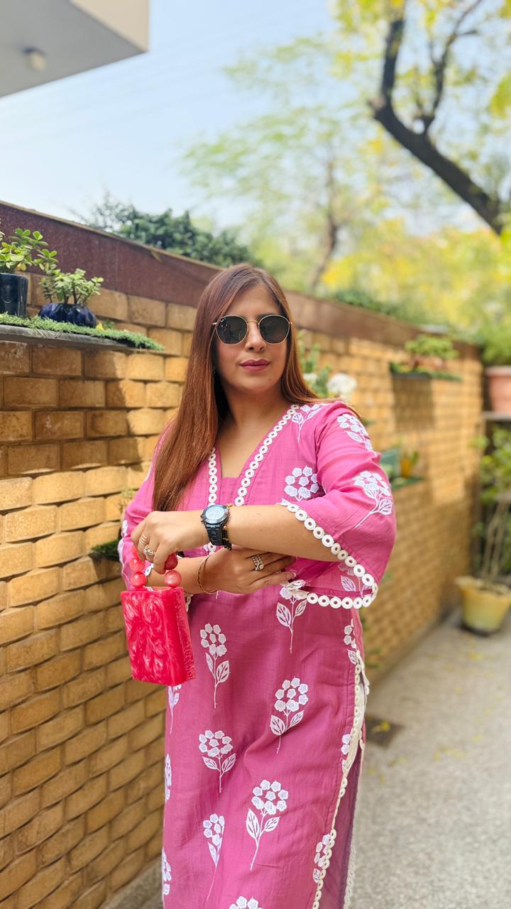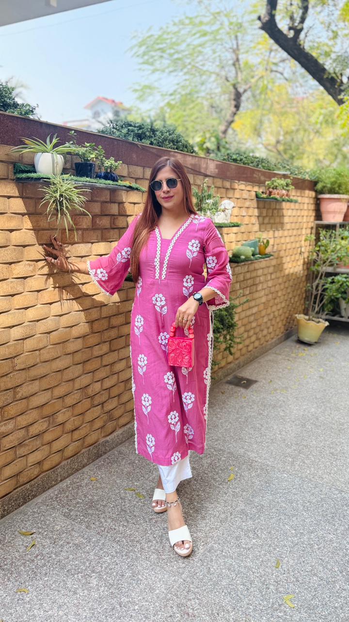 Refresh your summer wardrobe with this graceful Mauve kurti from Lakhina Couture. Crafted in breathable rayon with soft crepe lining, it keeps you cool and comfortable all day. The delicate white floral print and V-neck lace detailing add subtle elegance, while the airy 3/4 sleeves make it perfect for warm-weather styling. Lightweight, flattering, and effortlessly refined — ideal for everyday summer wear. |