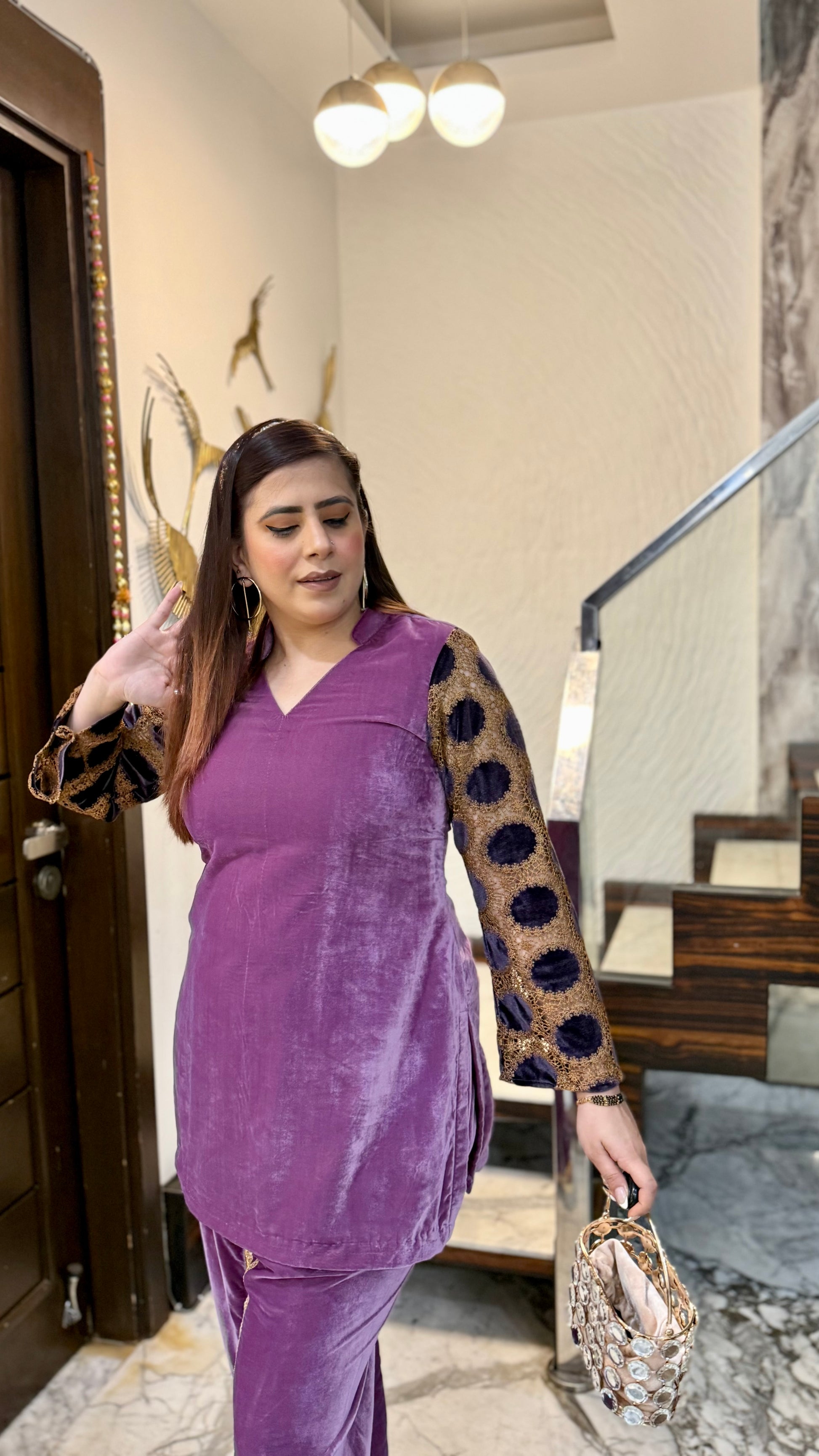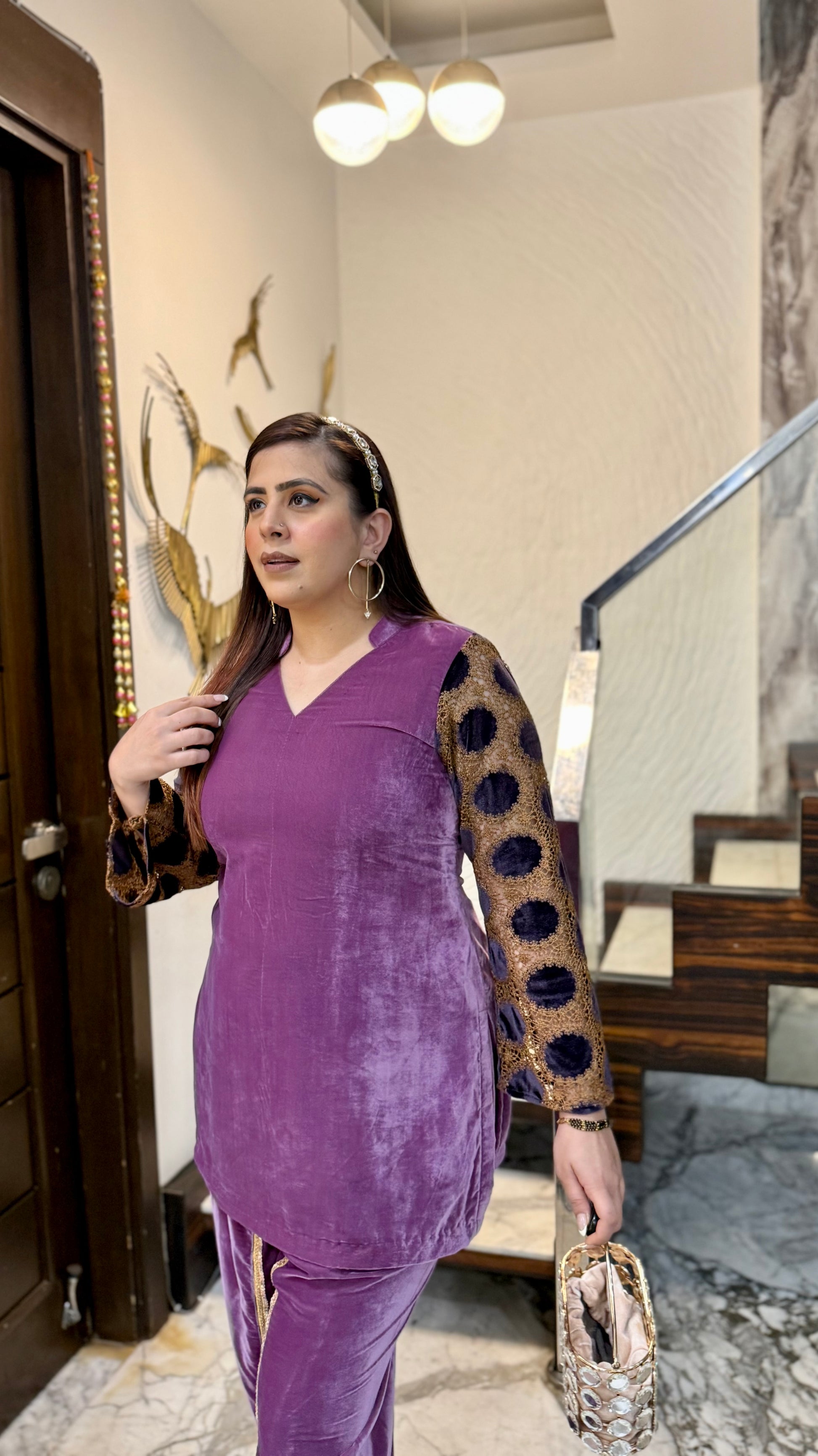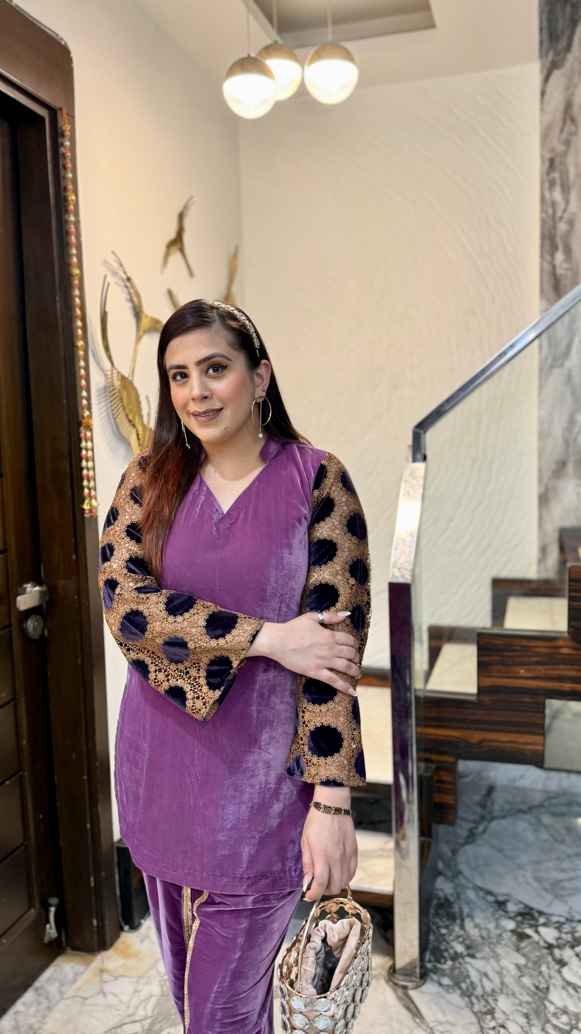 The Mauve Mesh Velvet Co-Ord is an elegant outfit featuring soft velvet fabric, sheer polka-dot sleeves, and gold detailing. Perfect for festive occasions! ✨💜 #ChicStyle #FestiveVibes |