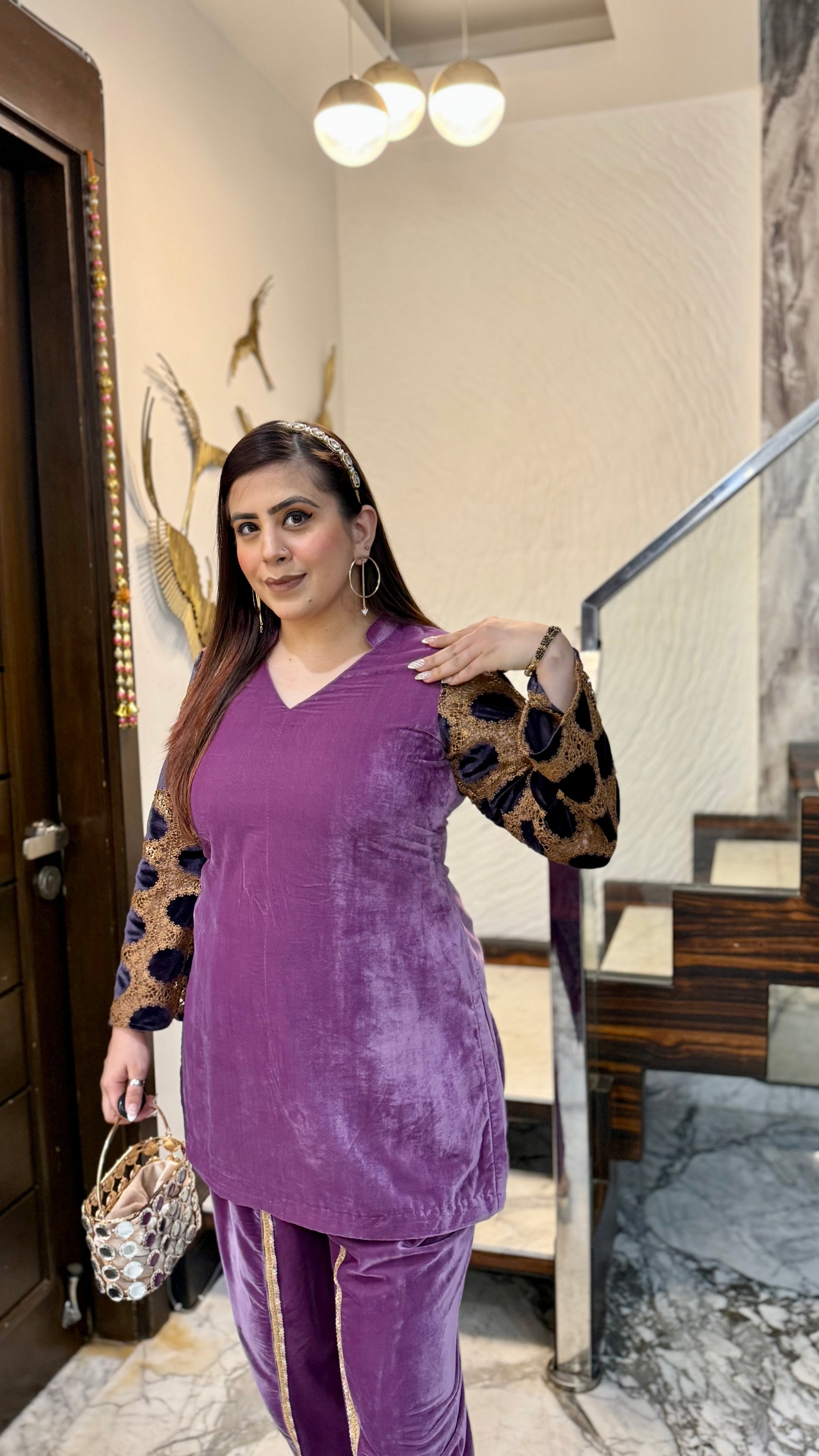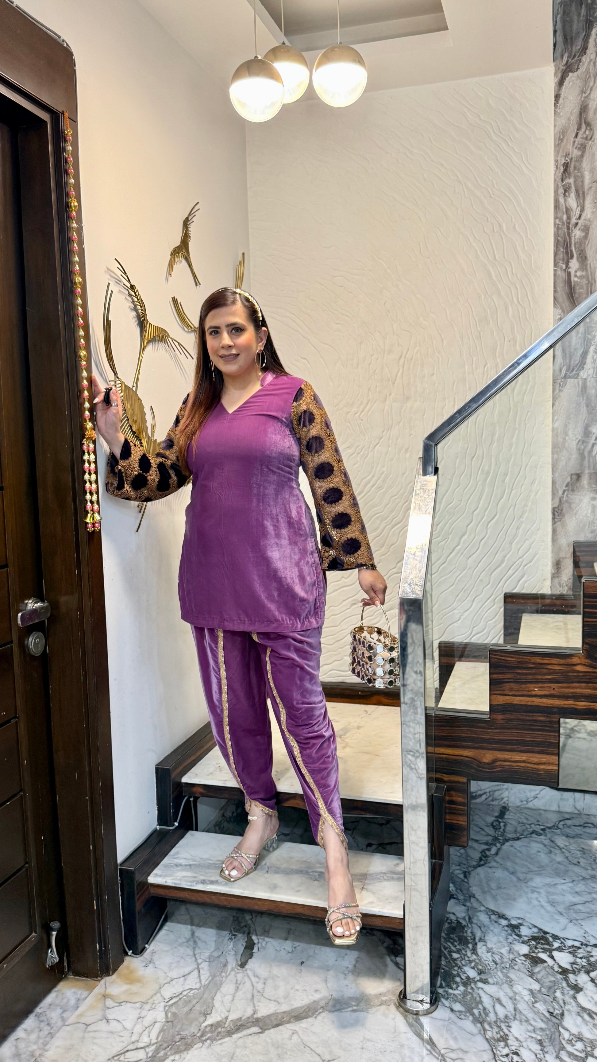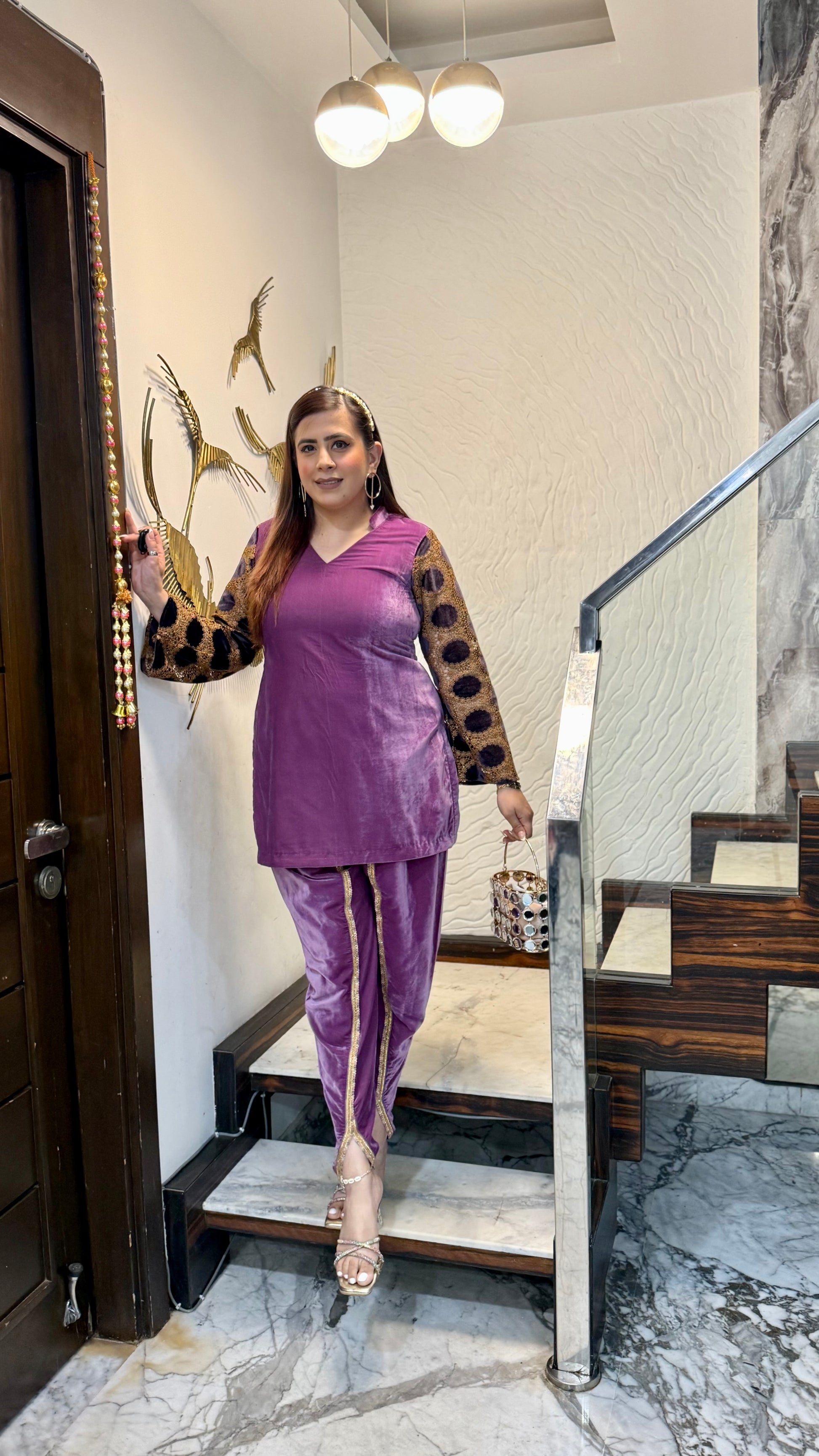 The Mauve Mesh Velvet Co-Ord is an elegant outfit featuring soft velvet fabric, sheer polka-dot sleeves, and gold detailing. Perfect for festive occasions! ✨💜 #ChicStyle #FestiveVibes |