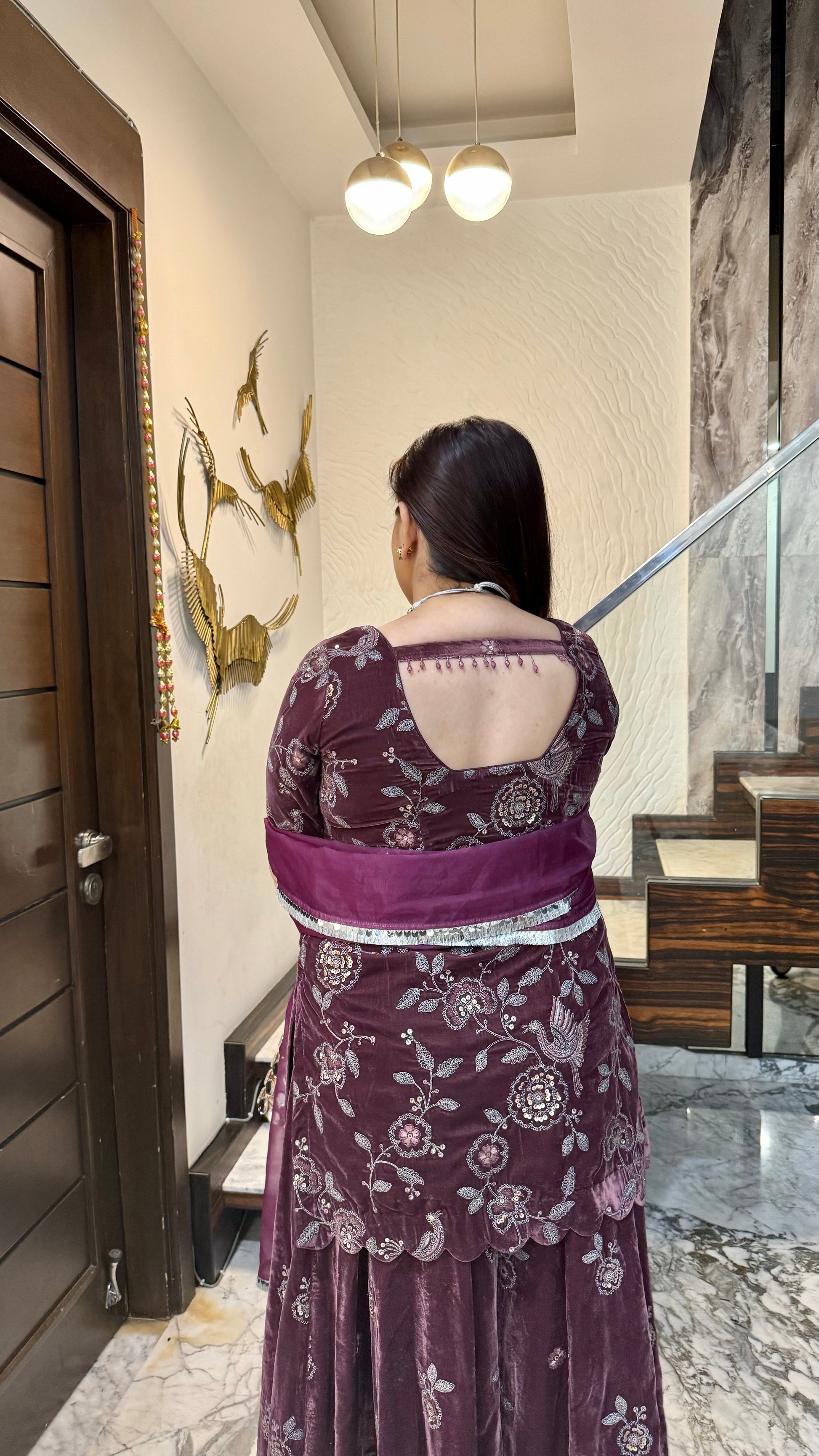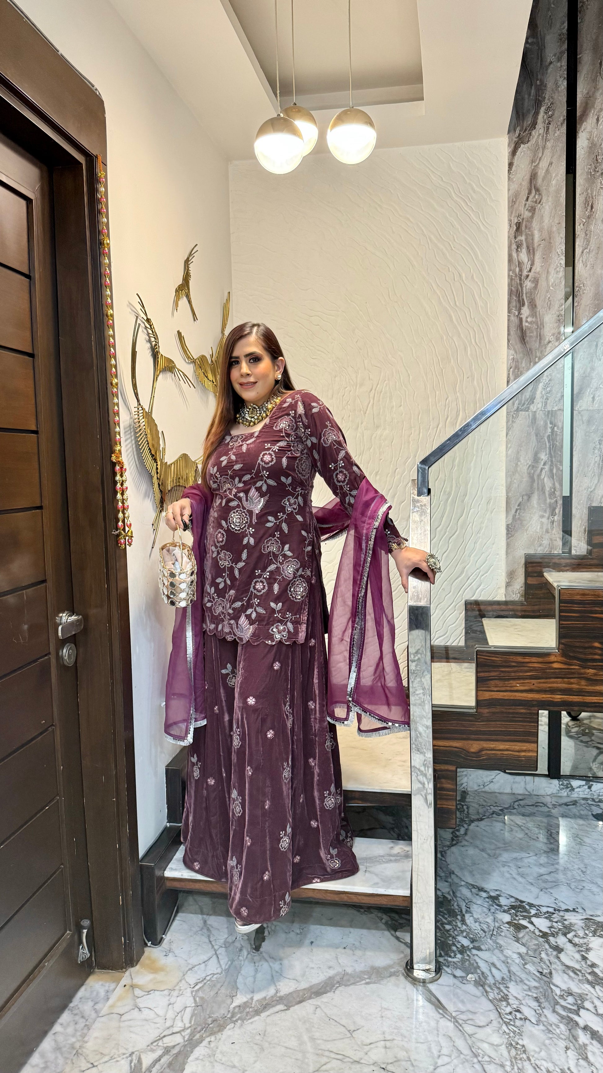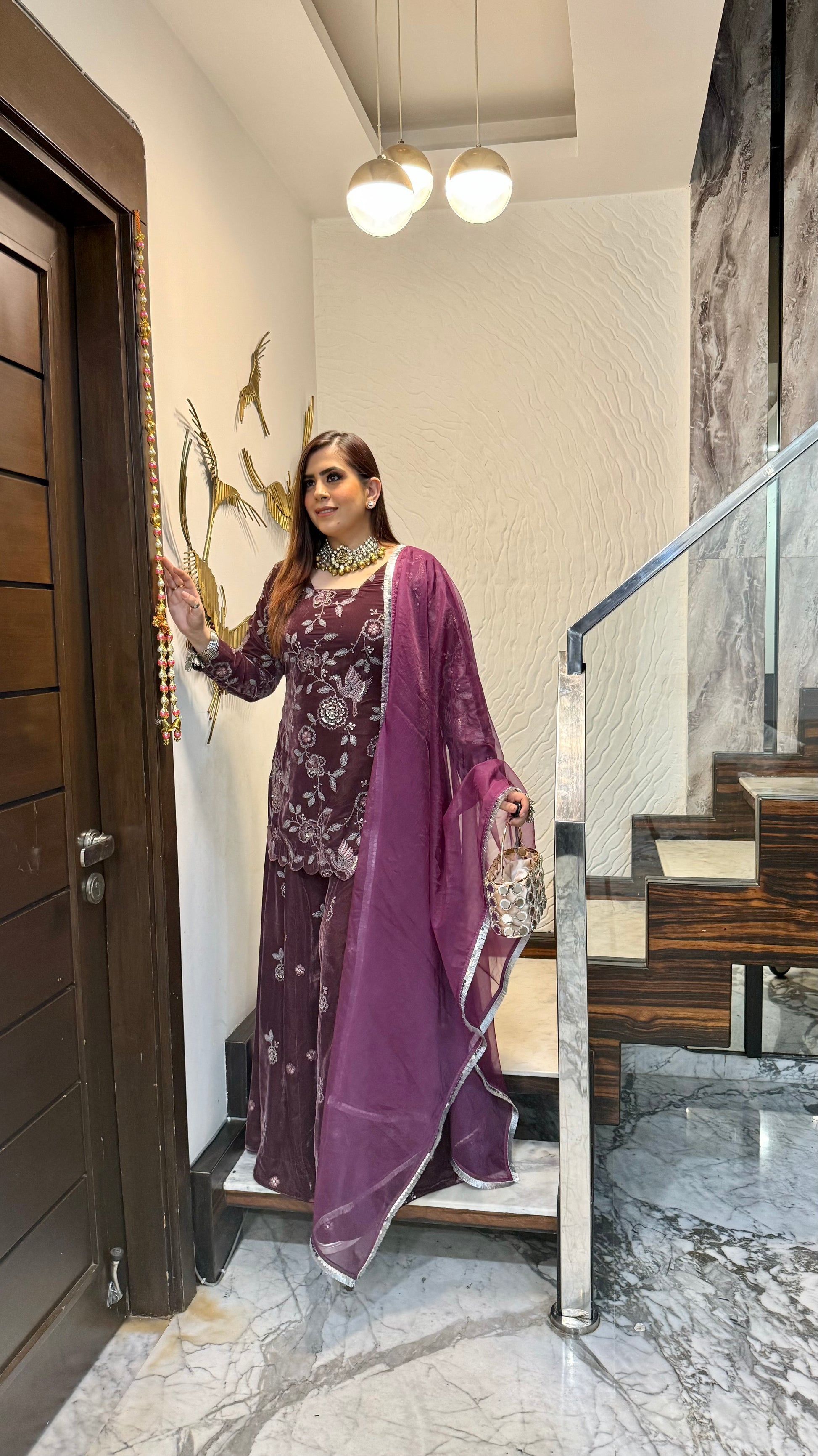 This Mauve story Sharara suit features intricate floral embroidery, a flowy dupatta with silver edging, and a glamorous silhouette. Perfect for festive evenings, it radiates elegance and charm. 🖤✨🌸 |
