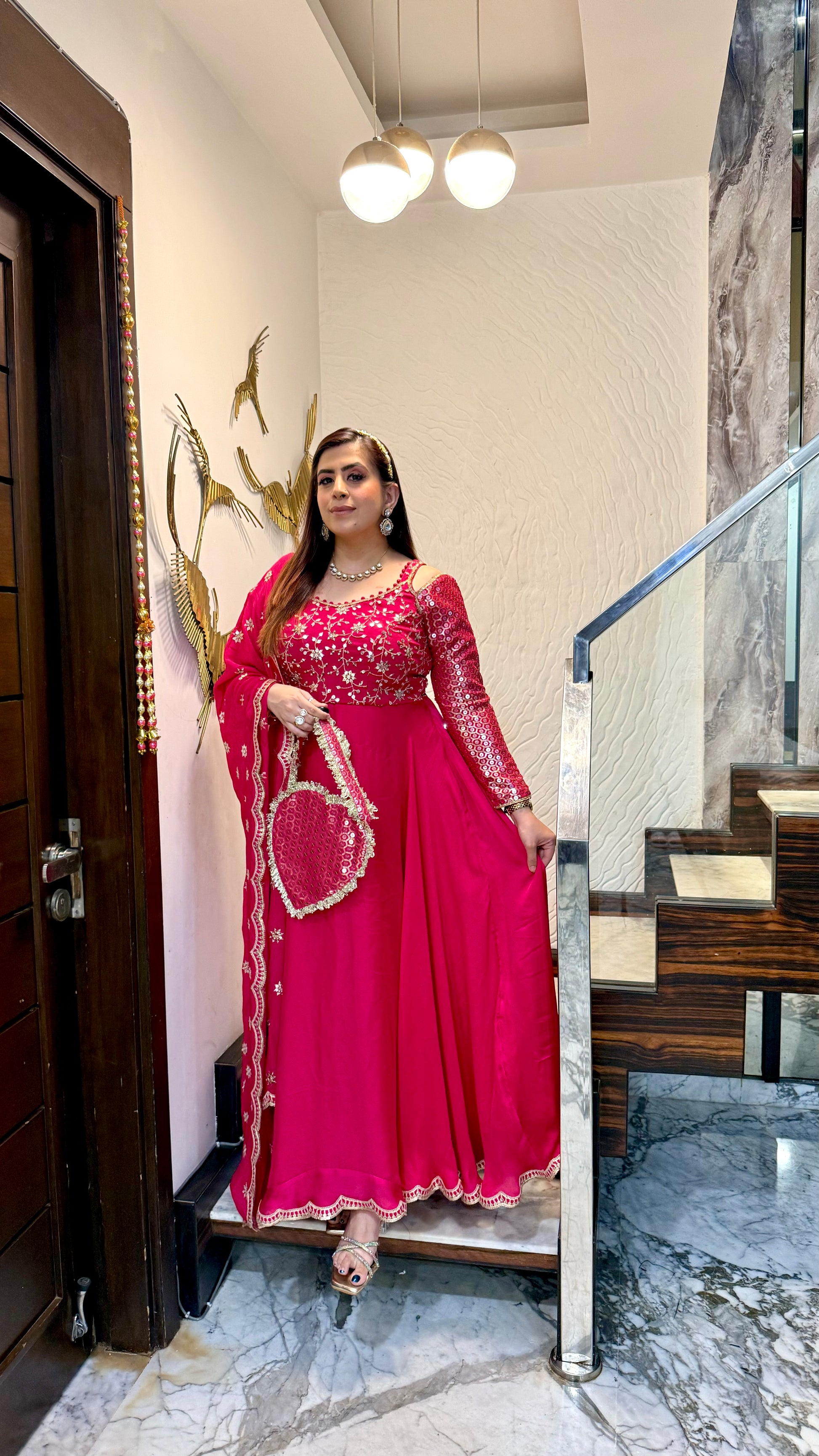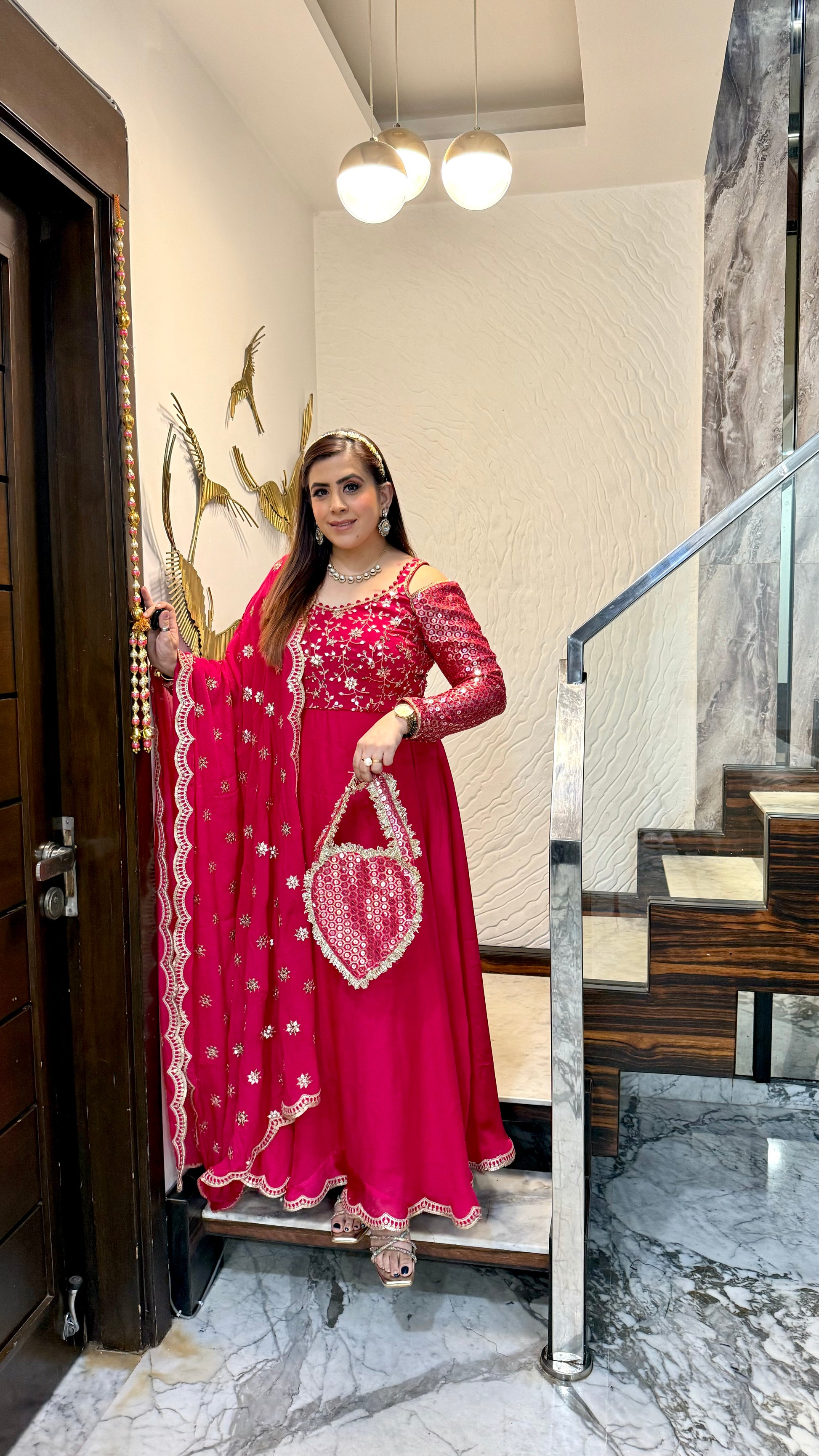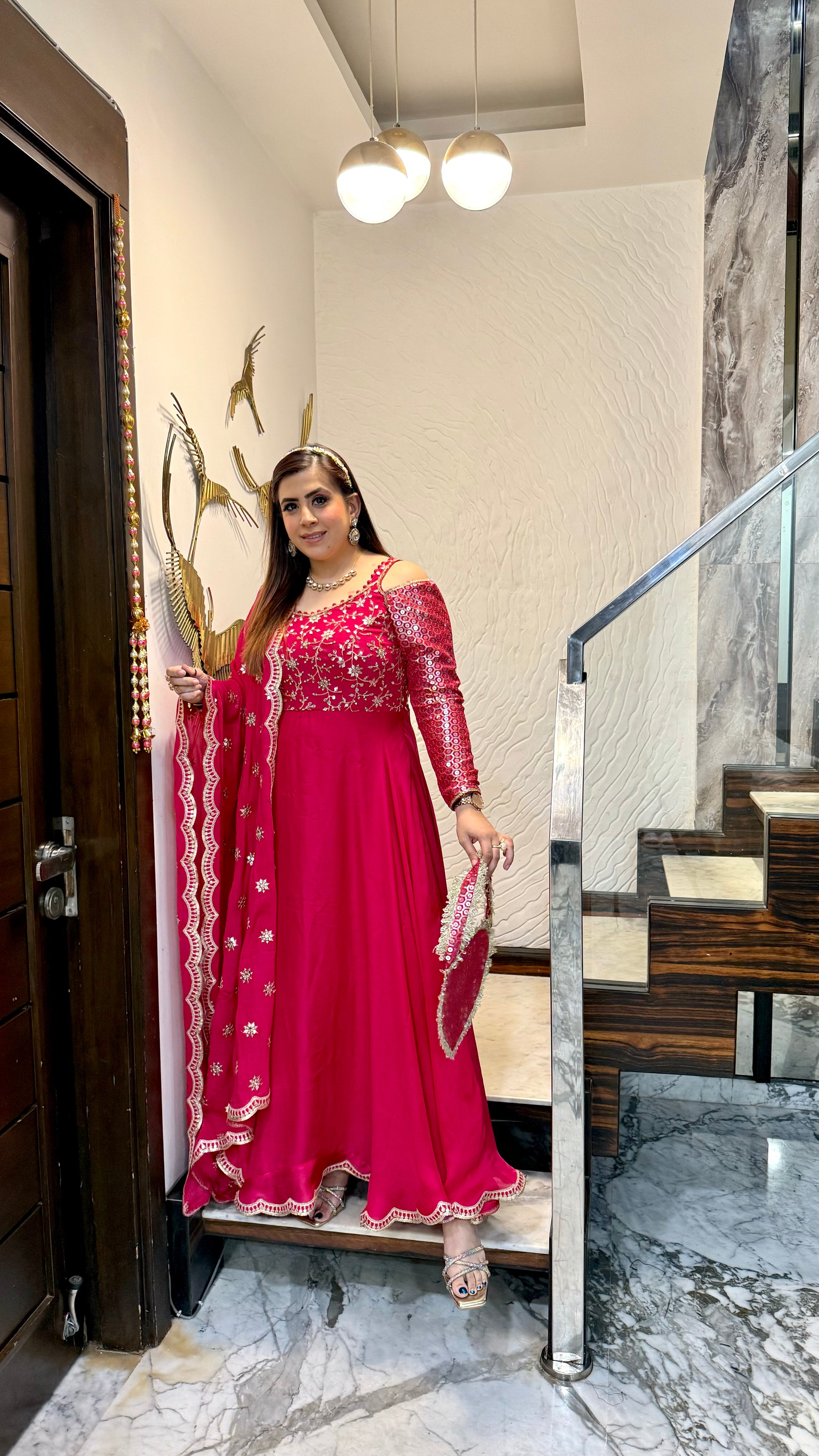 The MBM Karva Chauth Anarkali is a stunning red outfit adorned with intricate golden embroidery 🌟. Featuring an elegant dupatta with floral motifs 🌸, it's perfect for festive celebrations 🎉. |