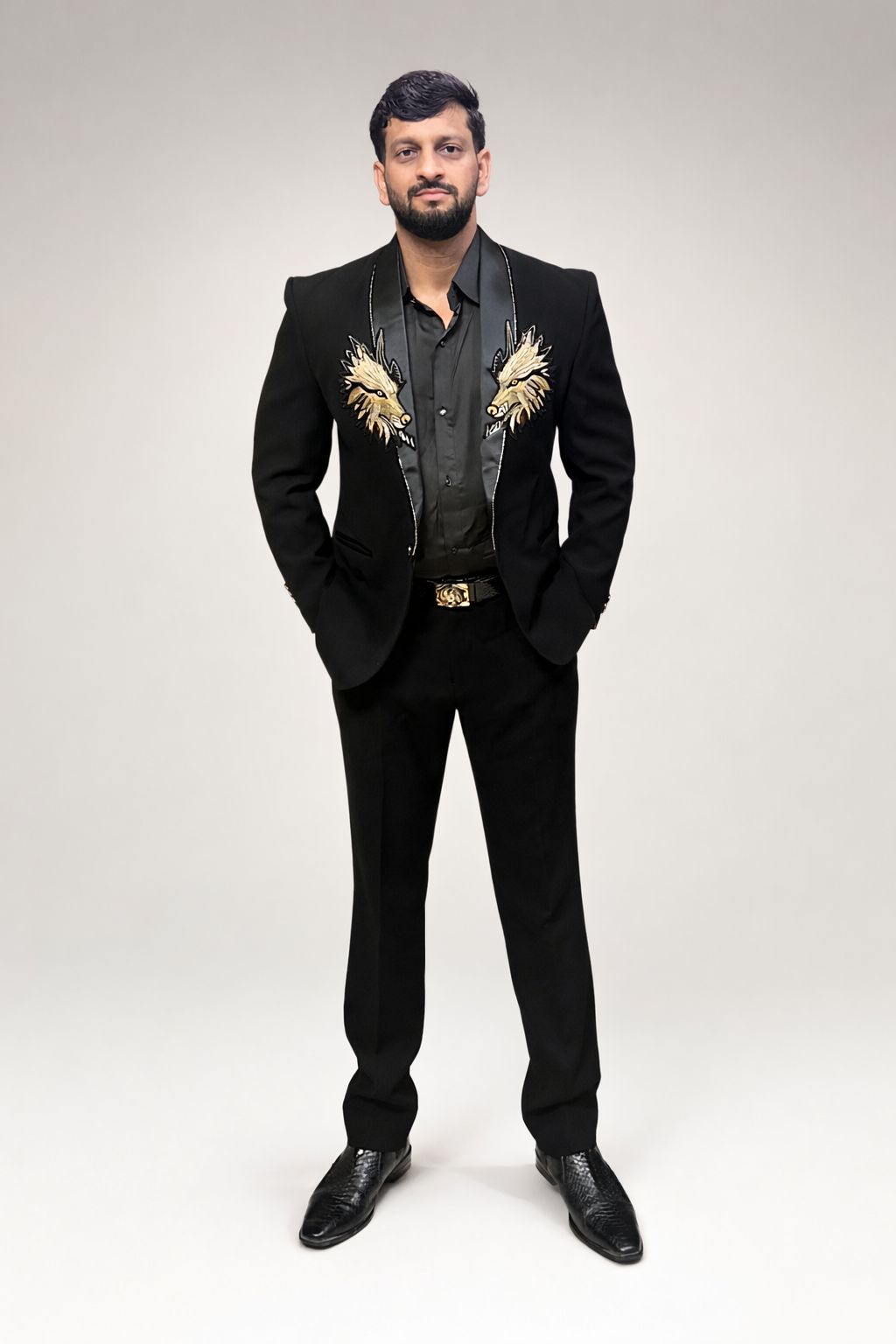 Make a powerful statement with this premium black coat-pant suit from Lakhina Couture, crafted in high-quality Japanese Lycra for a sharp and refined fit. Featuring bold hand-embroidered dragon patch on the blazer, this suit blends classic tailoring with artistic luxury. Designed for men who value confidence, elegance, and standout style