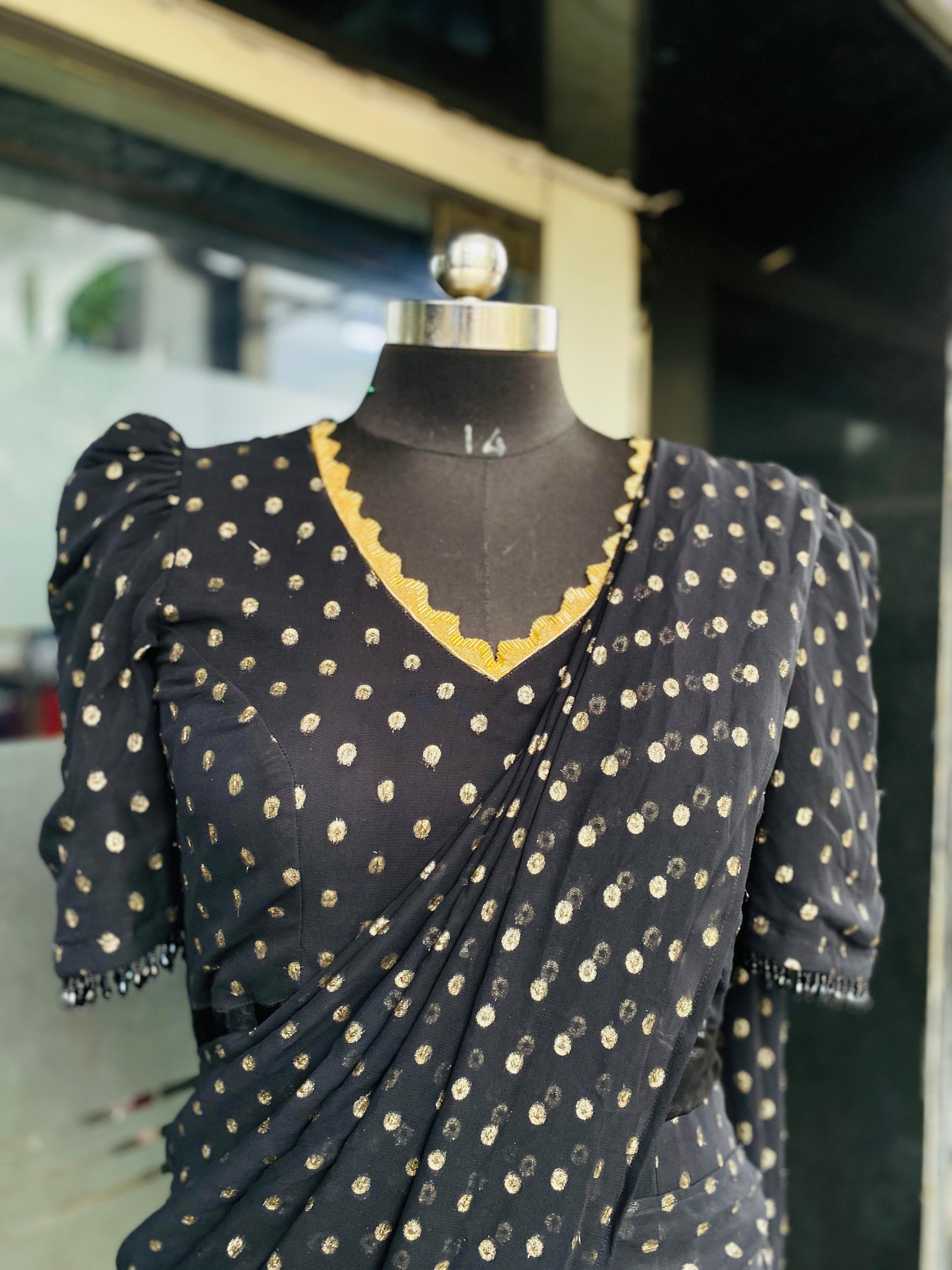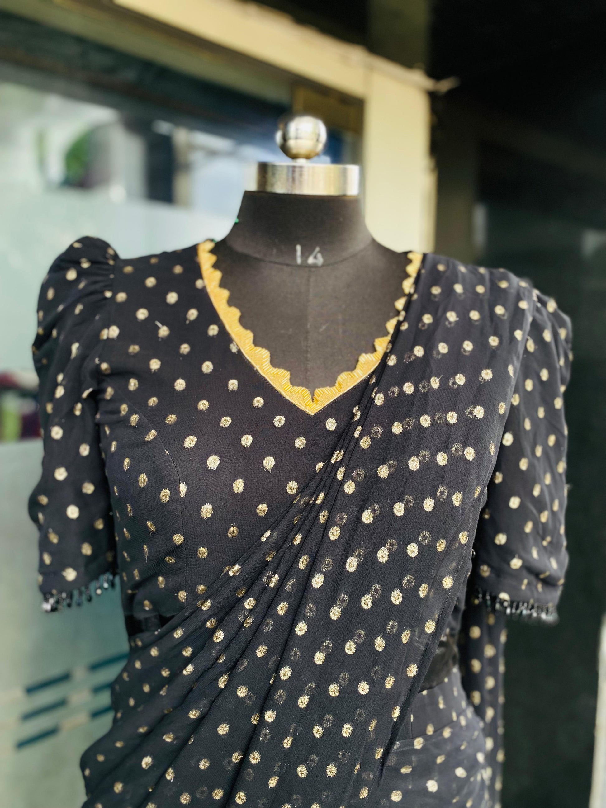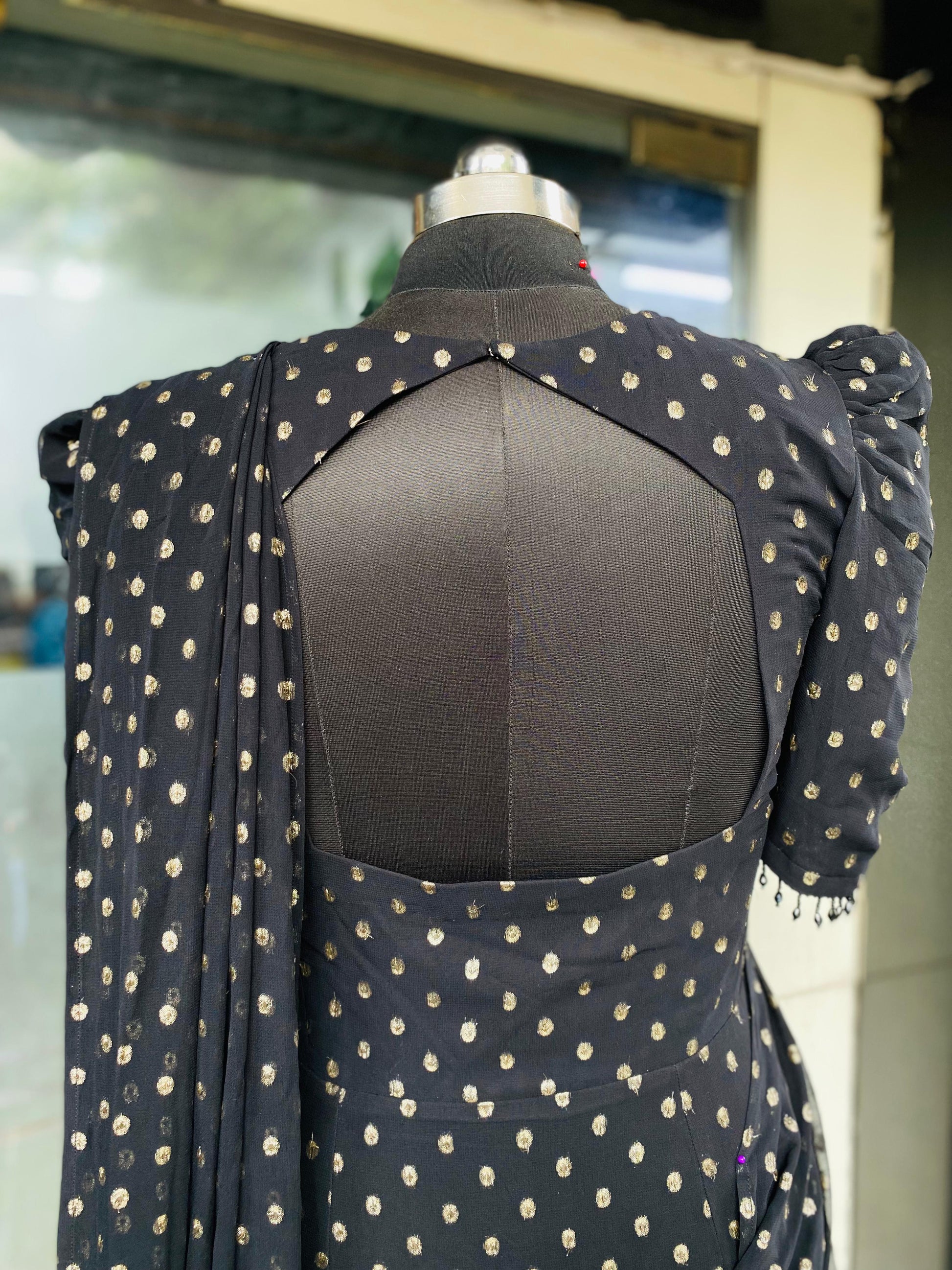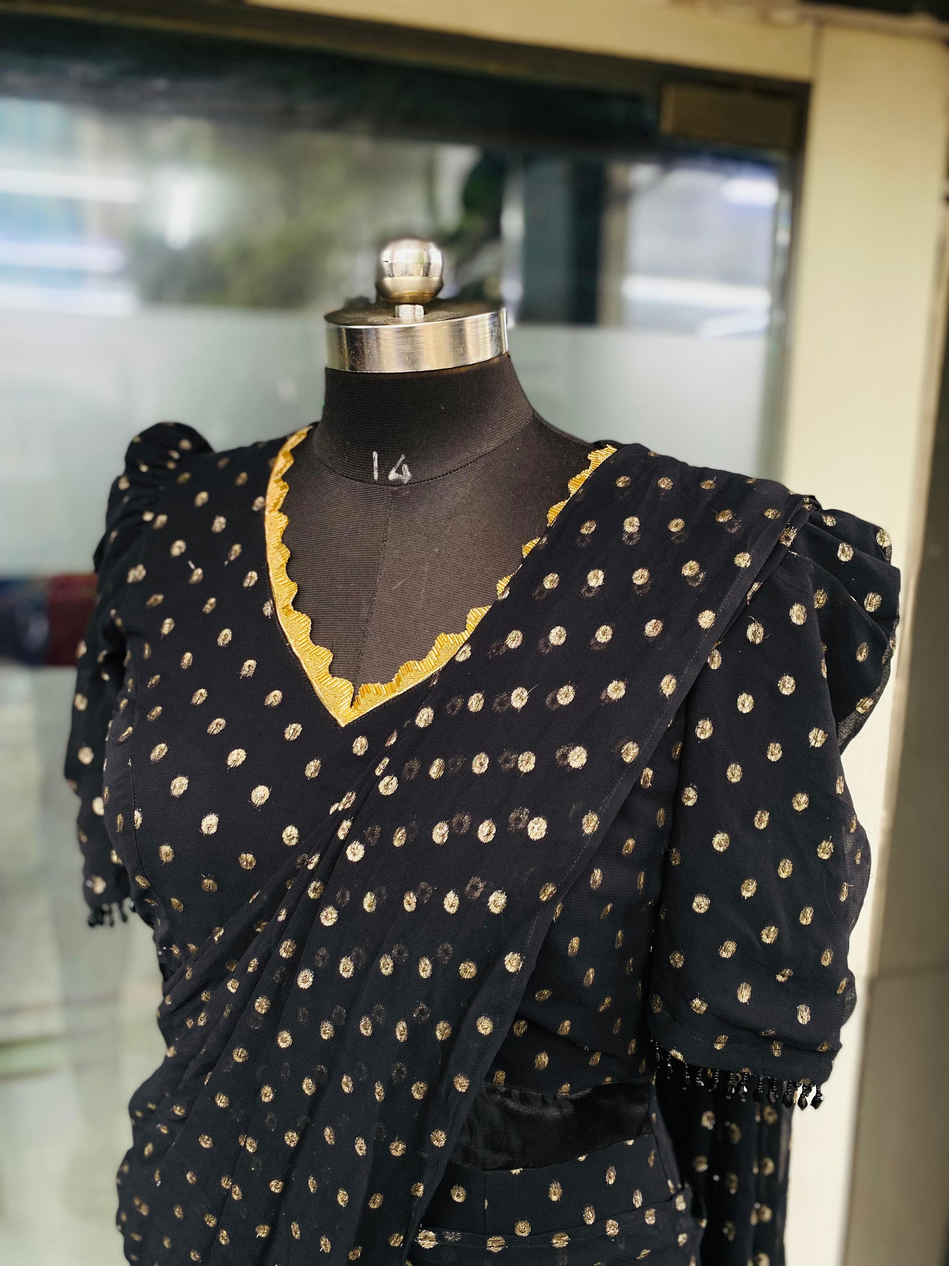 This Green Lurex Maxi Saree features a modern, sleek draped style with golden stripes and a ruffled bottom. Perfect for festive events, it blends elegance with contemporary flair. 💚✨ #ChicDrapes |