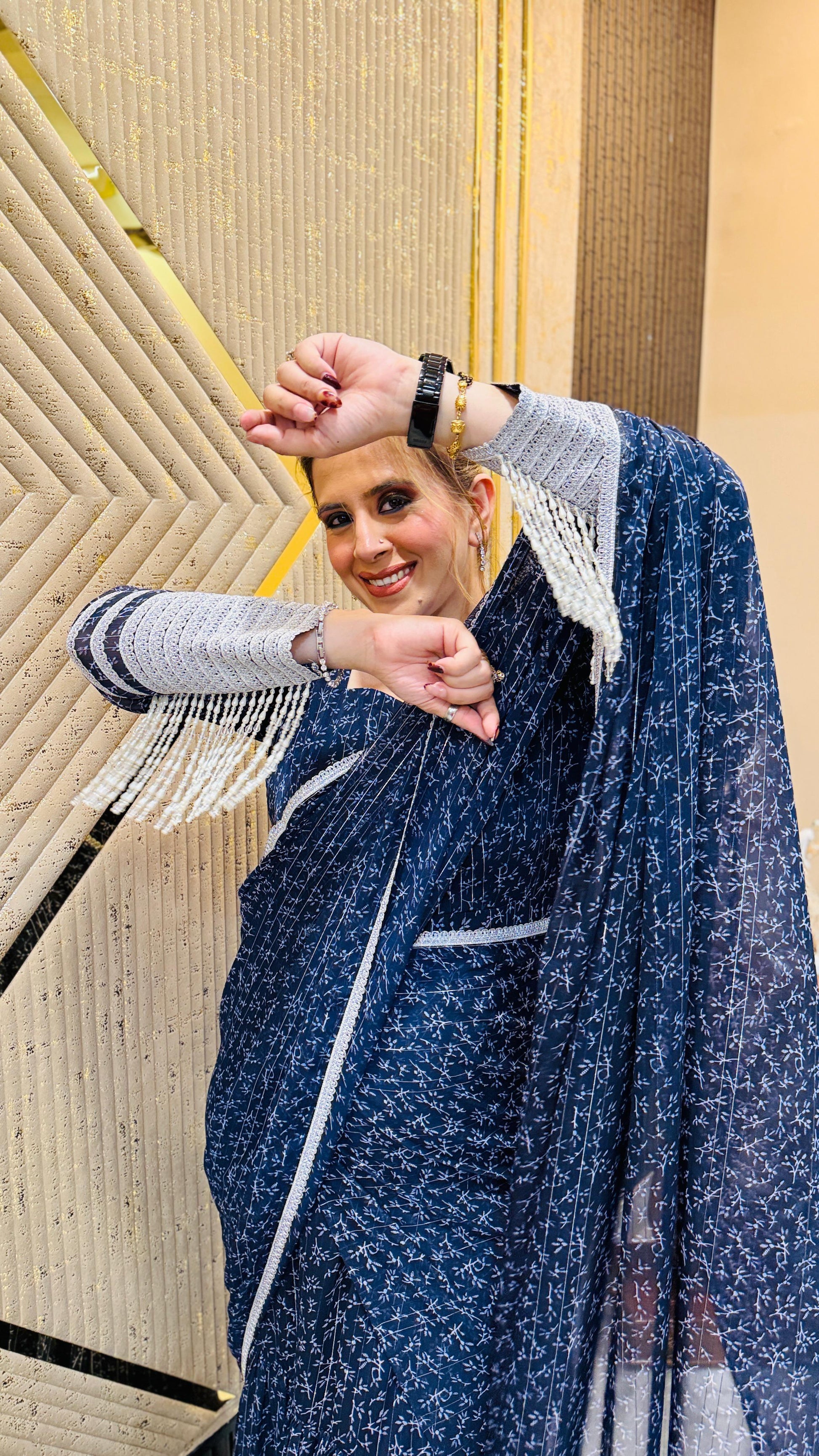 Midnight Maxi Saree 🌌✨ crafted in deep navy with delicate star-like prints 🌟, silver embellished sleeves 💎, and pleated elegance 👗. Paired with statement jewelry 💍 and white heels 👠 for timeless charm. |