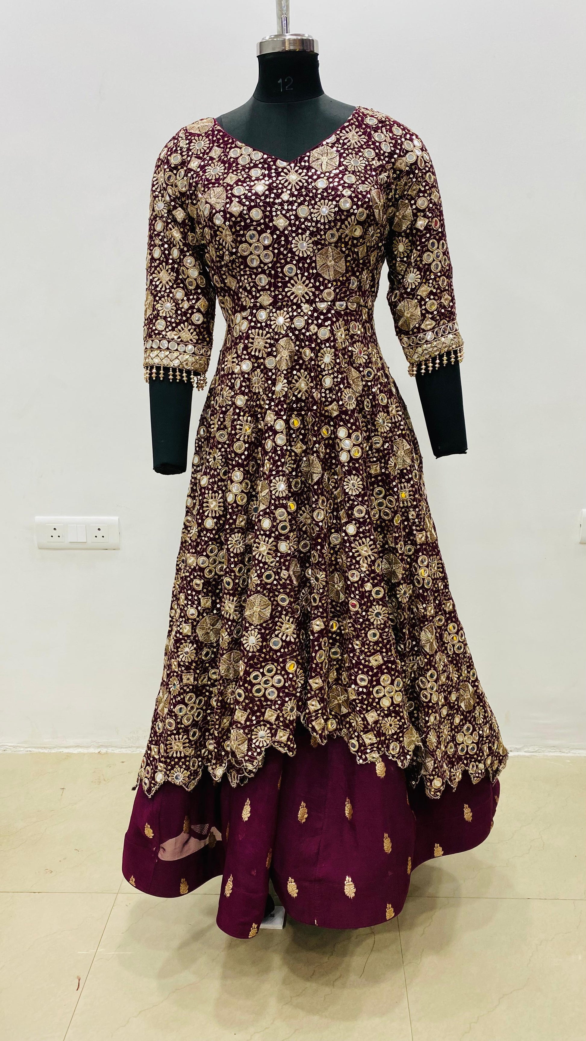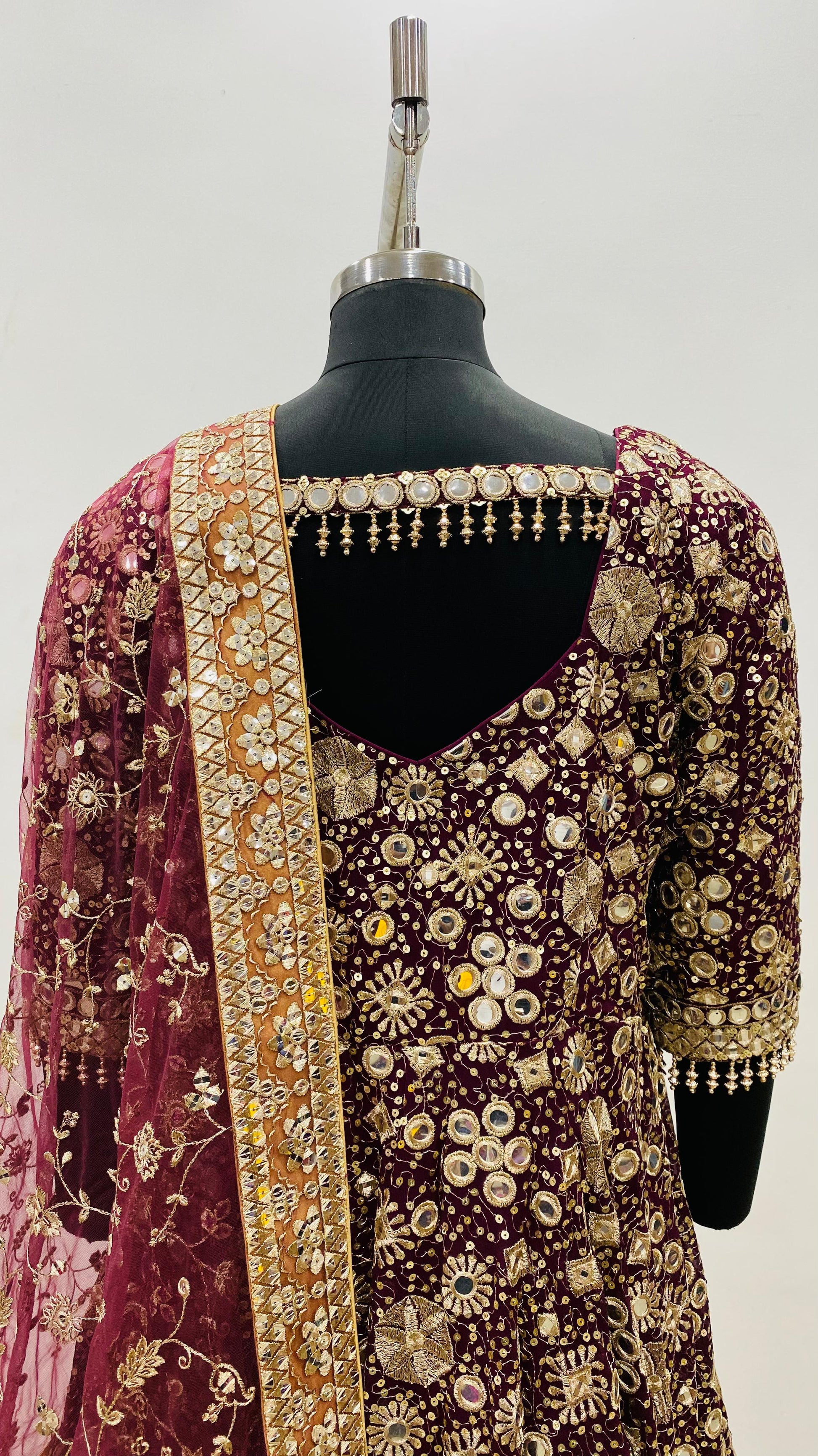 Radiate elegance with this deep wine lehenga 🍇, adorned in intricate mirror work and floral embroidery ✨. The rich detailing on the blouse and dupatta adds a regal, timeless charm! 👑 |