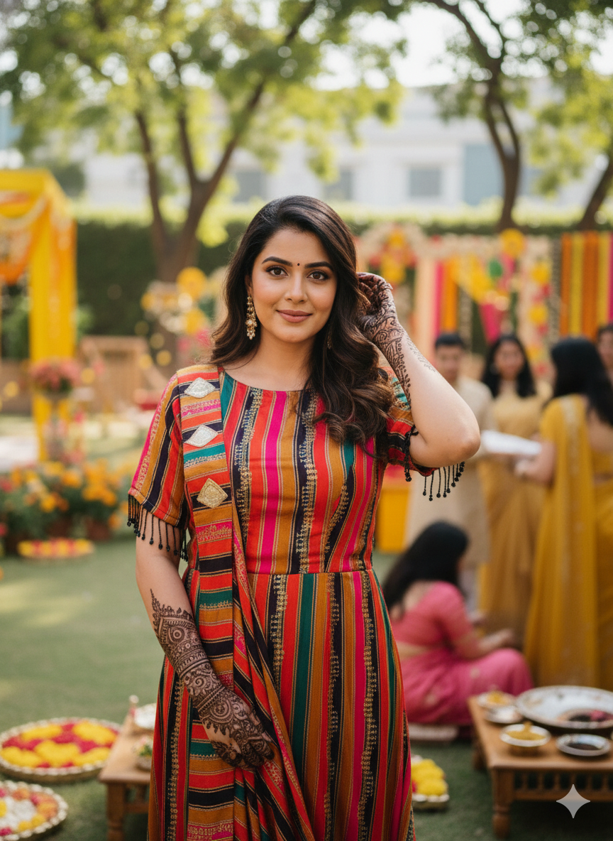 Vibrant Multicolour Stripes Drape 🌈✨ featuring bold hues of red, green, orange & yellow with artistic drape detailing. Adorned with shell embellishments 🐚 and playful tassel sleeves 💃—perfect for festive flair! |