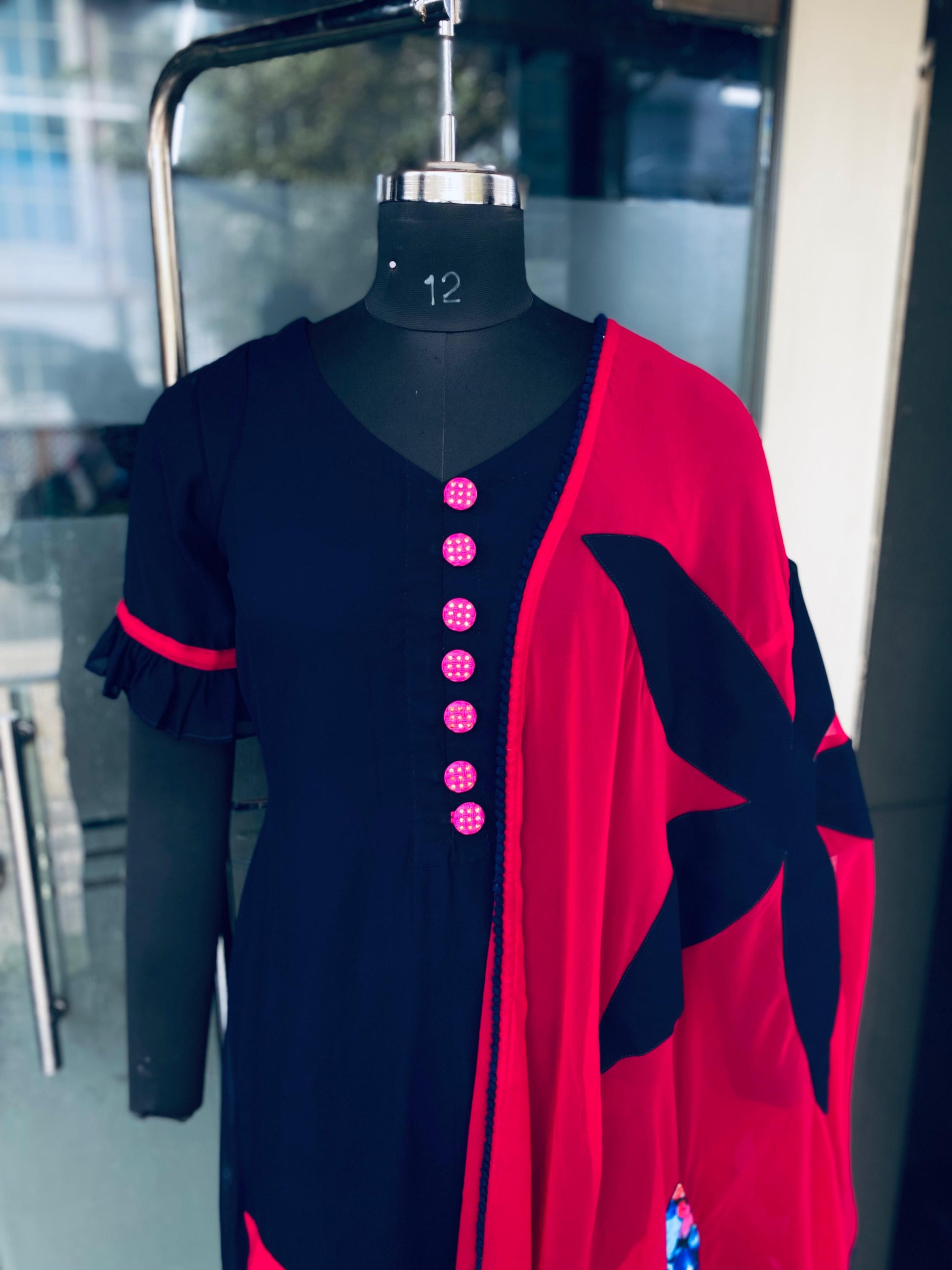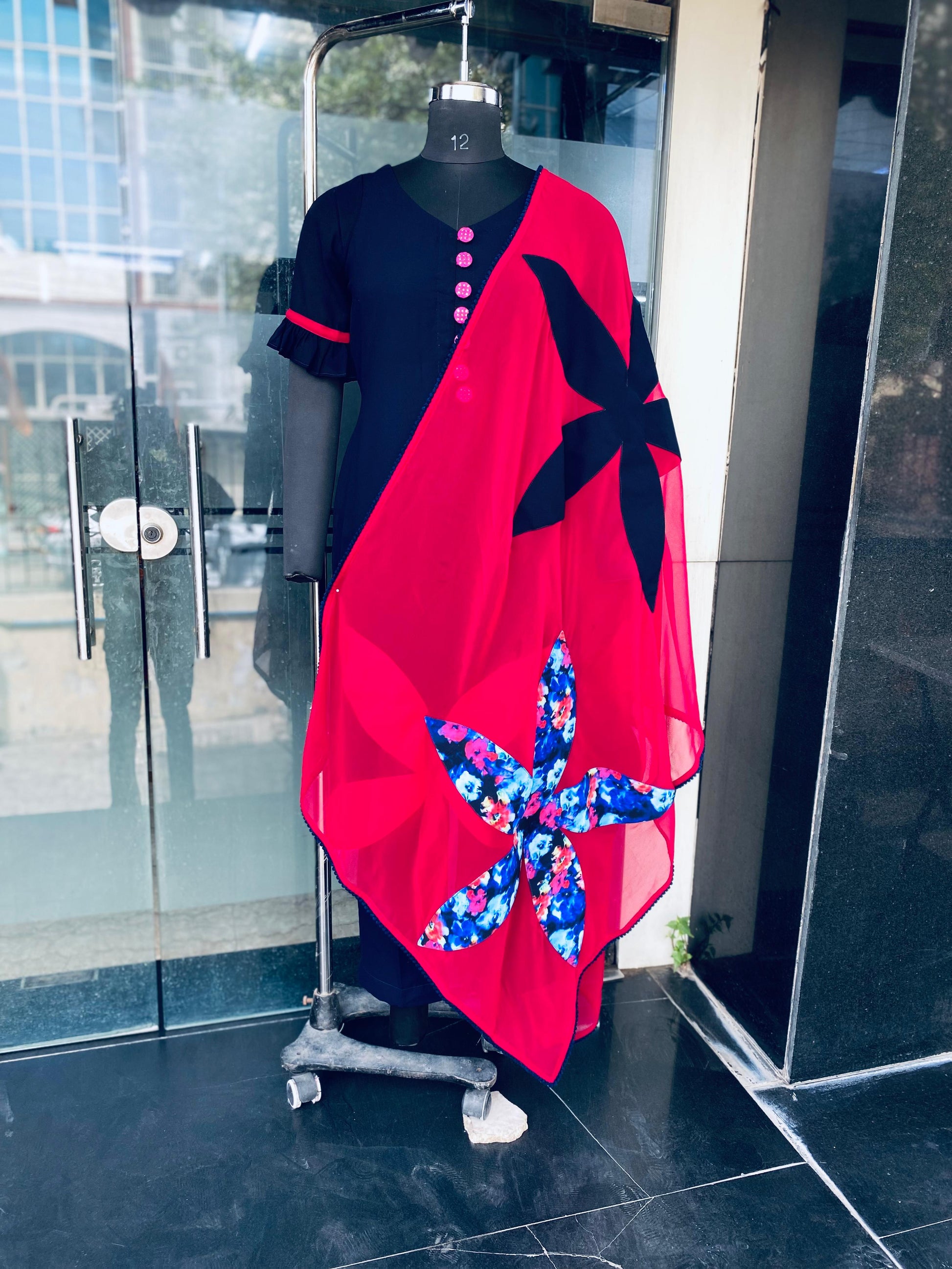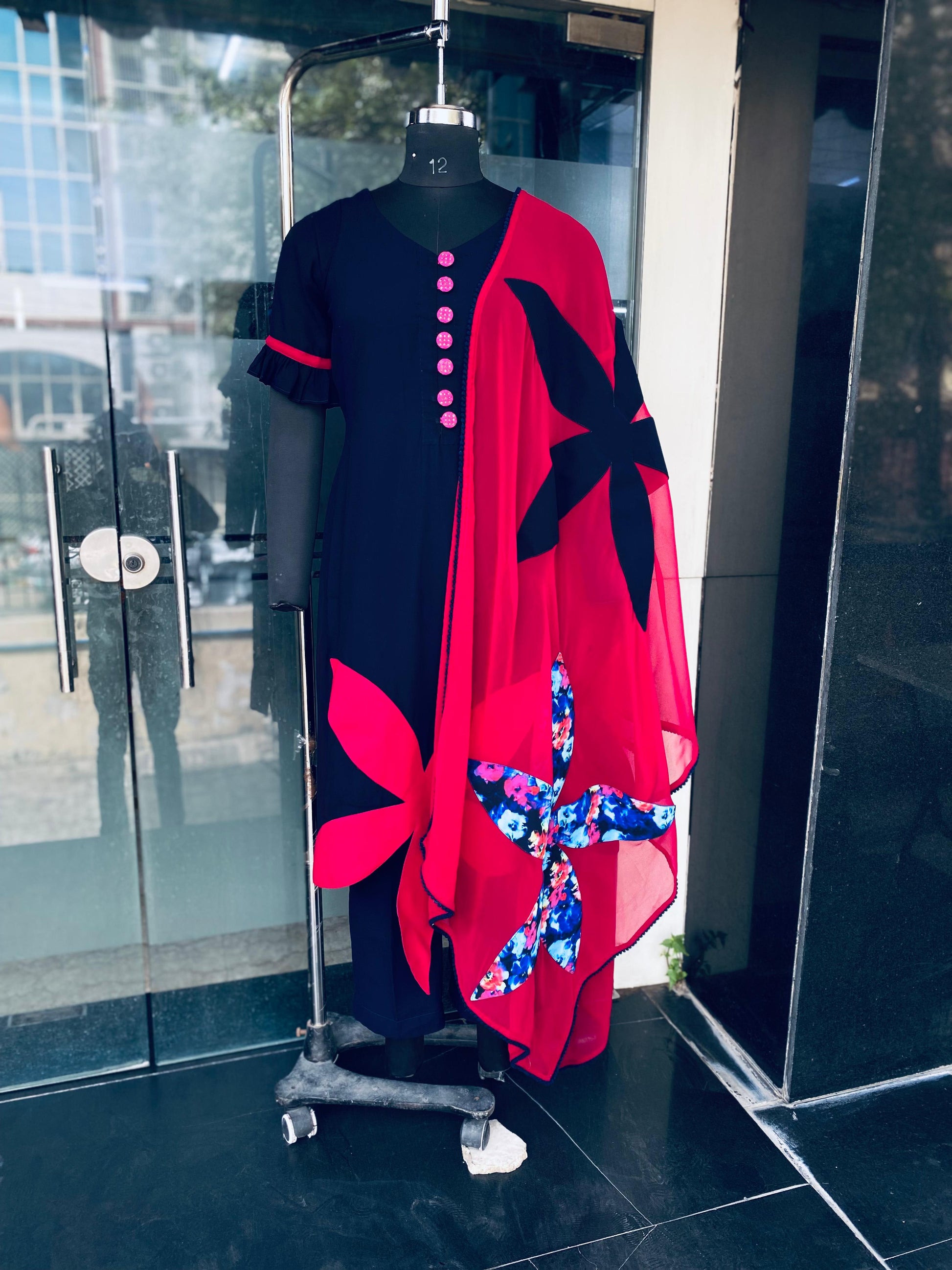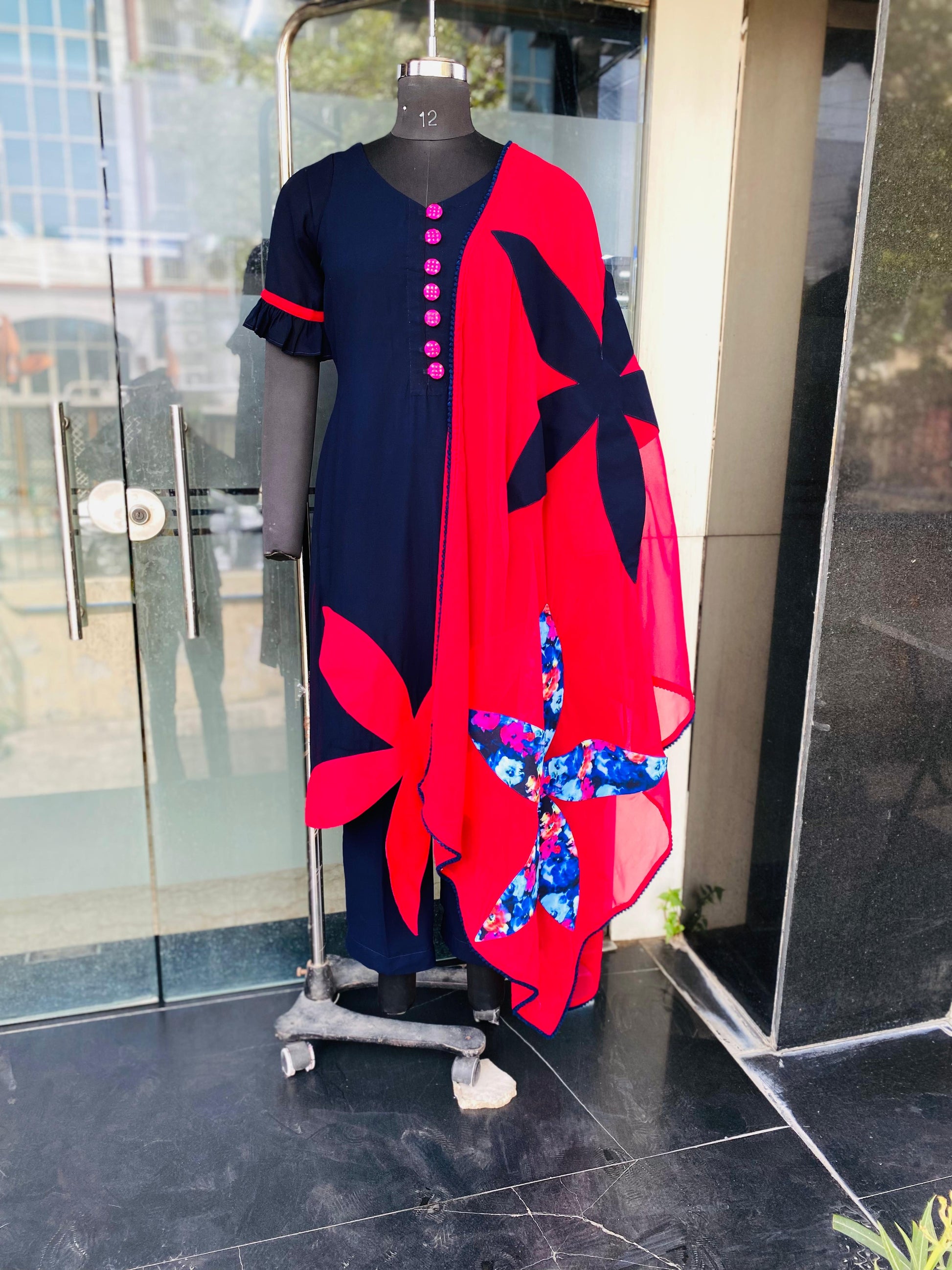 Both Side Slit Kurti With Knee Se Straight Pant ( Flower Detailing On Kurti And Dupatta ) |