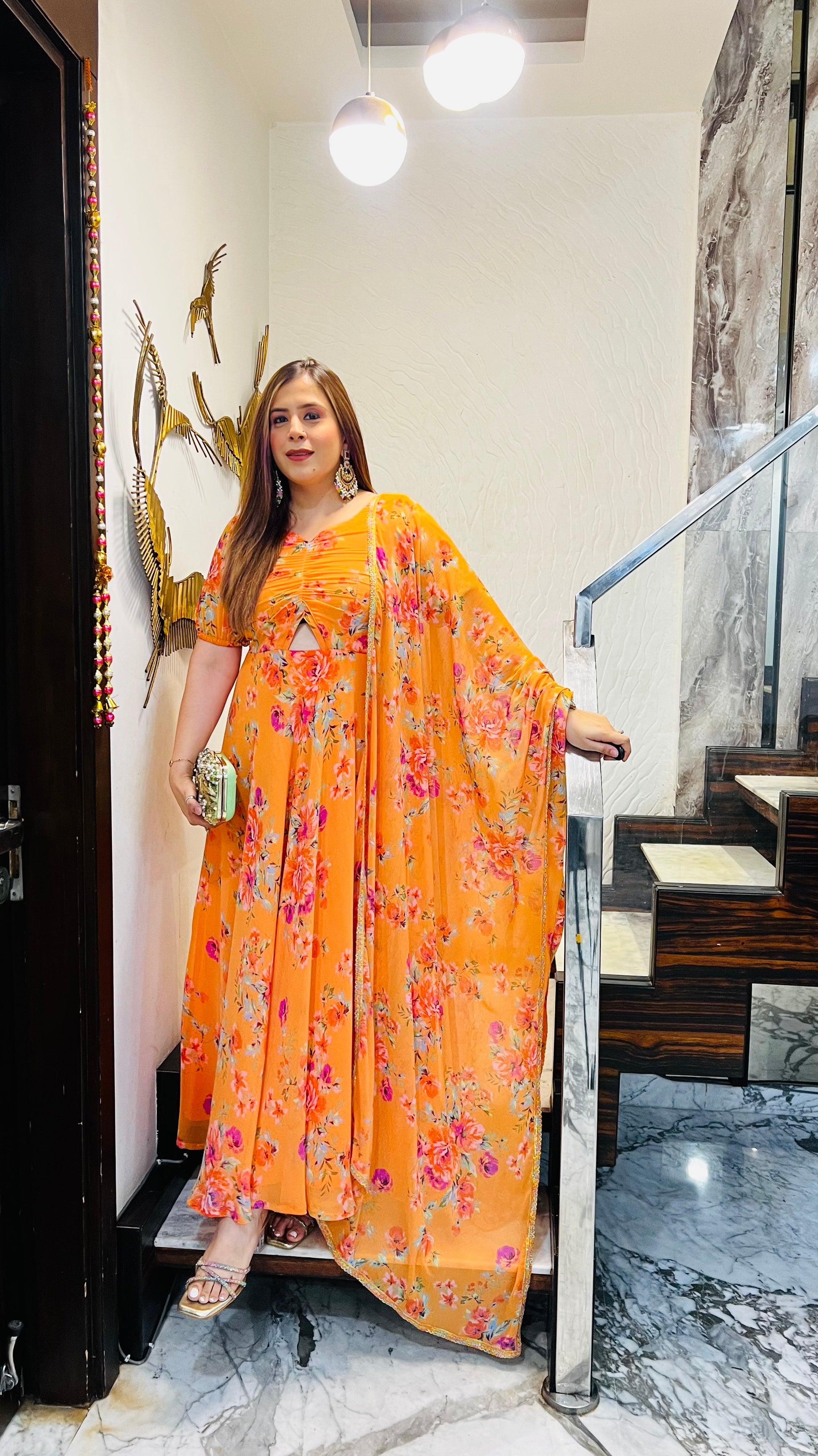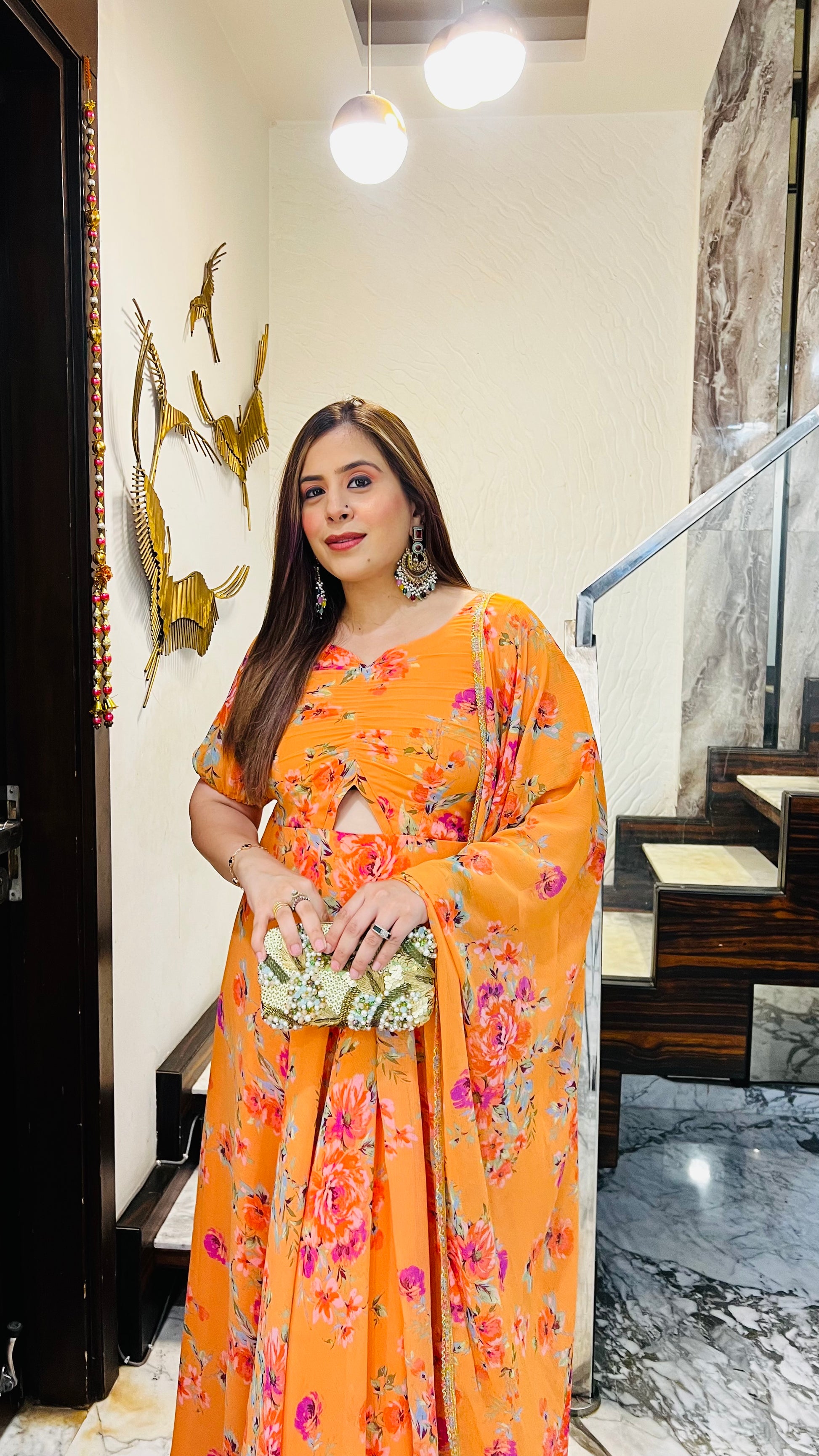 "Bloom with grace in this vibrant Orange Floral Print On Print Anarkali 🌸✨. Perfectly crafted for those who love to stand out, this outfit radiates warmth and elegance. 🍊🌺" |