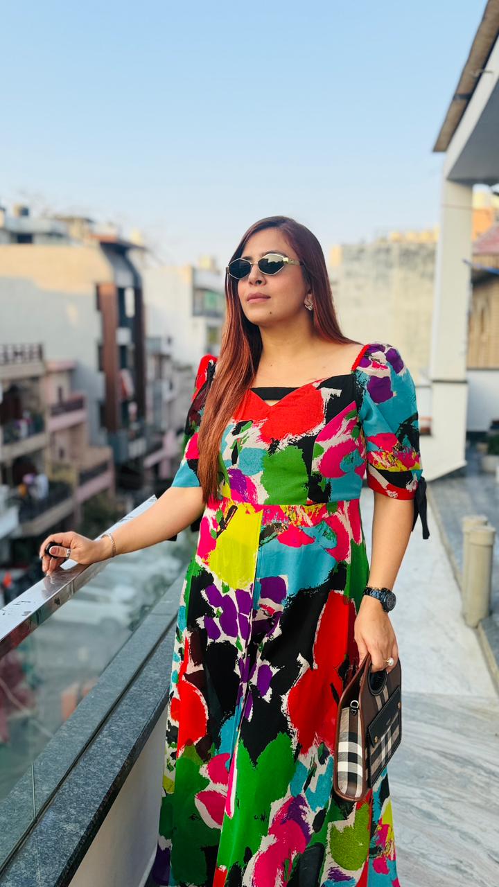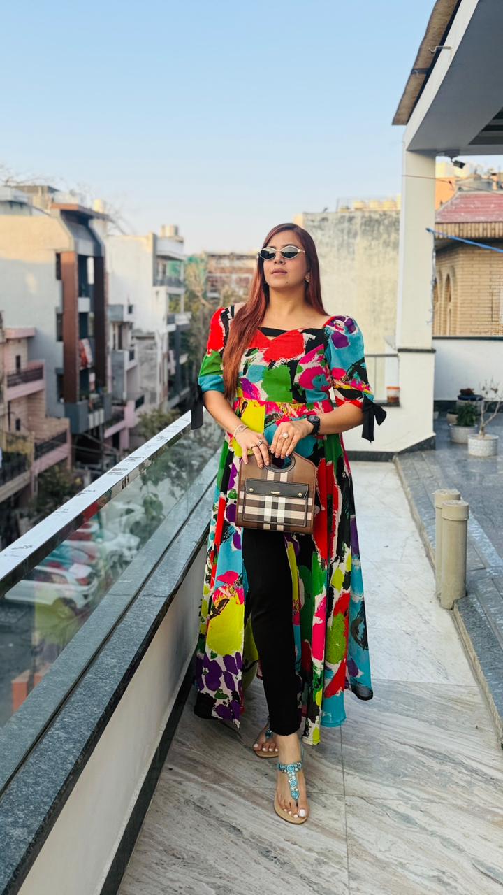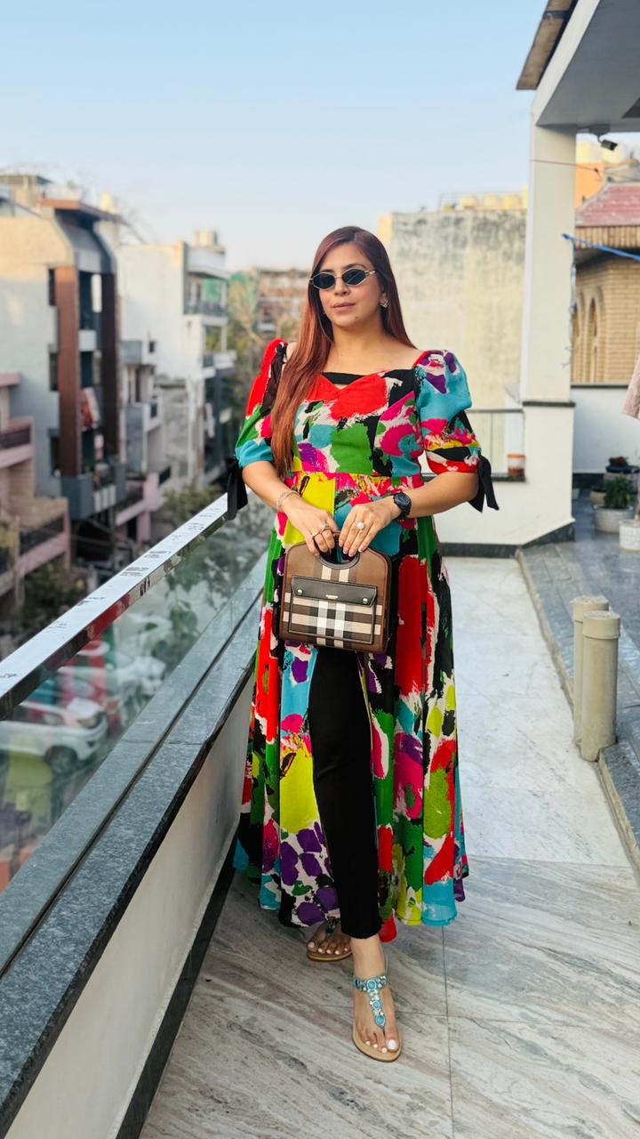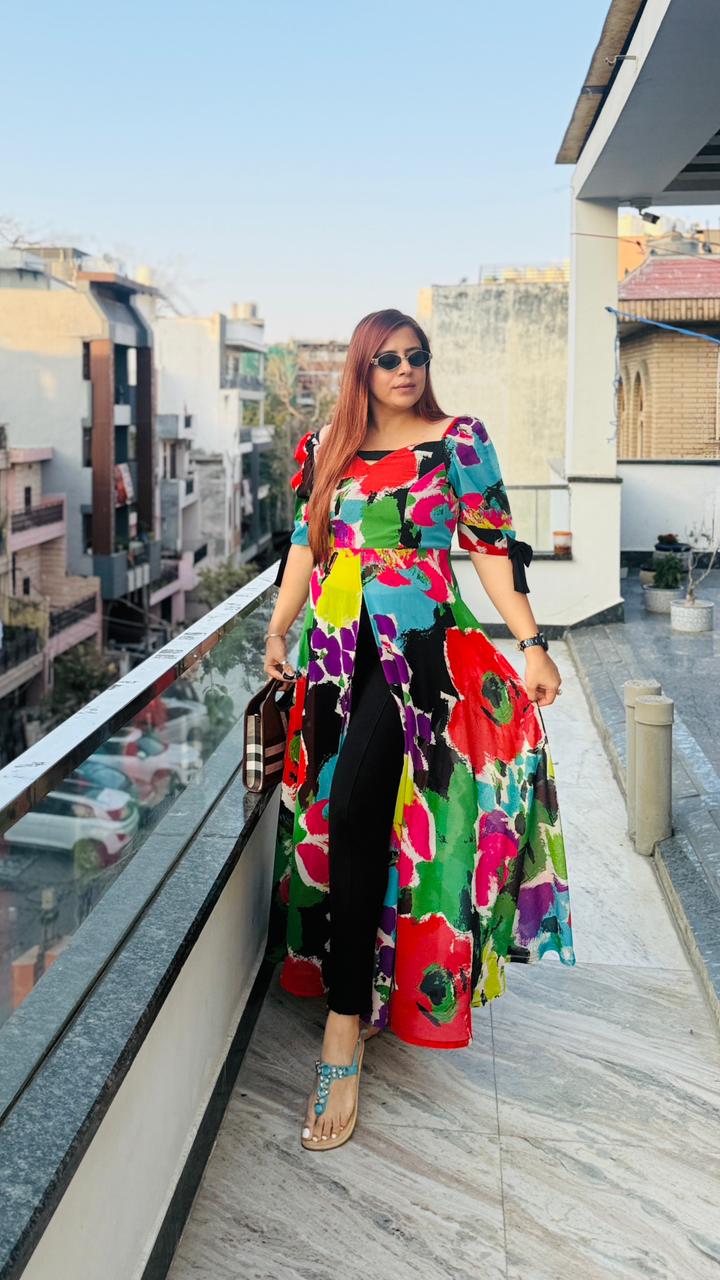 | Description | Make a bold statement with this vibrant multicolor Georgette slit top featuring artistic abstract prints. Designed with a flattering neckline and stylish puff sleeves with tie-up detail, it comes with a front high slit for a modern layered look. Lightweight, flowy, and perfect for brunches, outings, and statement styling. |