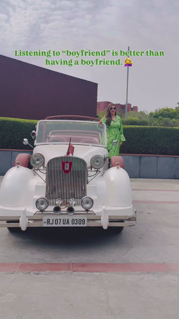 Parrot green satin shirt dress 🌿✨ with floral prints 🌸, statement bell sleeves, and asymmetrical drape detailing. Perfect blend of elegance and comfort, styled with white heels and sunglasses 😎. |