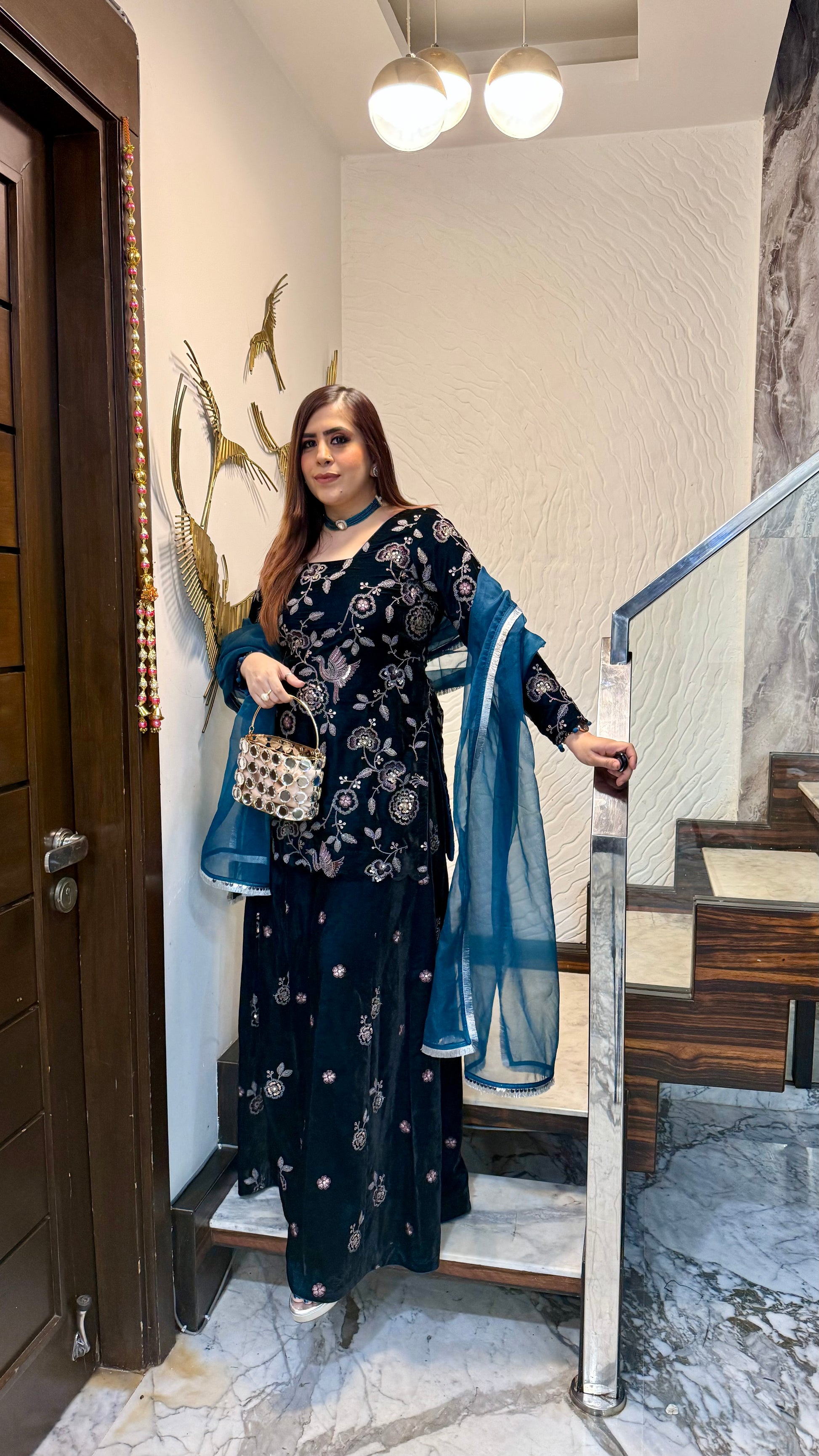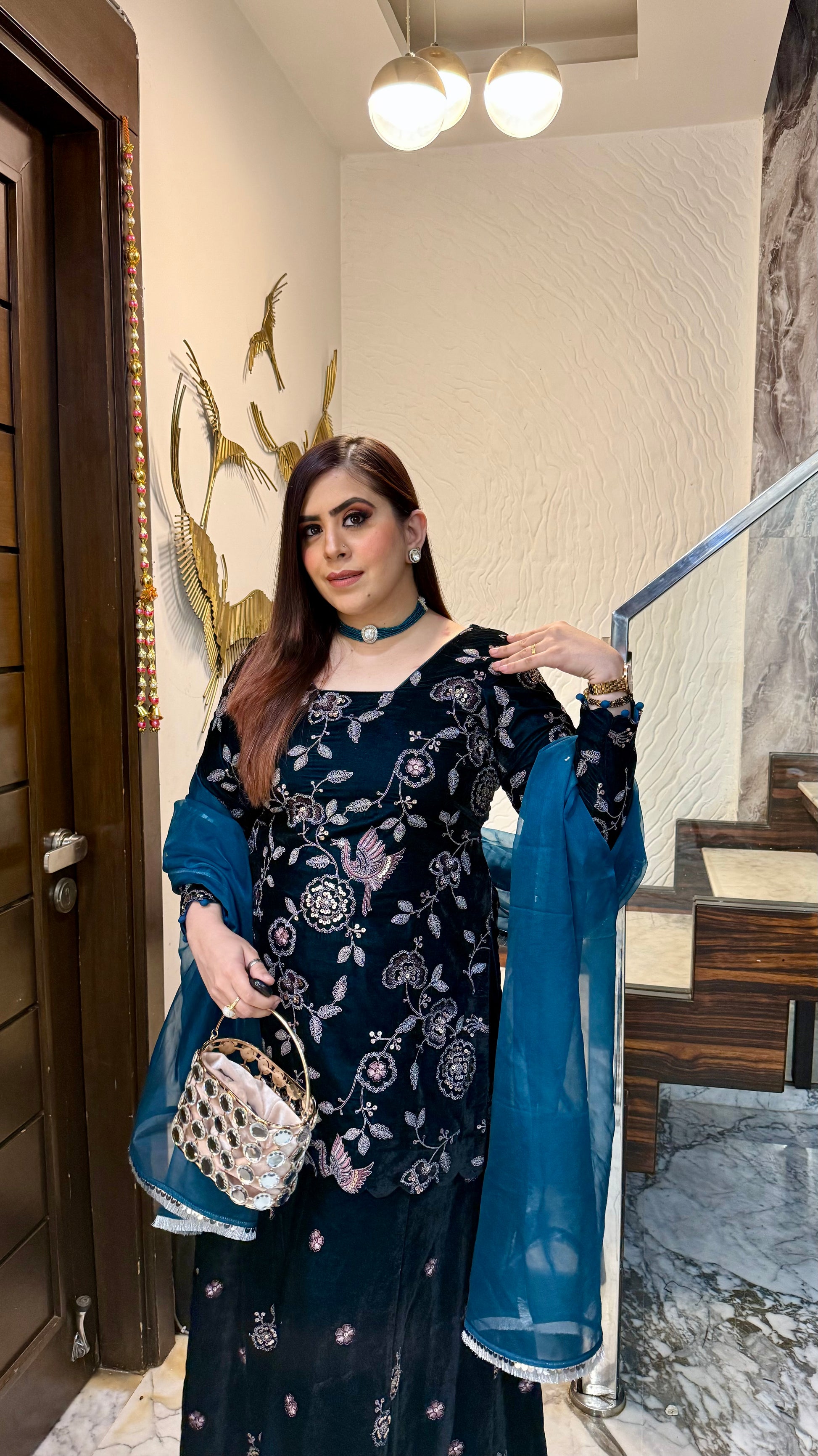This Peacock Power Sharara suit features intricate floral embroidery, a flowy dupatta with silver edging, and a glamorous silhouette. Perfect for festive evenings, it radiates elegance and charm. 🖤✨🌸 |