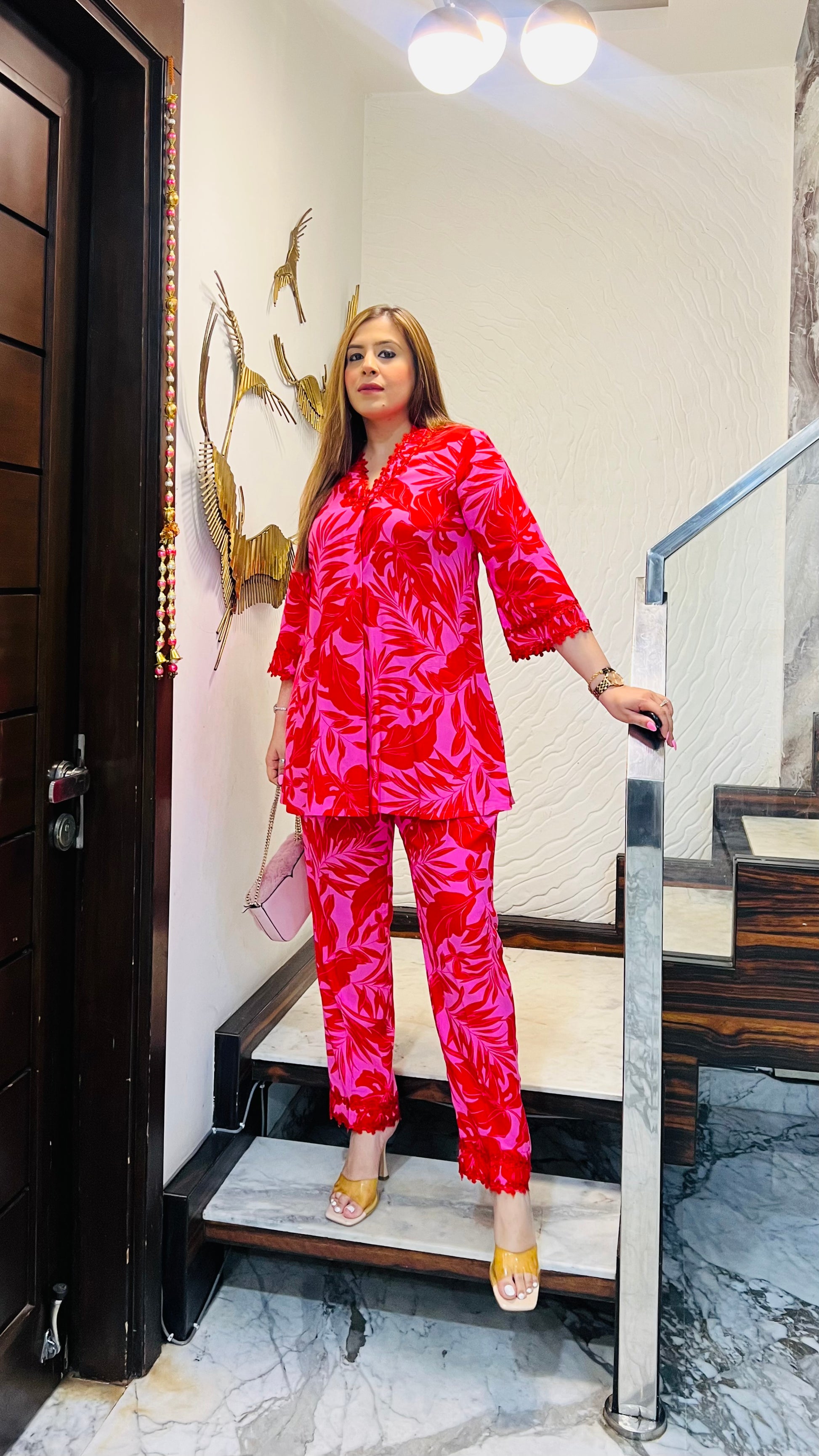 The Pink Flower Cotton Co-Ord šŗāØ is a vibrant red and pink floral set featuring a breezy tunic with lace details and matching pants. Perfect for effortless elegance and comfort! šš |