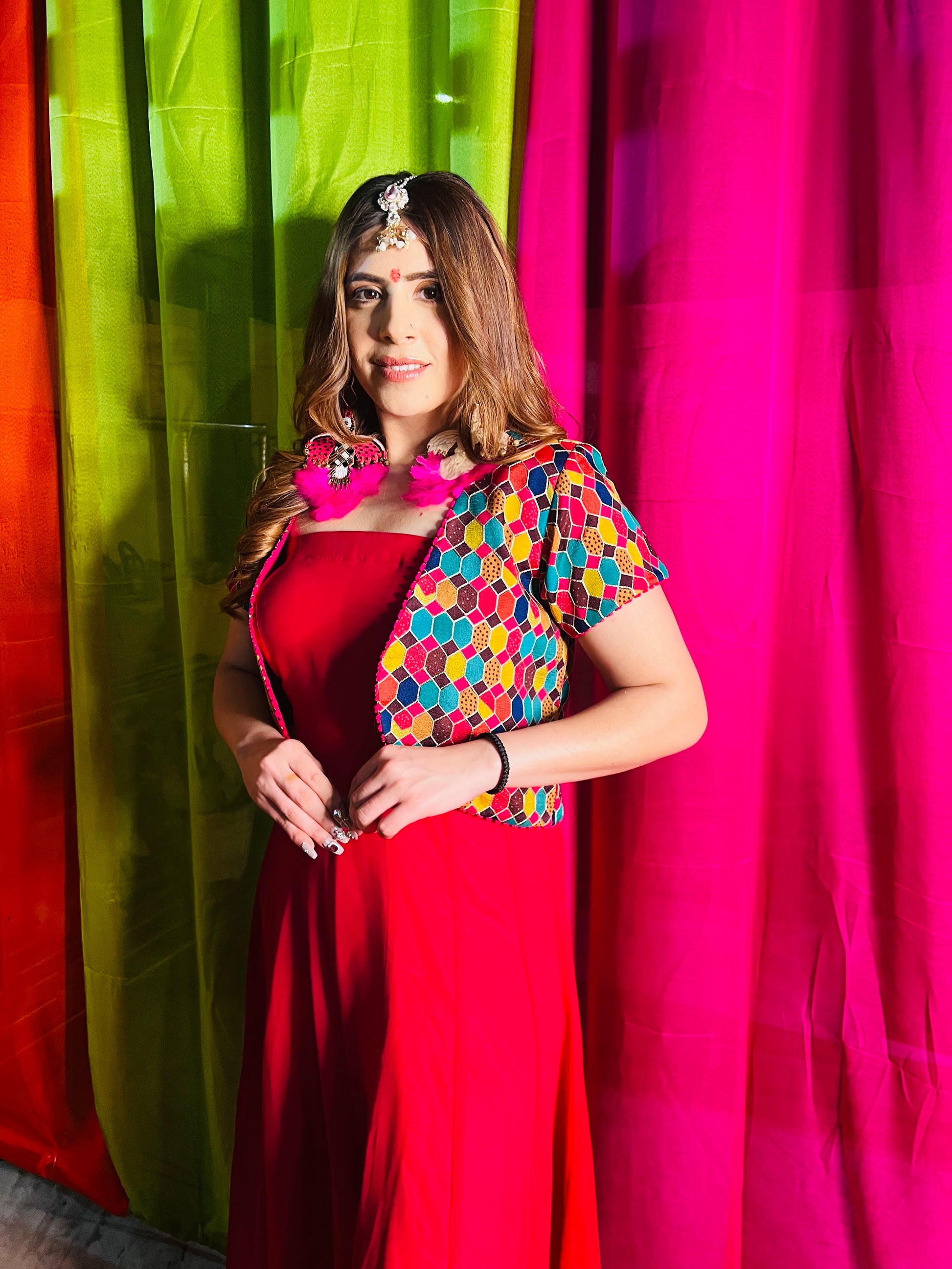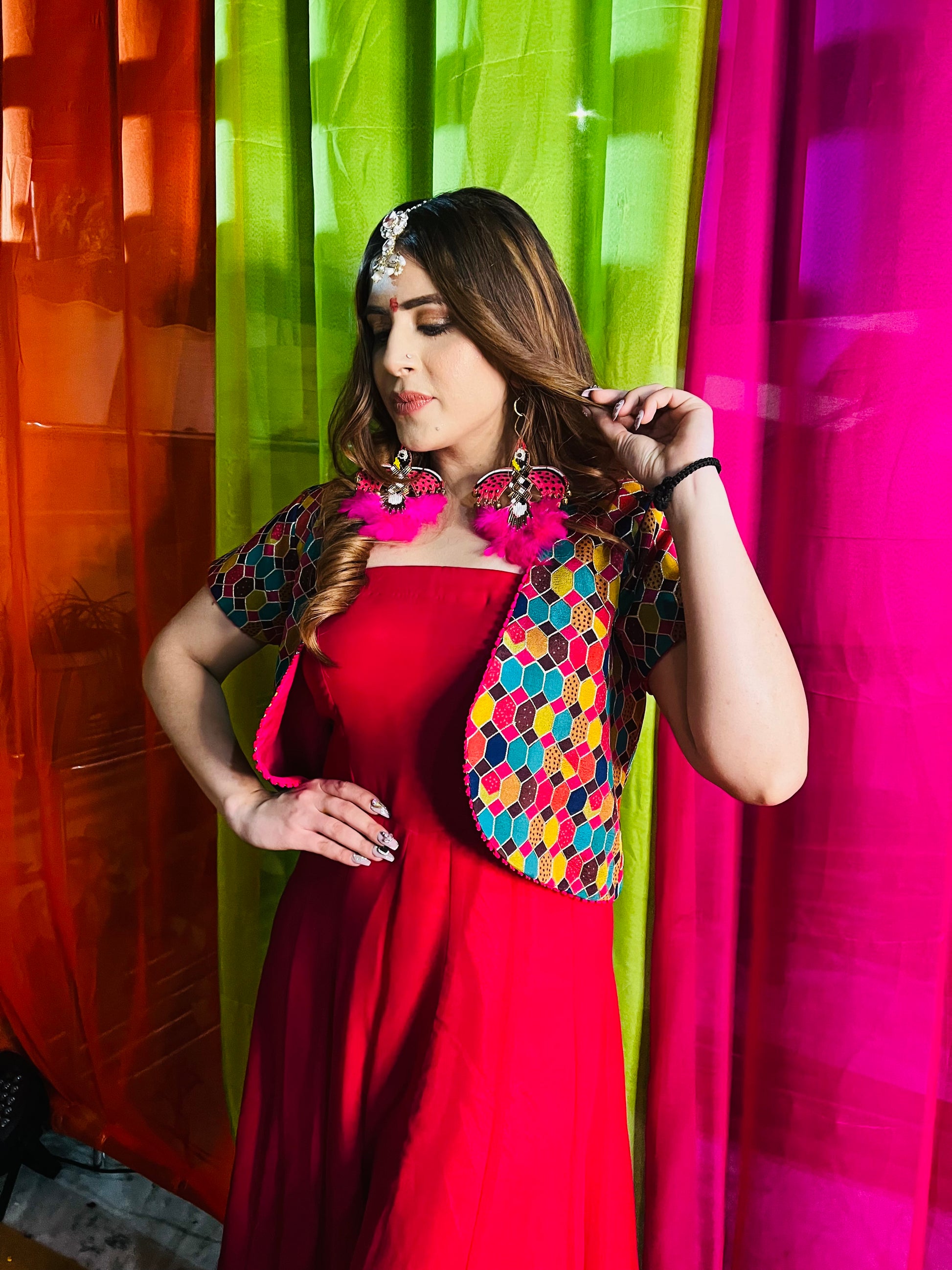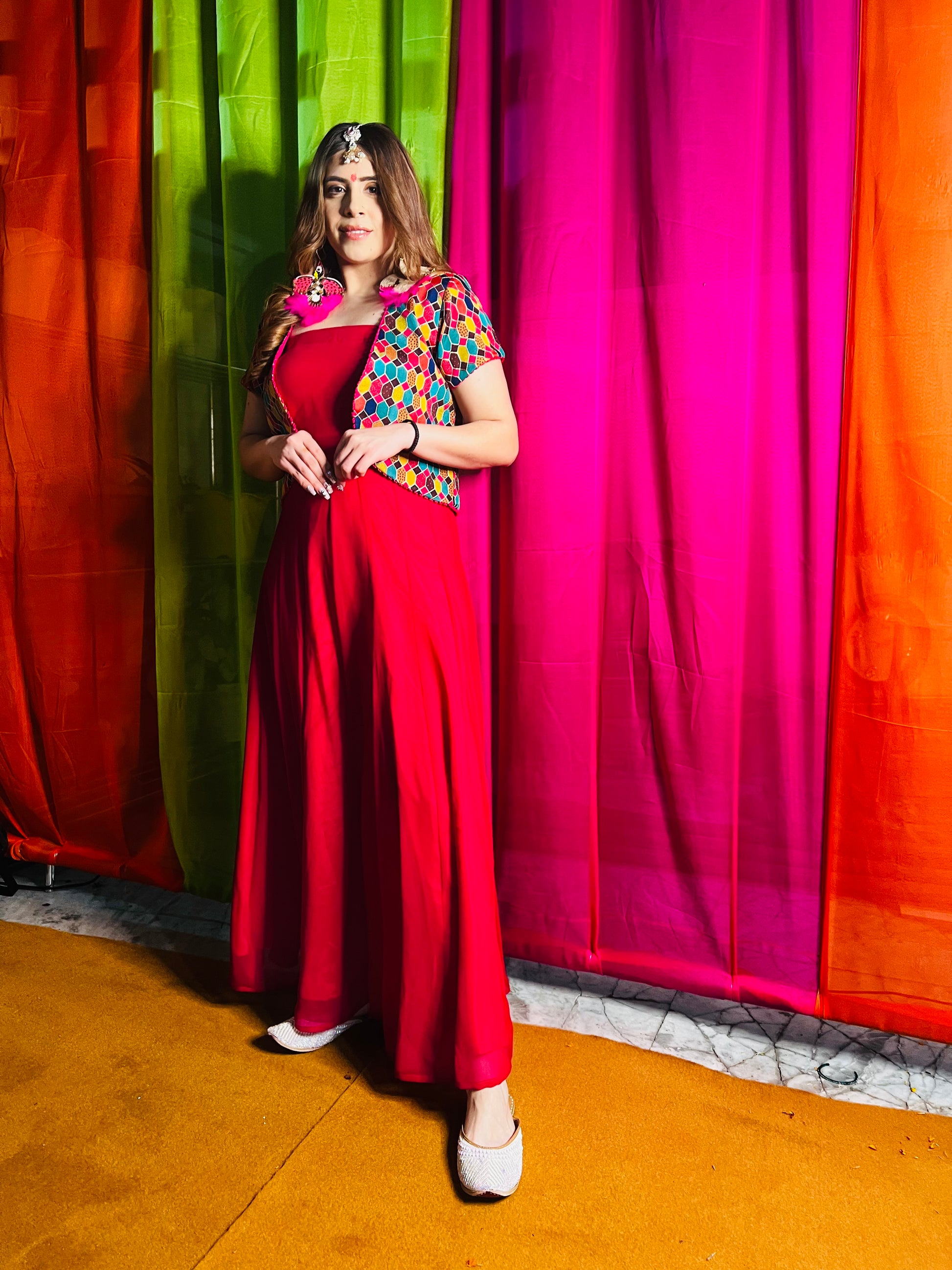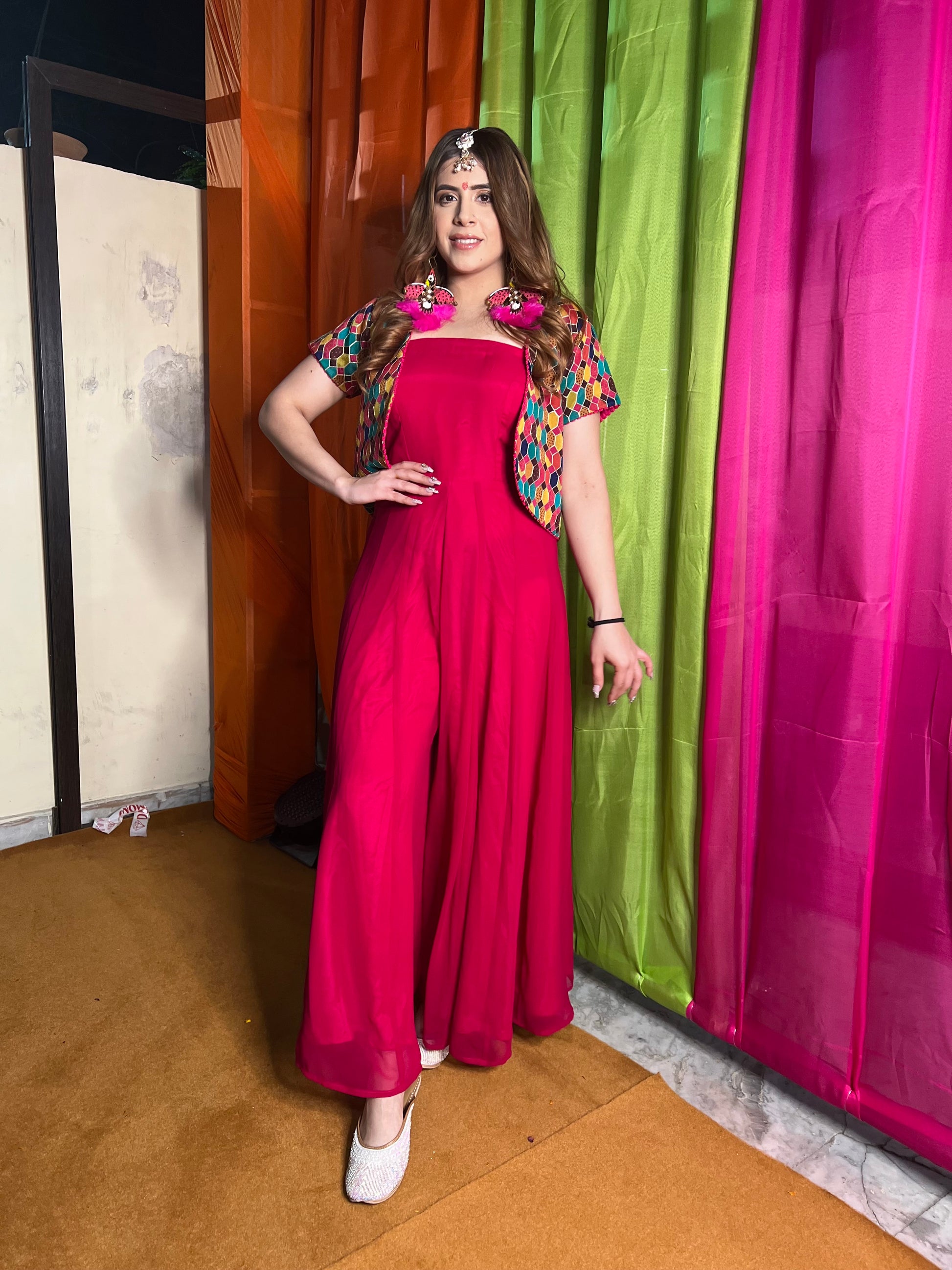 A classy fancy sleeveless solid jumpsuit tuned with a multicolored jacket that makes it appropriate to wear at birthdays and dinner dates..