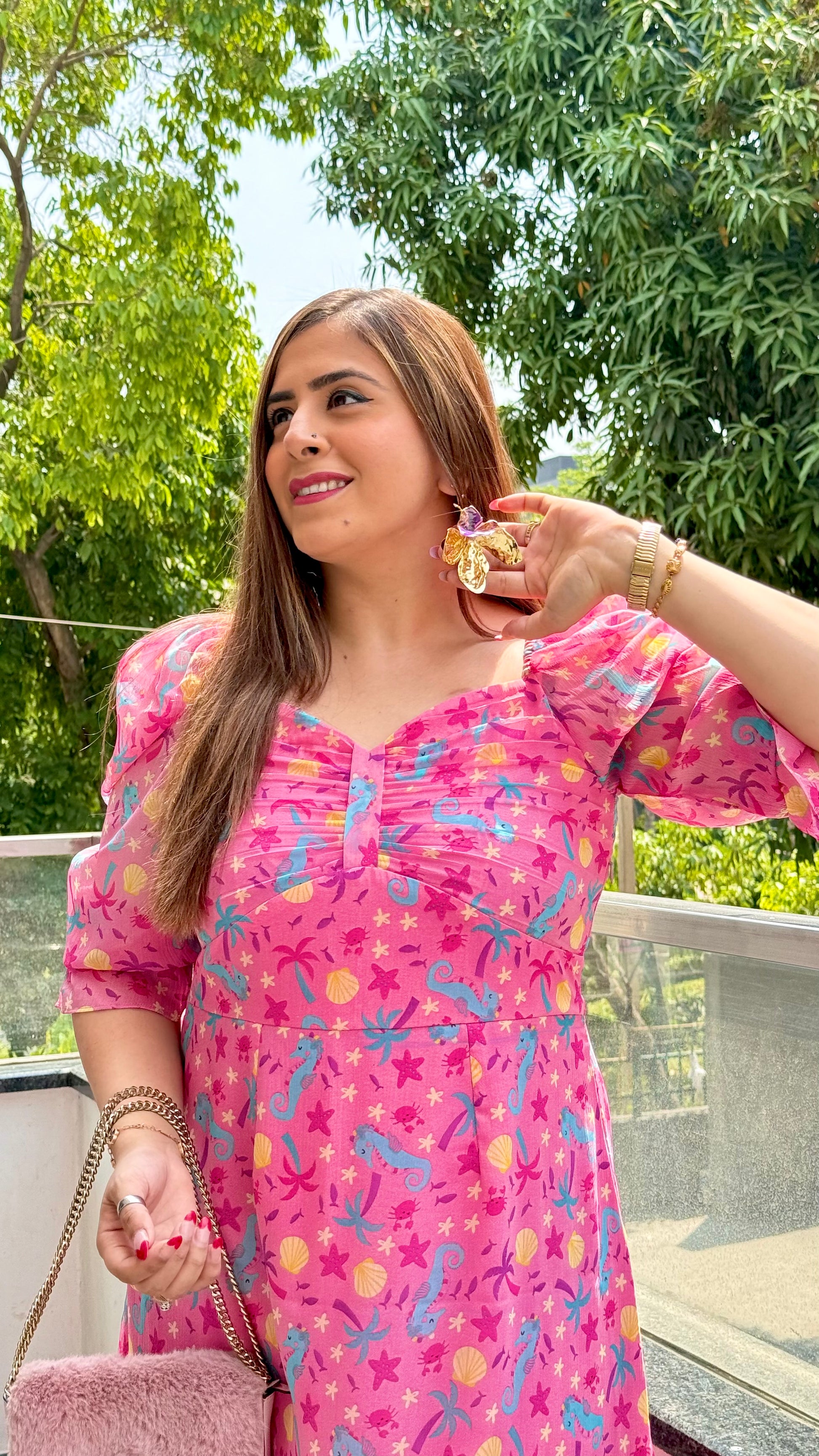 Make waves in our Pink Ocean Maxi 🌊—a dreamy pink dress with ocean-inspired prints 🐚🐬, ruched sweetheart neckline, puff sleeves, and flowy silhouette. Ideal for beachy vibes and sunny strolls! ☀️👗
