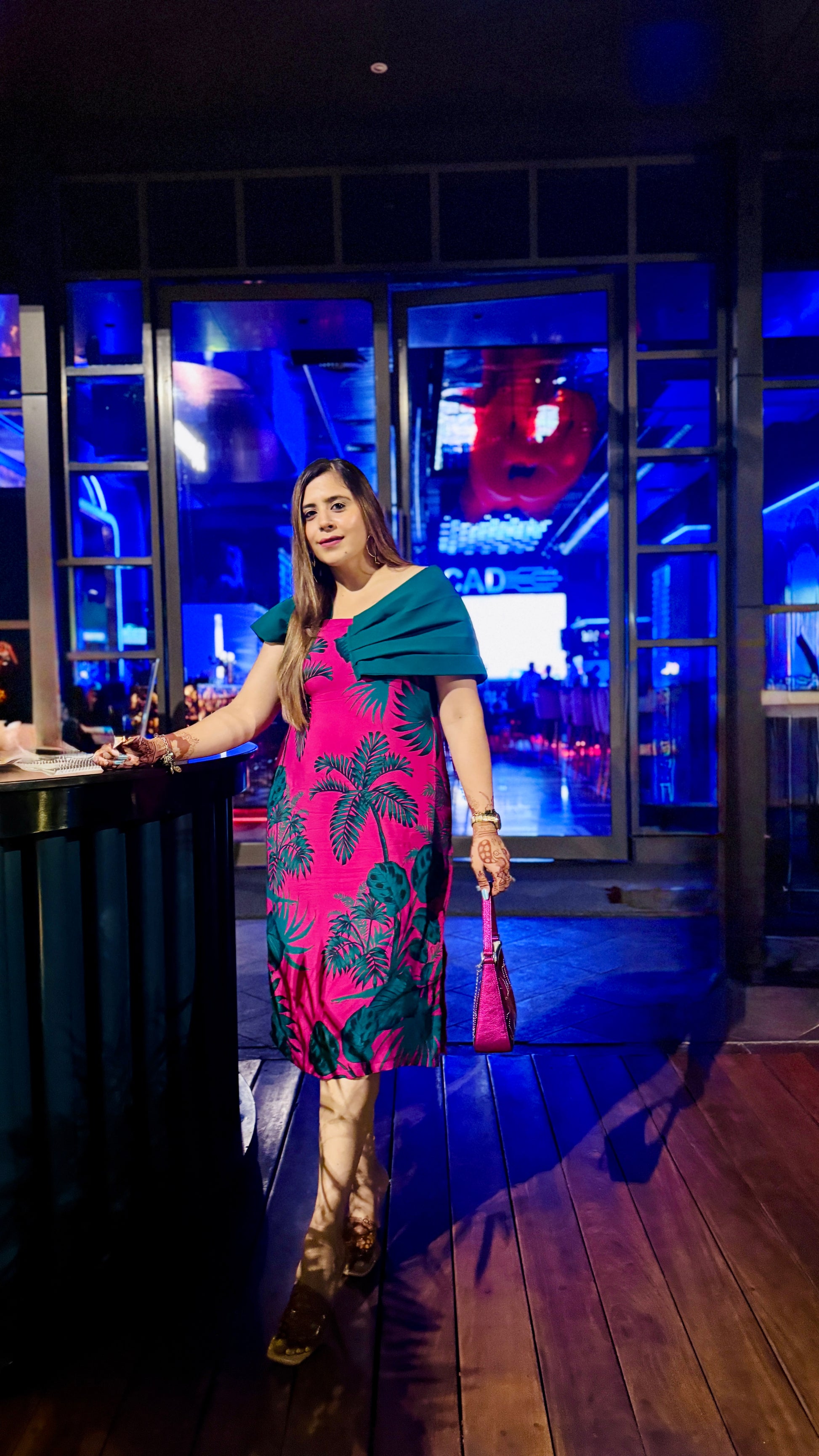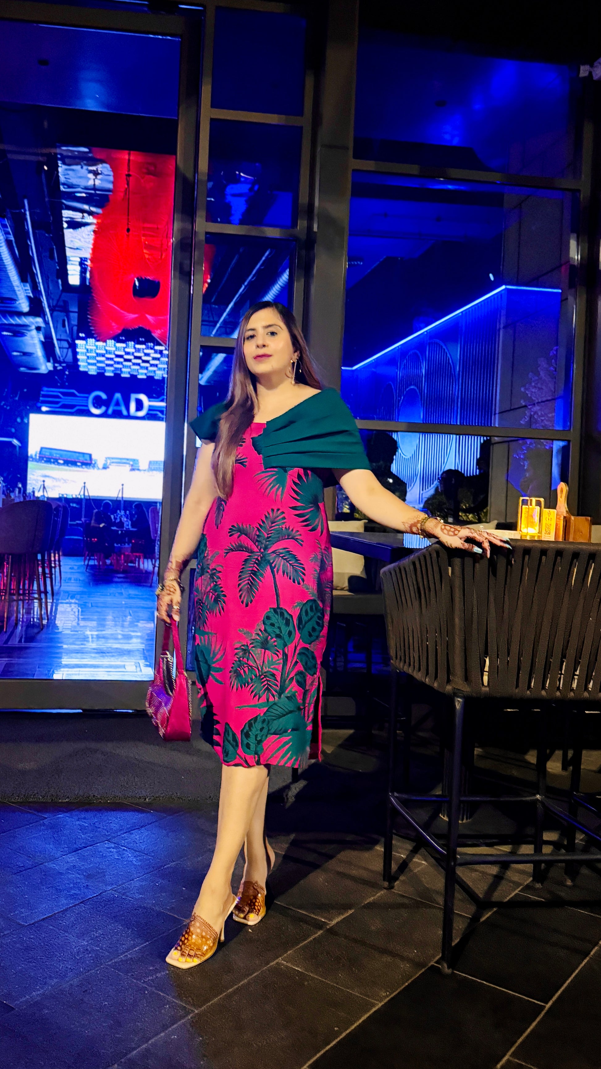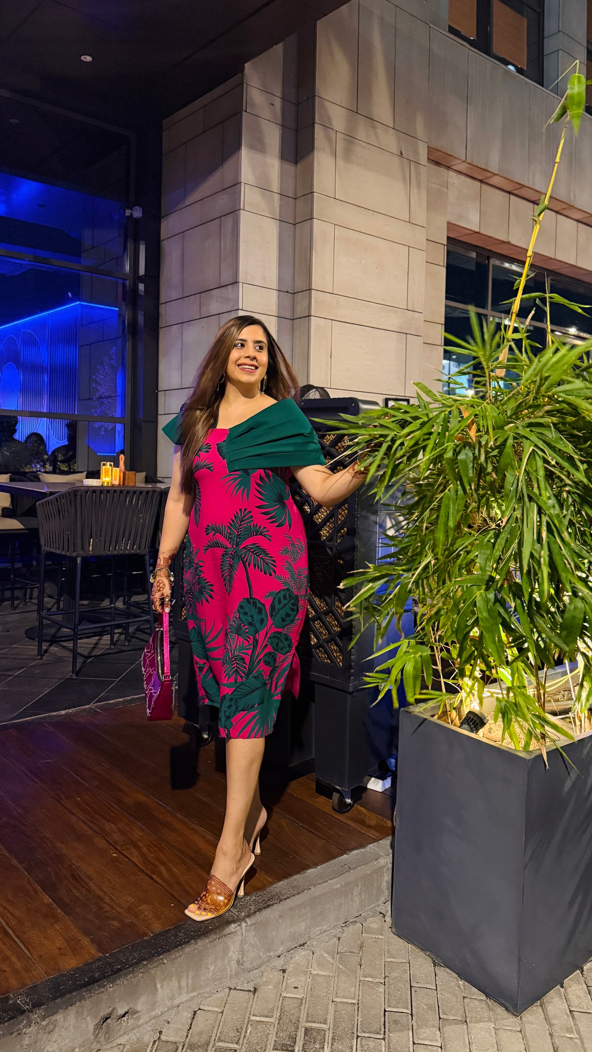 Step into tropical glam with our Pink Paradise Midi Dress 🌴💖 This vibrant magenta dress features bold green palm prints, a stylish structured shoulder drape, and a flattering midi cut ✨🌺 Perfect for evening soirées! 🥂👠 |
