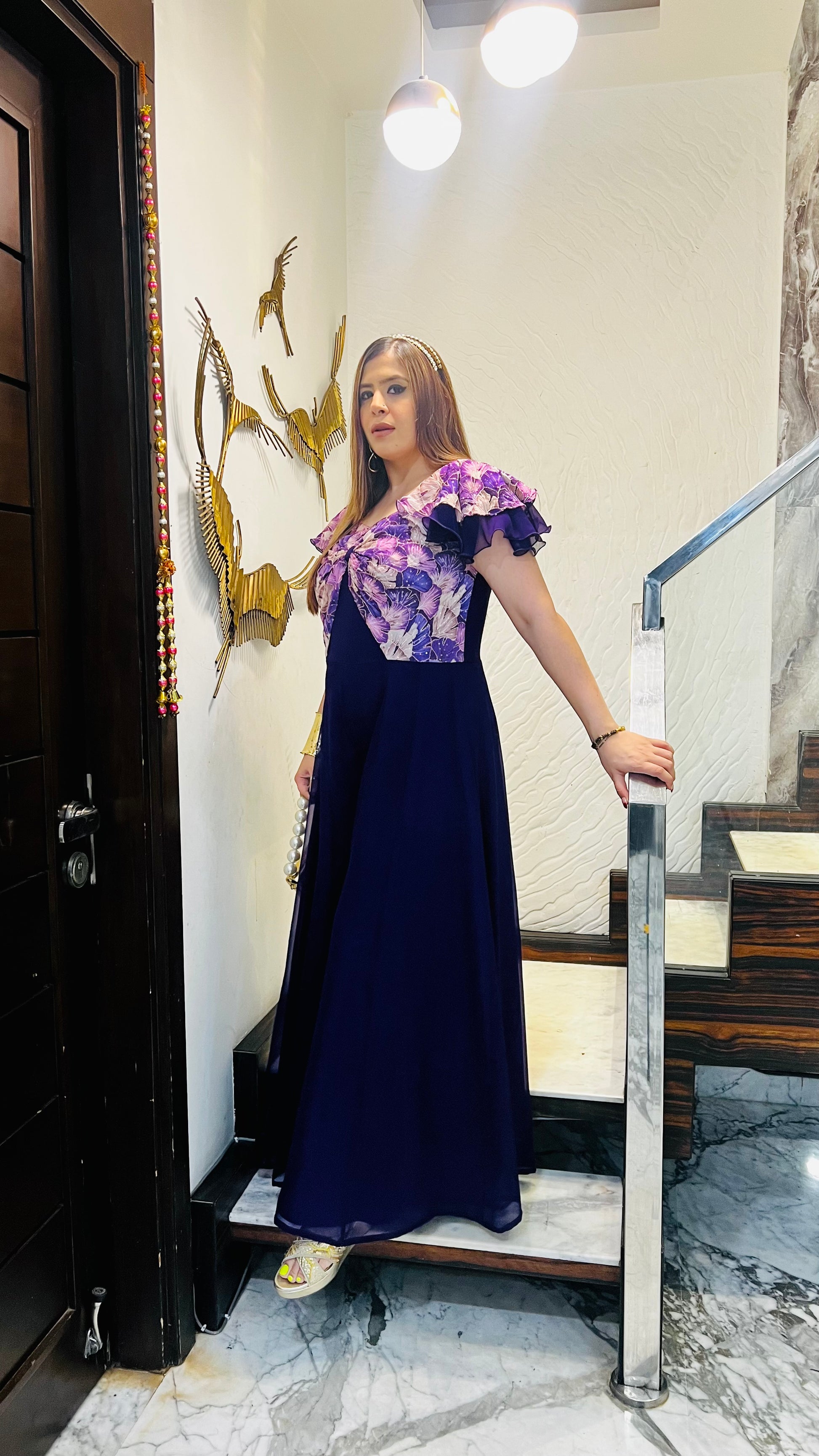 This elegant purple bow jumpsuit ๐ features a flowy silhouette, ruffled floral sleeves ๐ธ, and a chic front bow ๐. Perfect for festive occasions or evening outings โจ๐๐ . |