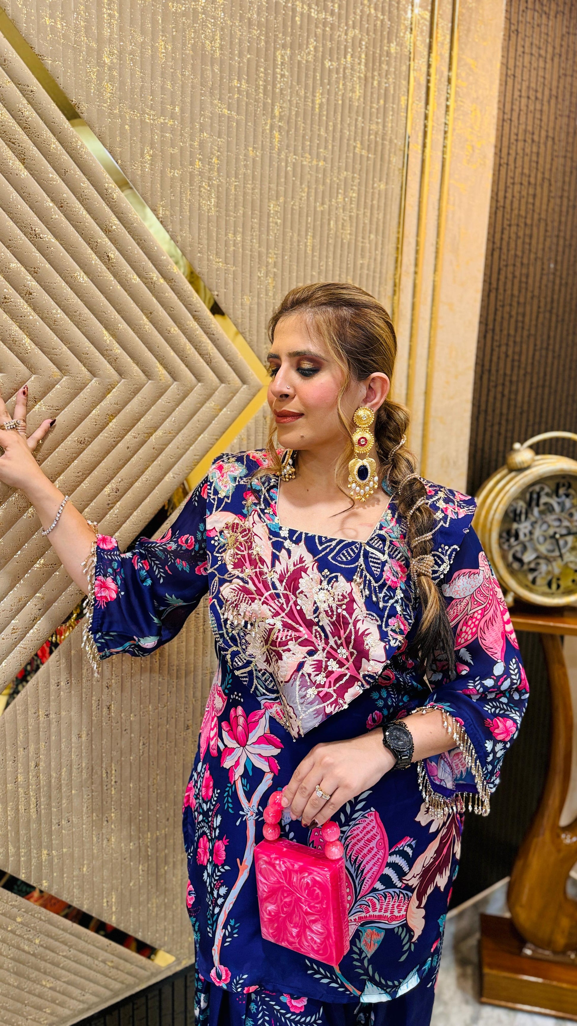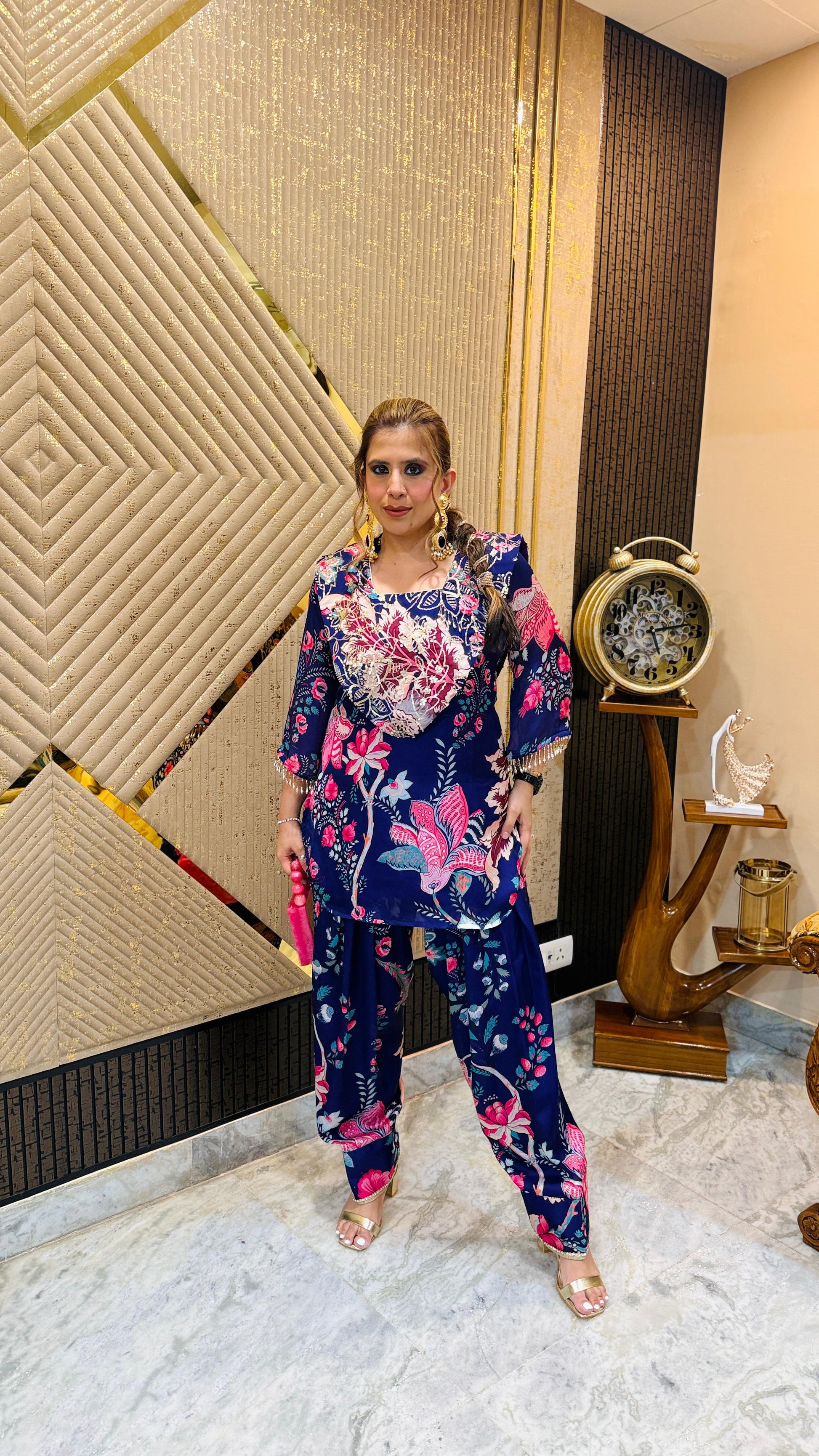 Purple Floral Farshi Salwar Co-Ord 🌸💜 featuring a rich navy-purple base with bold pink floral prints 🌺, ruffled embroidered neckline ✨, and wide salwar pants 👖. Styled with golden heels 👠 and statement earrings 💍. |