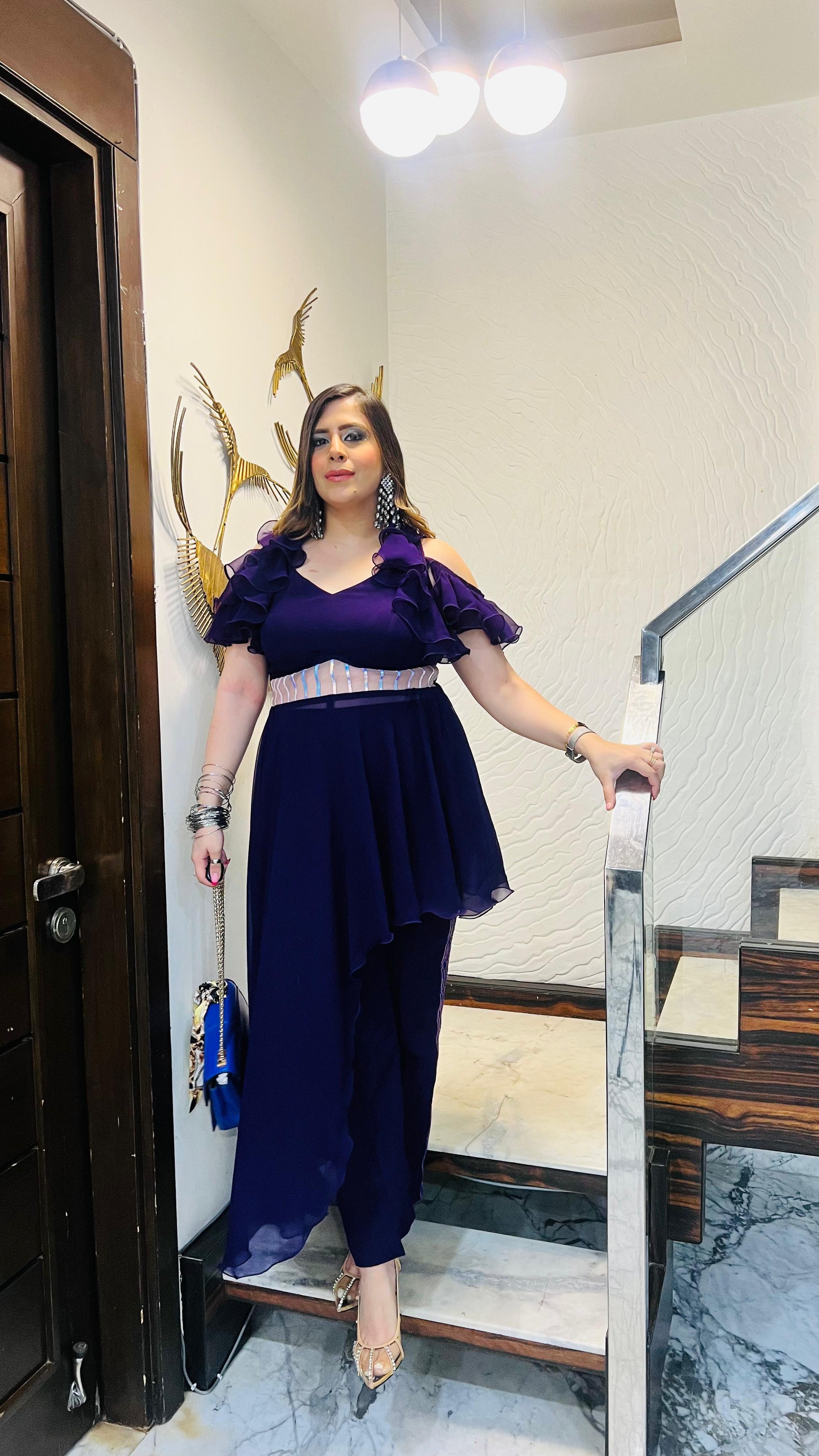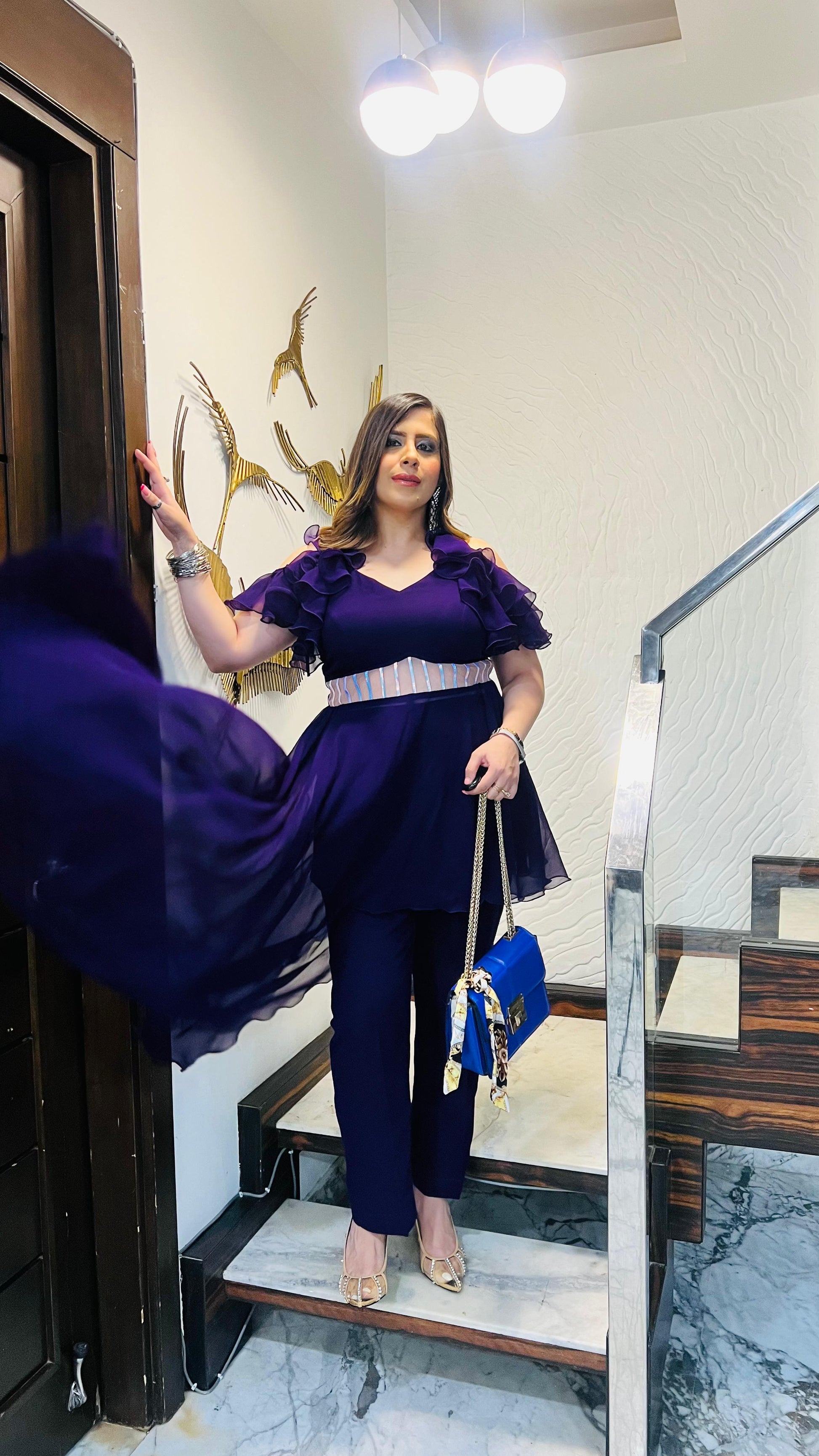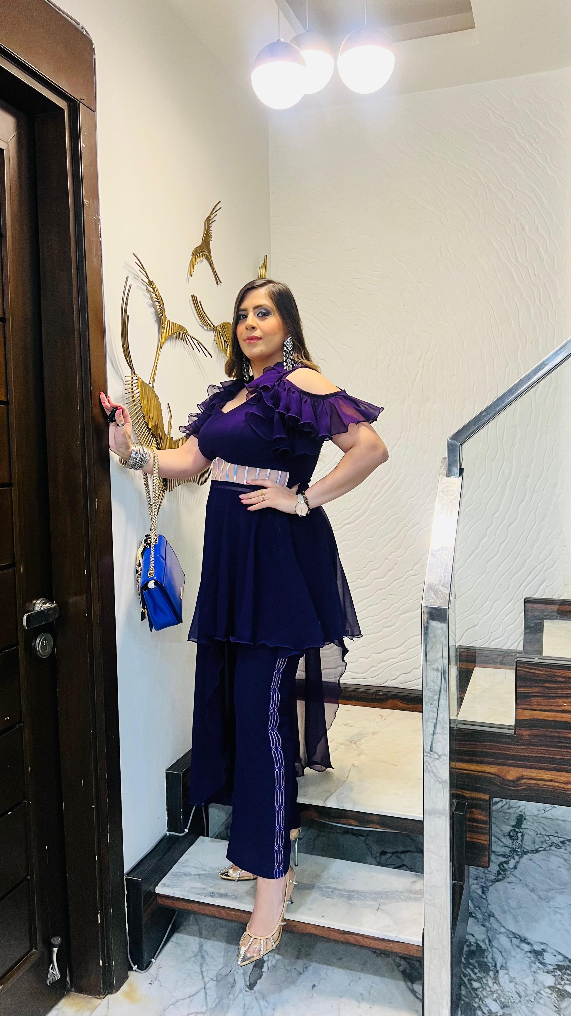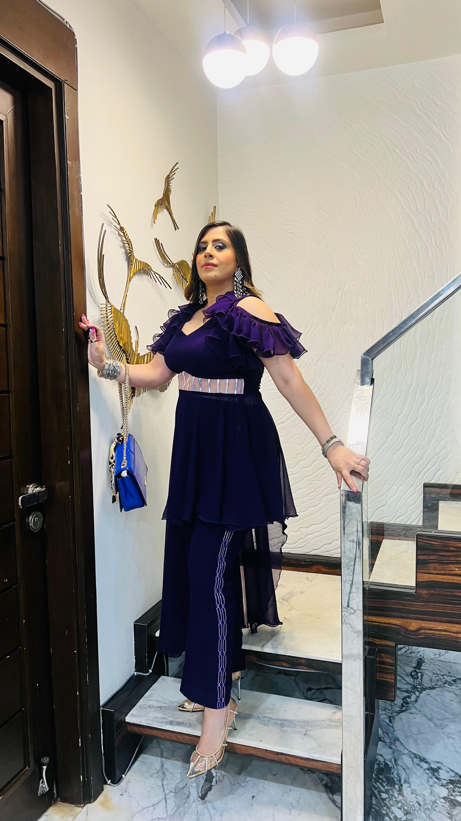 Elevate your style with this stunning Purple Holographic Co-Ord ✨. Featuring ruffled sleeves and a chic asymmetrical silhouette, this outfit blends elegance and boldness, perfect for any fashionable occasion 💜. |
