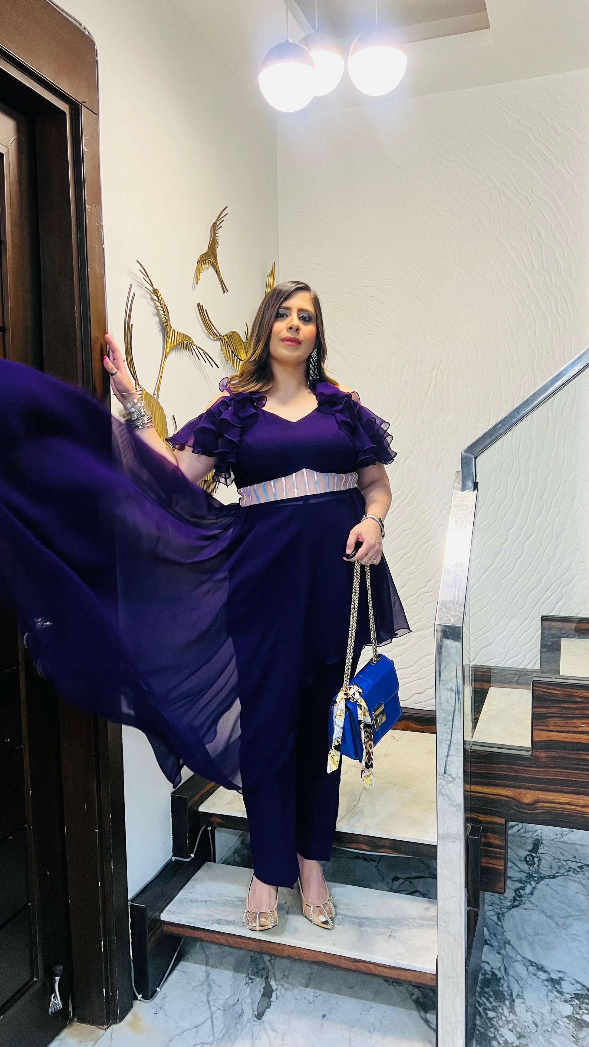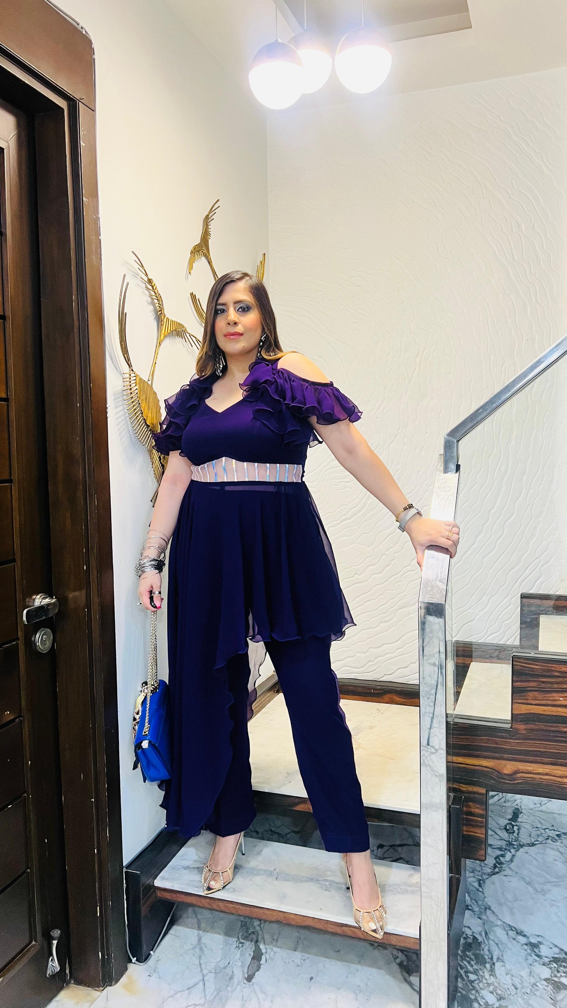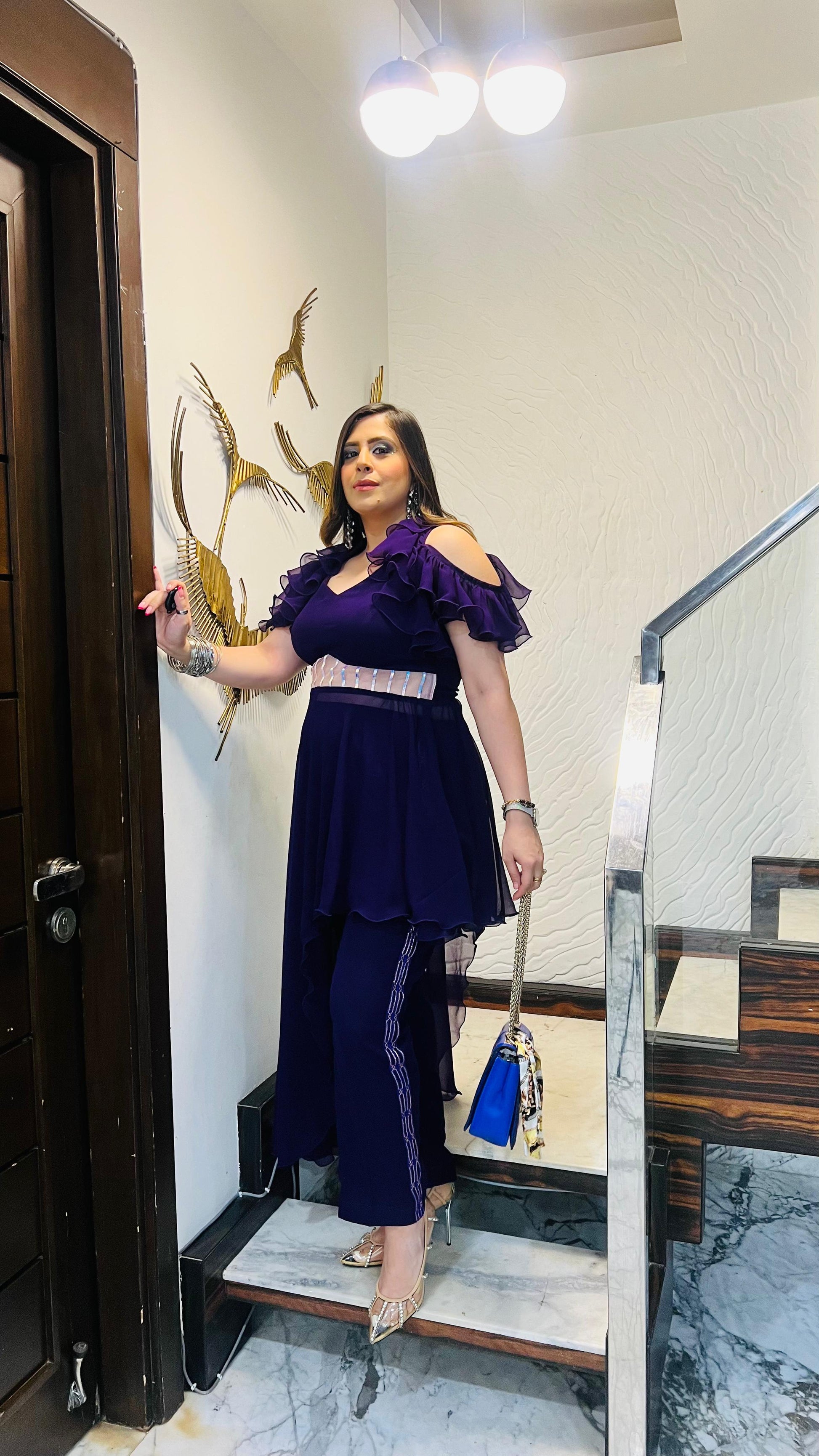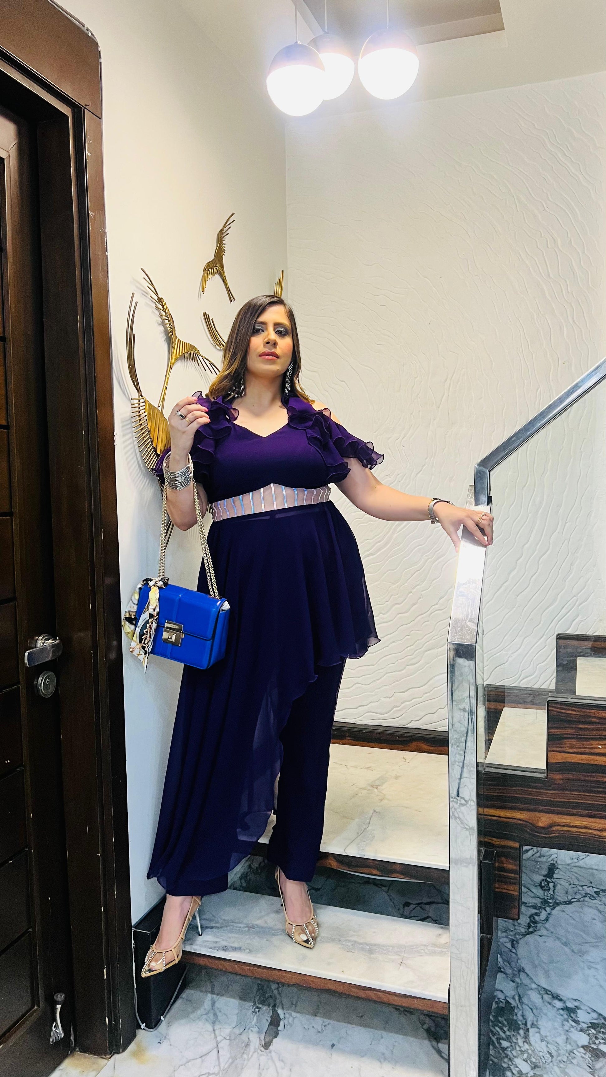 Elevate your style with this stunning Purple Holographic Co-Ord ✨. Featuring ruffled sleeves and a chic asymmetrical silhouette, this outfit blends elegance and boldness, perfect for any fashionable occasion 💜. |
