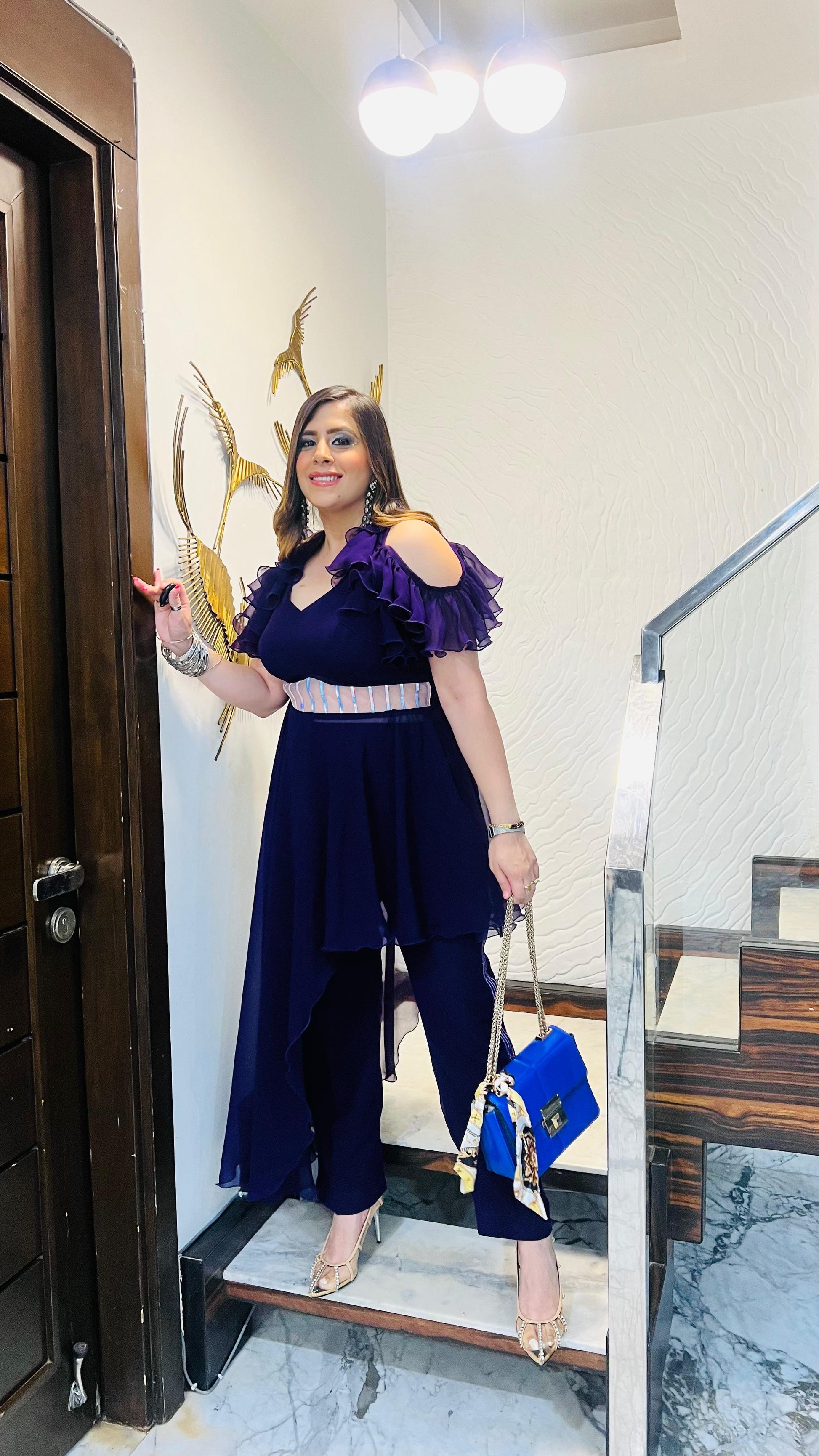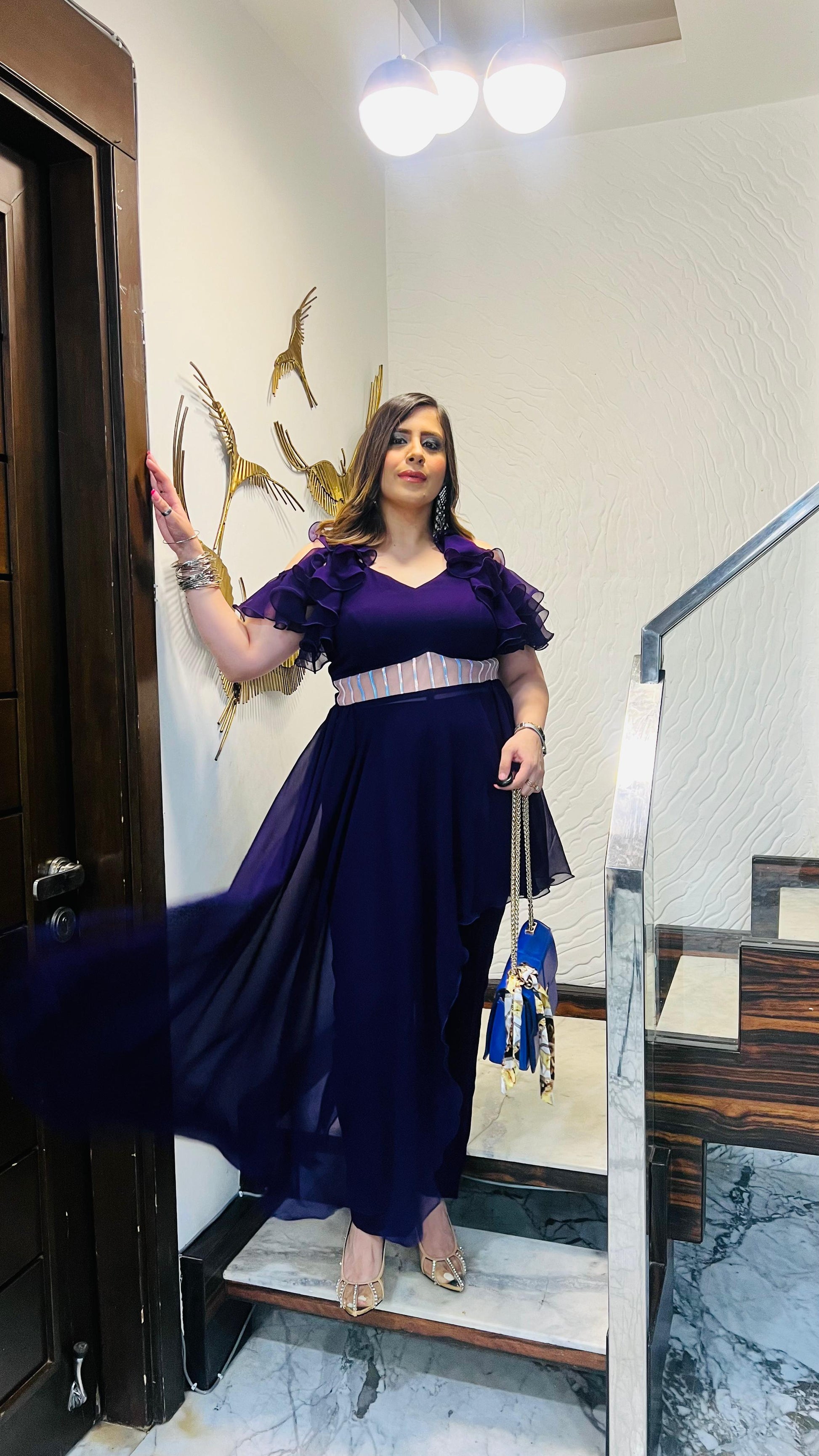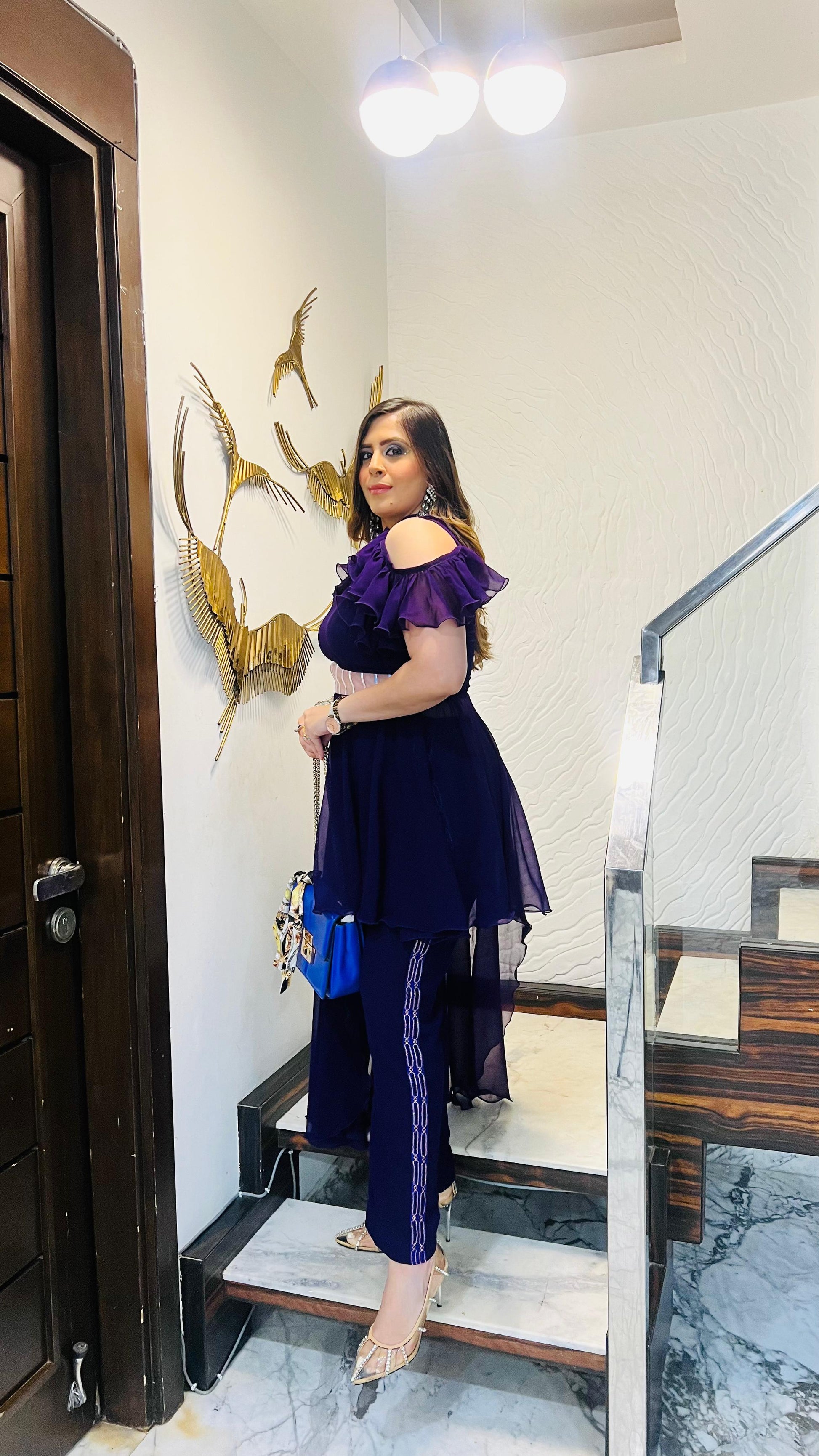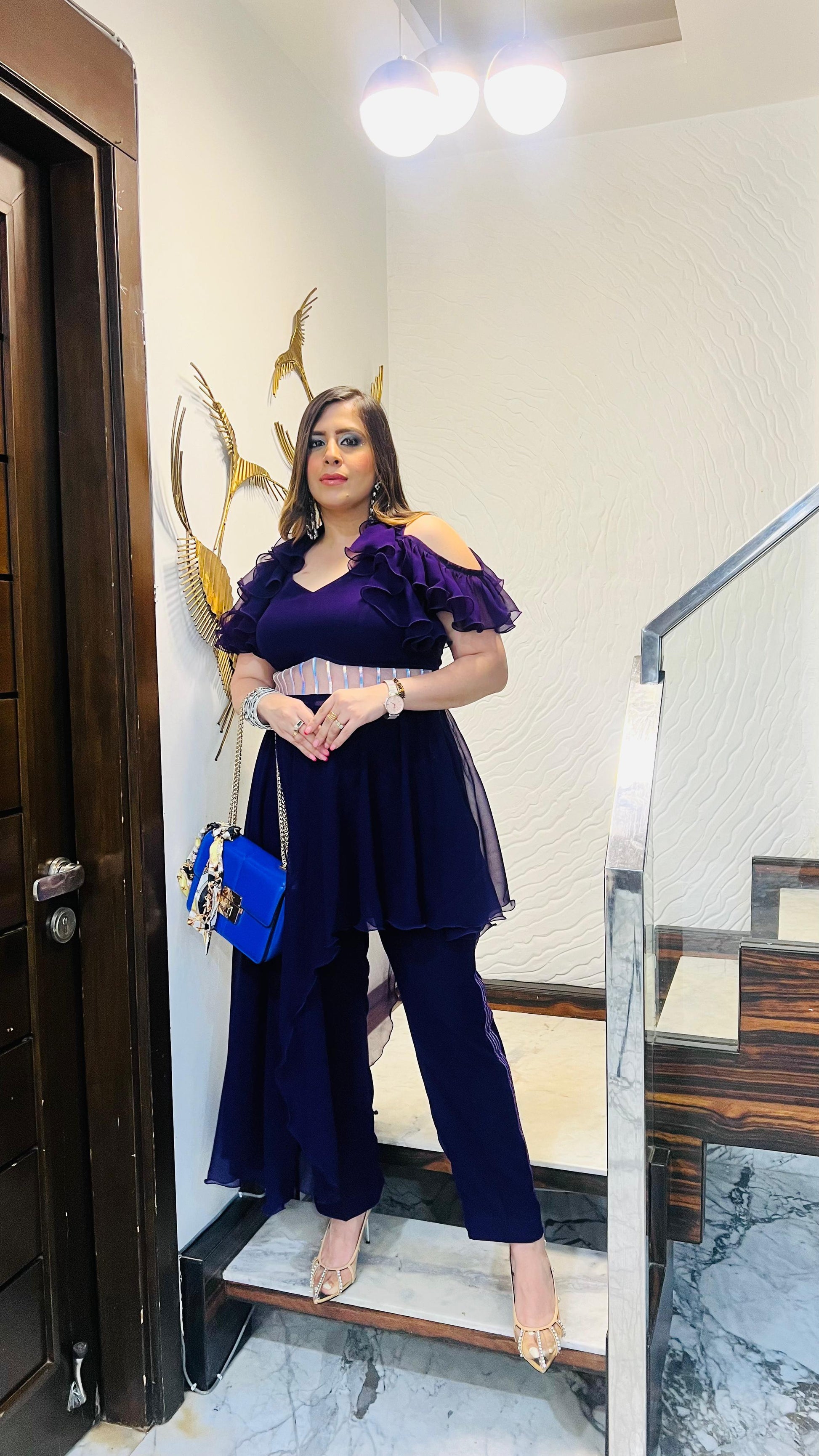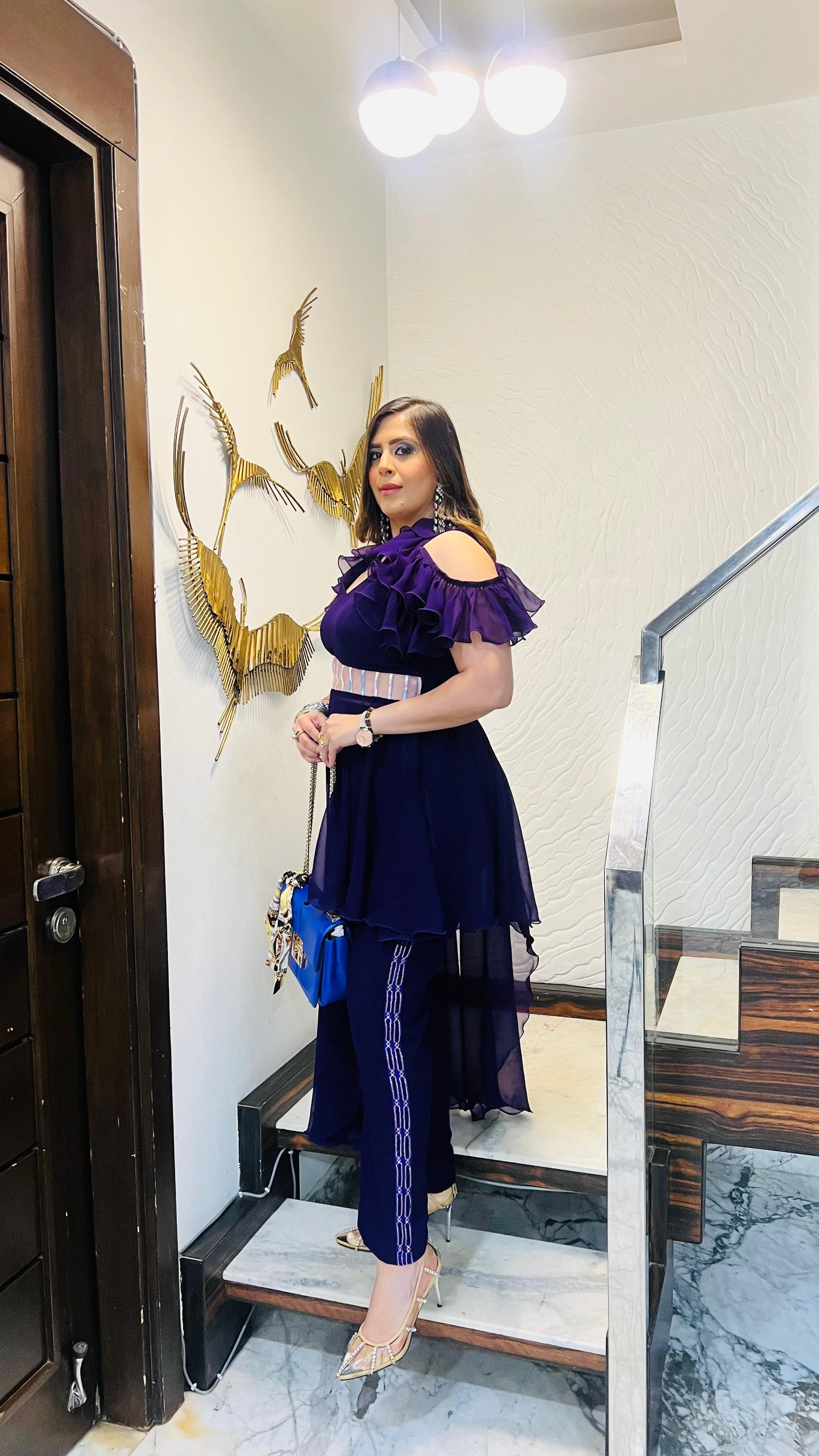 Elevate your style with this stunning Purple Holographic Co-Ord ✨. Featuring ruffled sleeves and a chic asymmetrical silhouette, this outfit blends elegance and boldness, perfect for any fashionable occasion 💜. |