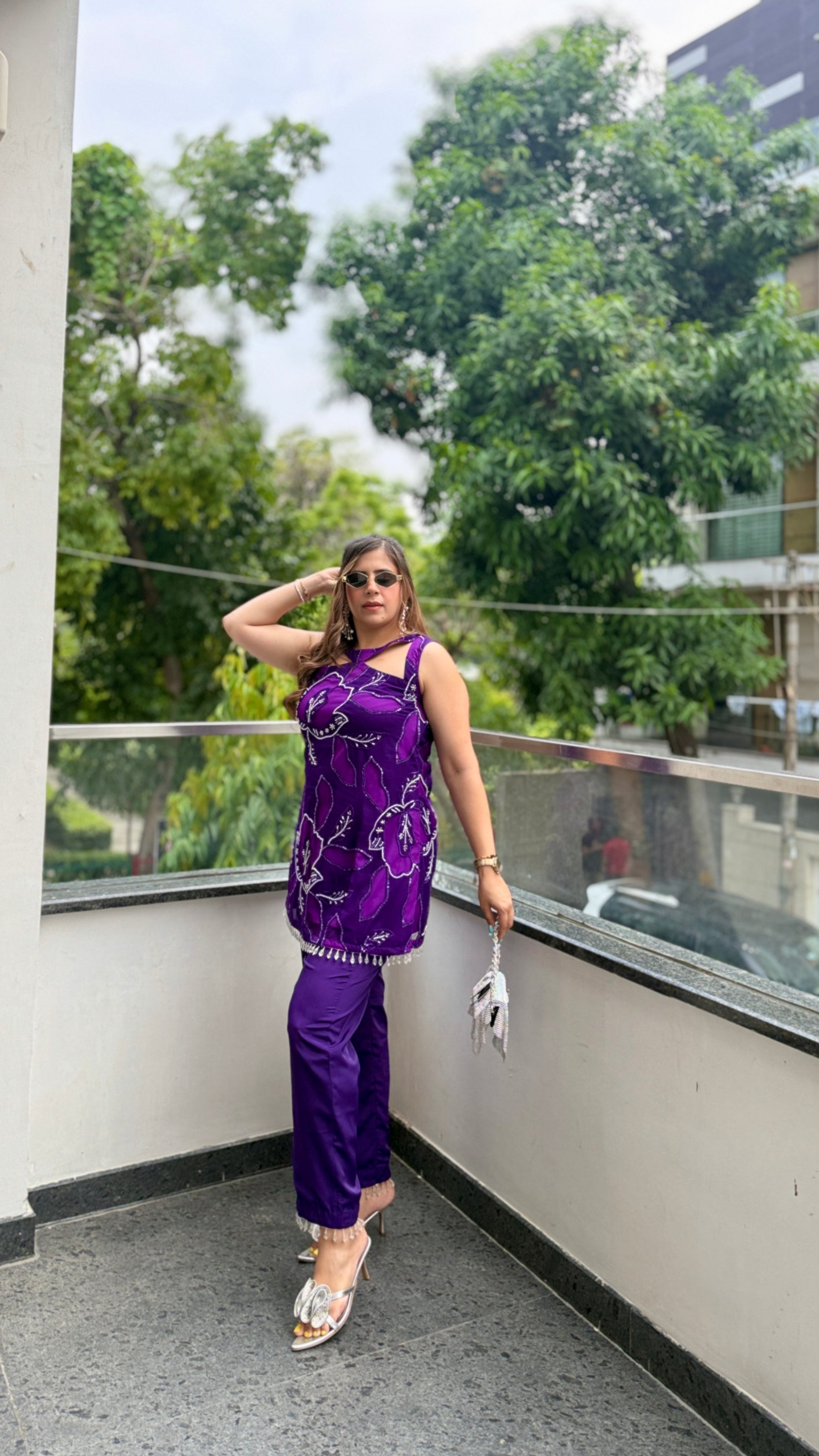 Turn heads in this Purple Paradise Co-Ord 💖✨ Featuring chic cut-out detailing, bold floral embroidery, and dramatic ruffle pants 🎀👖—perfect for your glam moments under the sun! 😎🌸💃 |