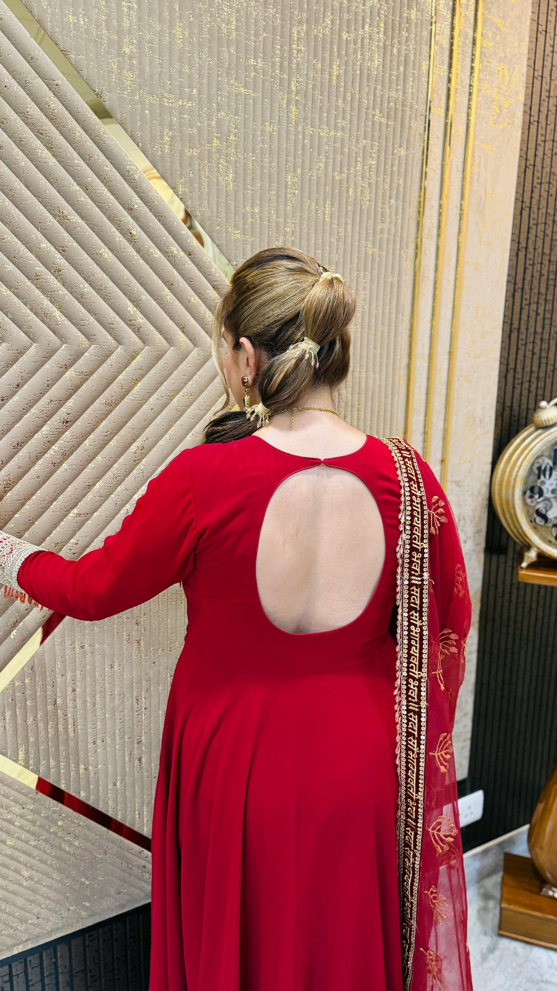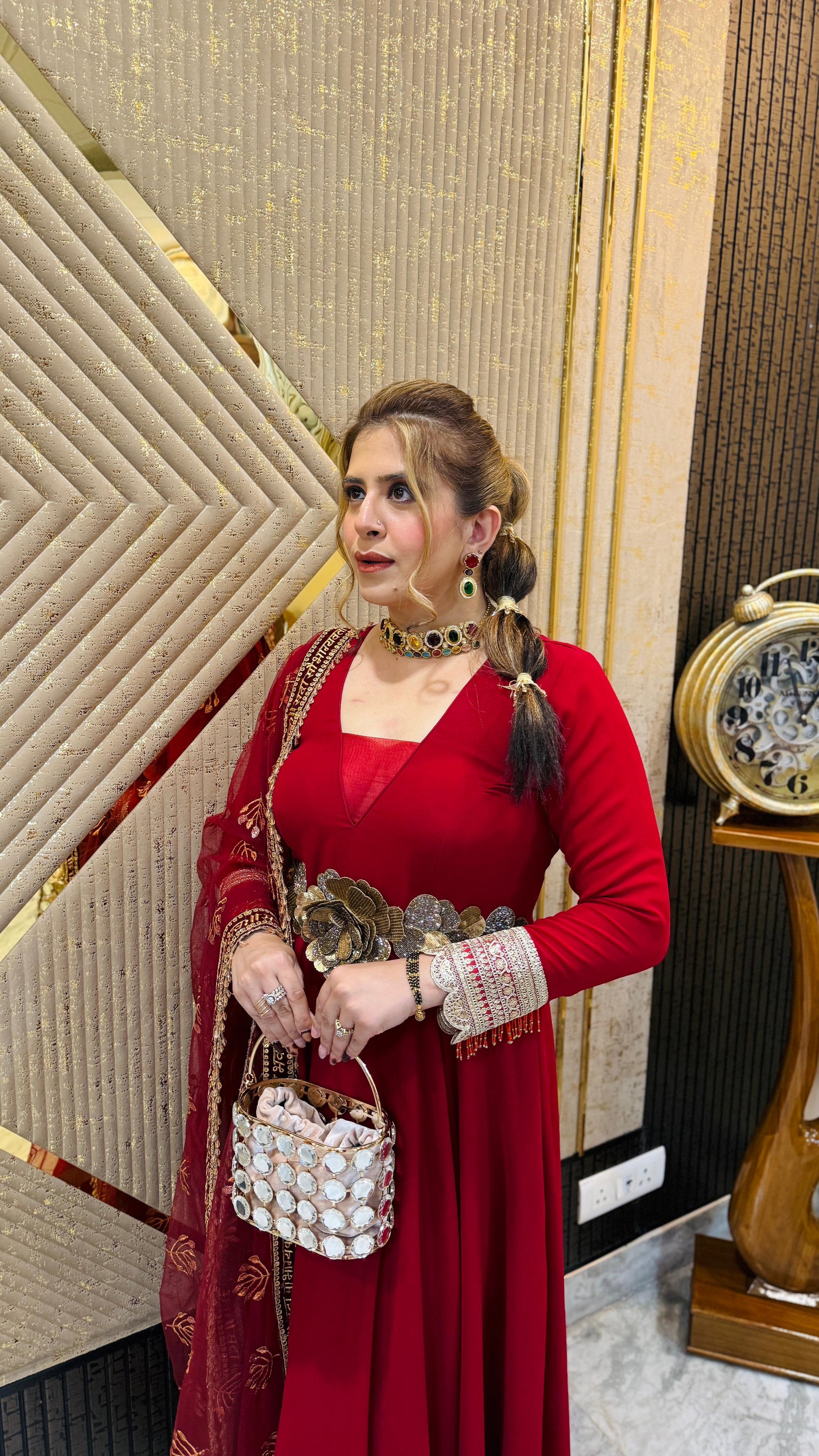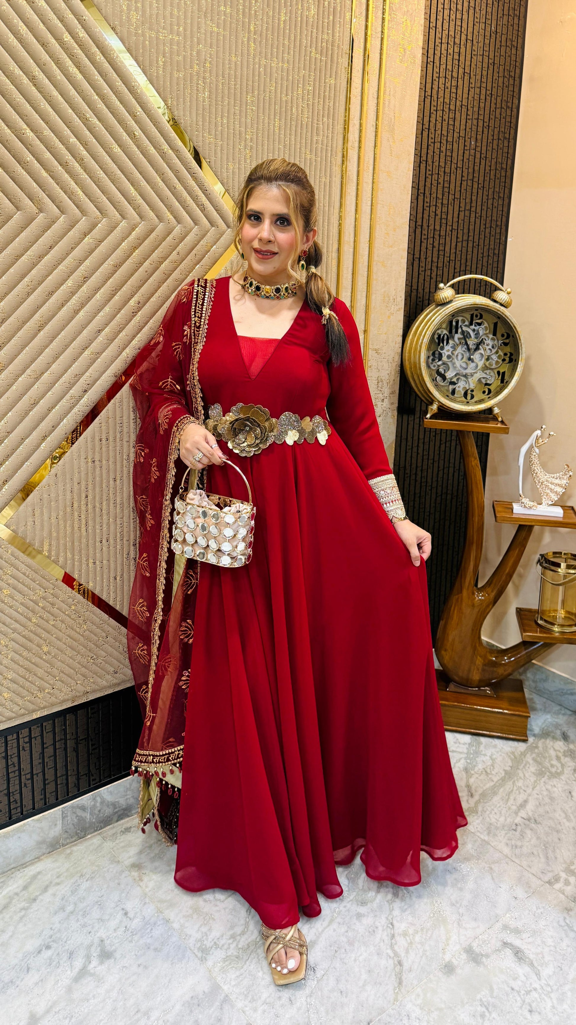 Stunning Maroon Festive Anarkali โค๏ธ๐ with deep neckline, flared silhouette ๐, and embroidered cuffs โจ. Paired with golden floral belt ๐ธ, embroidered dupatta ๐น, pearl potli ๐, statement choker ๐, and elegant heels ๐ . |