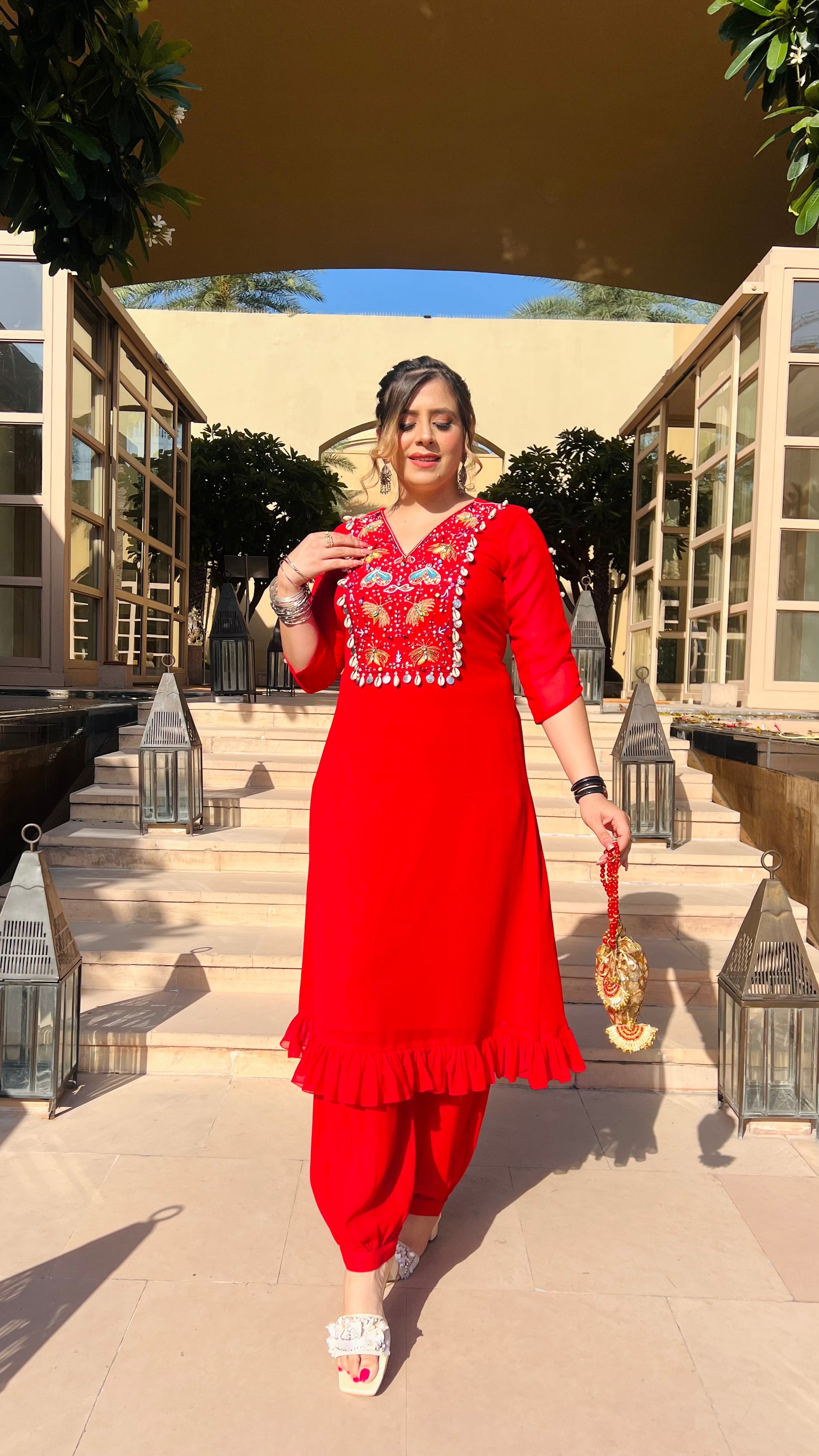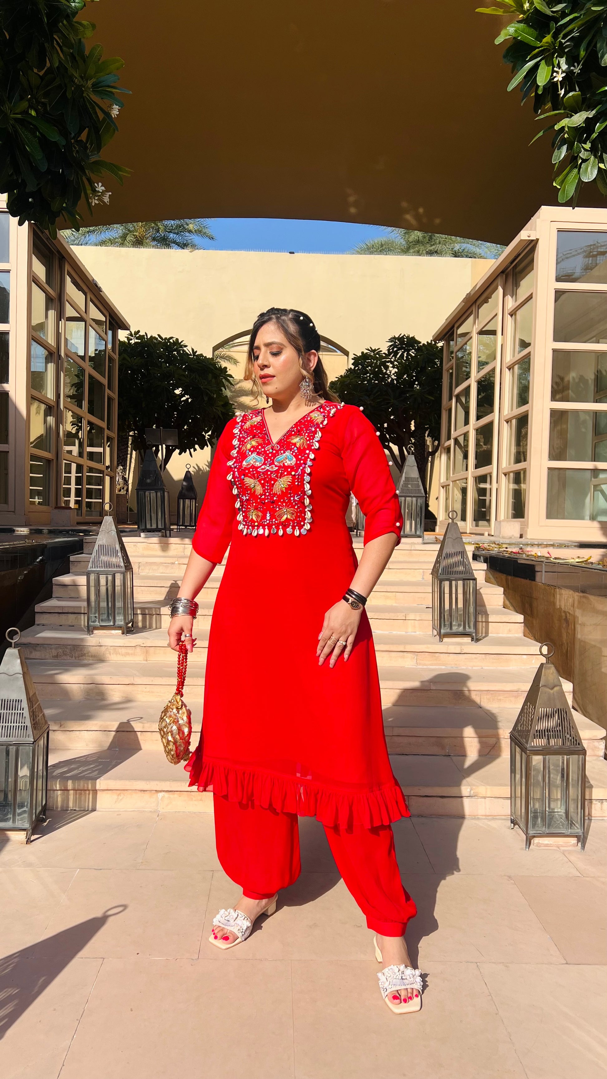 Stylish and comfortable. Classy Suit for your Festive wear in Georgette fabric. Enhanced with Harrom pants , this set is ideal for your Festive Party life