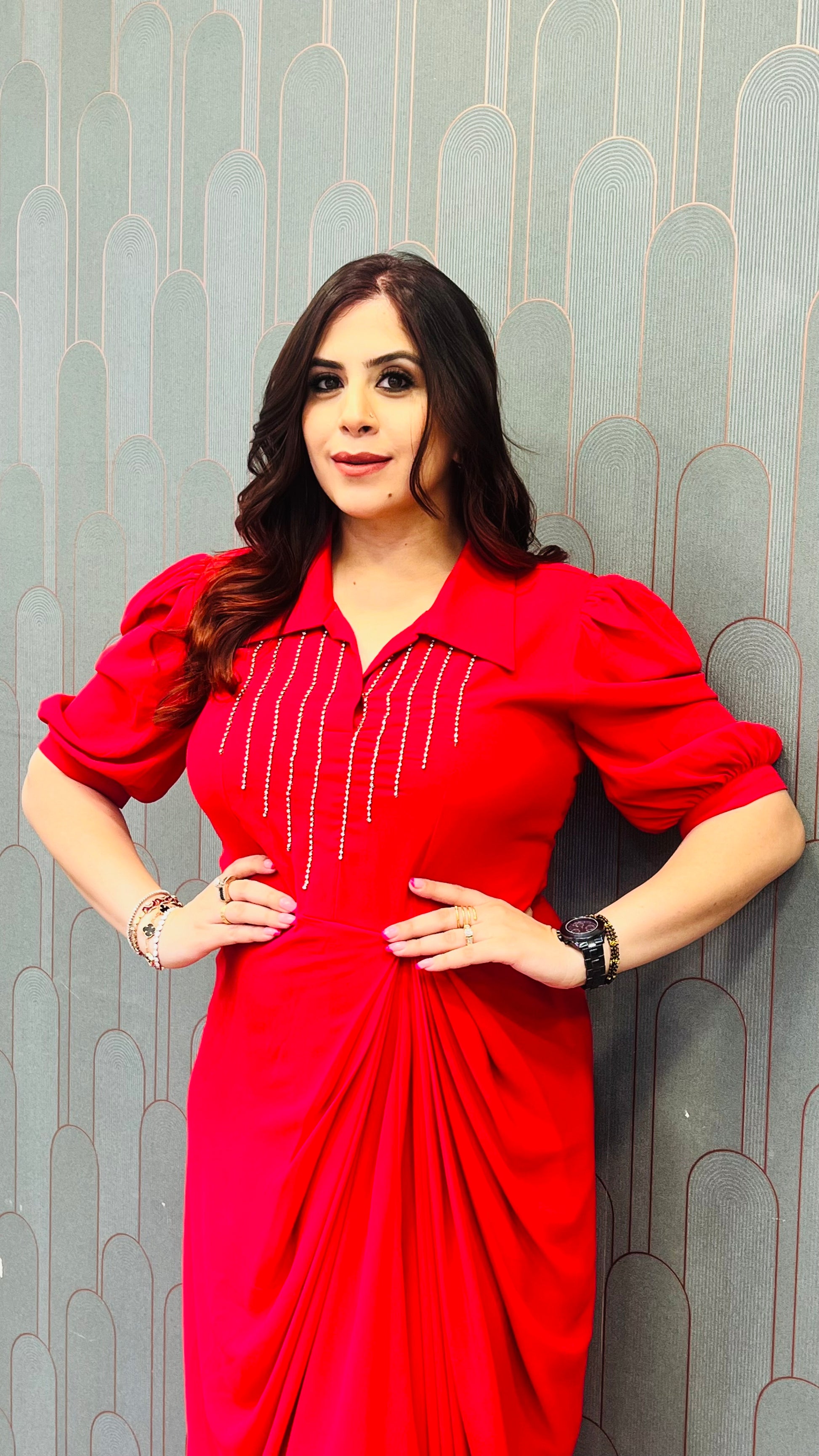 This stunning Red Swarovski Drape features elegant ruching and delicate embellishments along the neckline, creating a refined yet glamorous look. Paired perfectly with silver heels for a chic finish! ✨👠❤️ |
