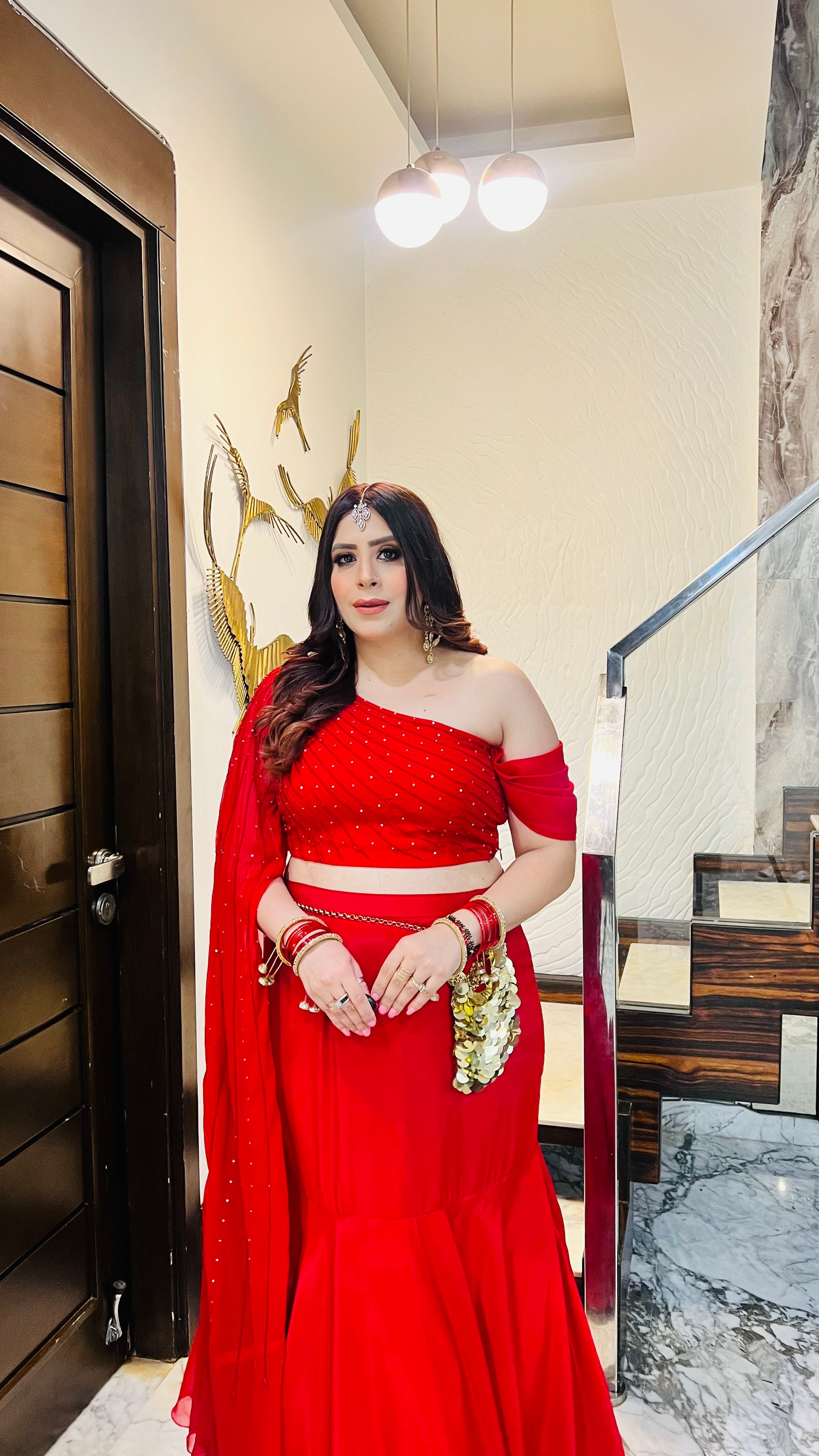 "Turn heads in the Red-Y Glow Fish Cut Lehenga! 🔥💃 With a flattering silhouette and radiant design, it's perfect for weddings and festive nights. Shine bright in style! ✨❤️ #LehengaLove" |
