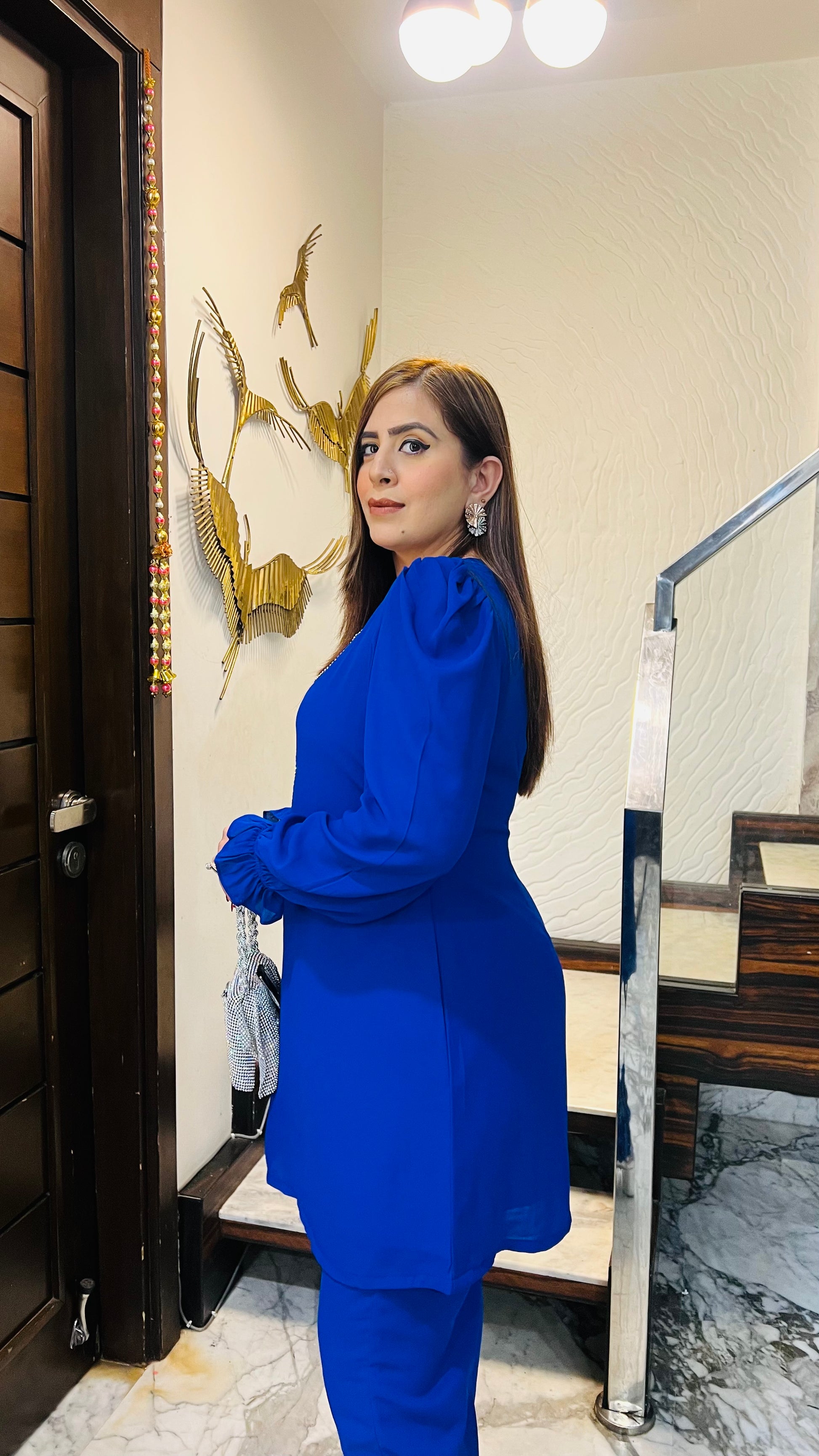 Royal Blue Bow Co-Ord 💙 featuring an elegant tunic adorned with a sparkling bow design ✨ and matching pants 👖. Styled with metallic silver heels 👠 and a dazzling clutch ✨. |