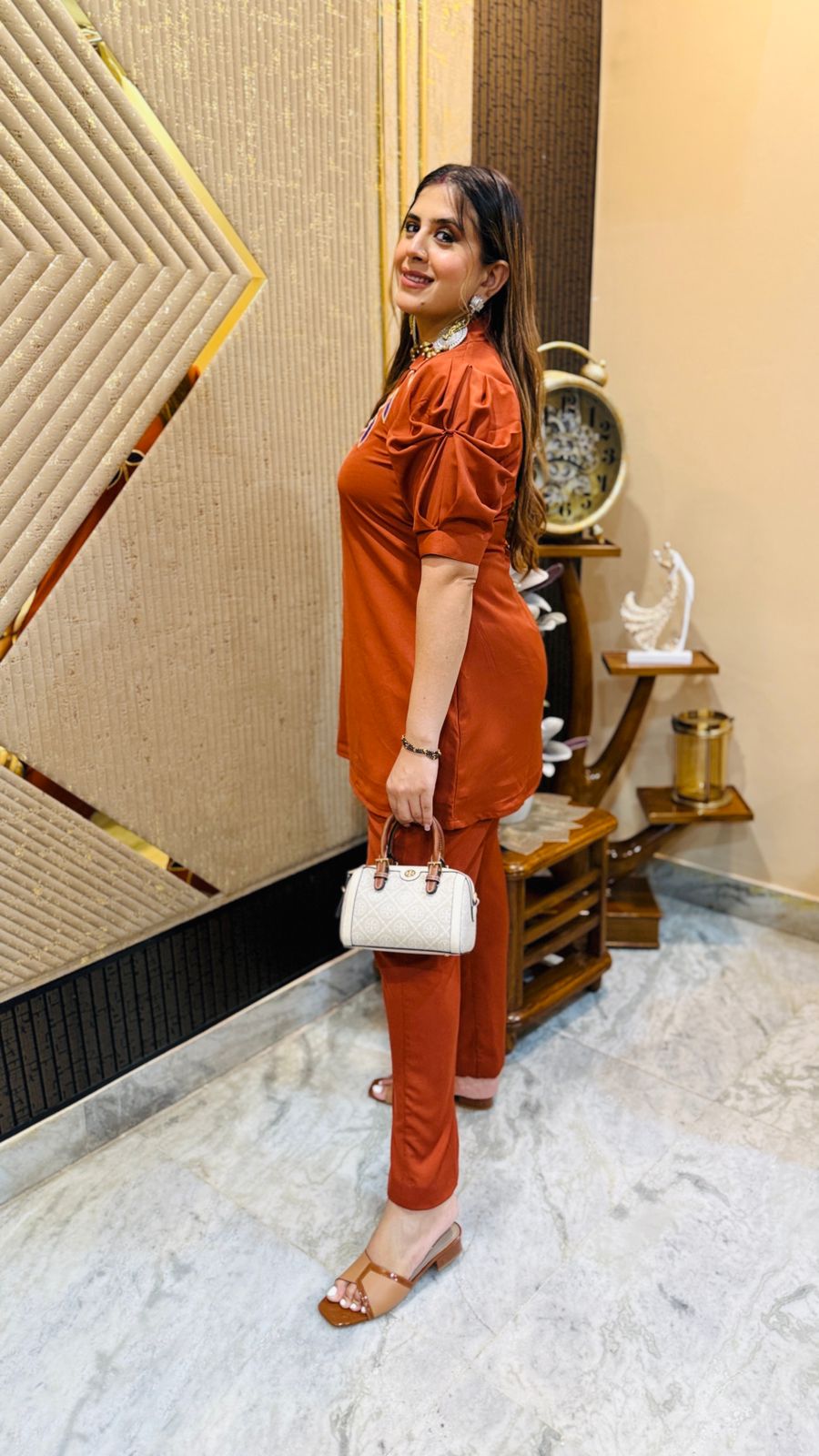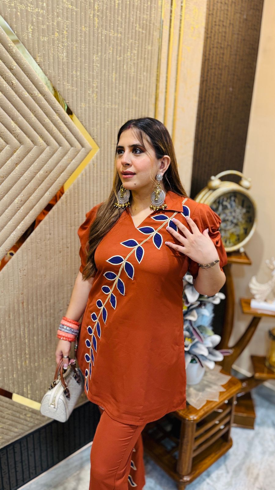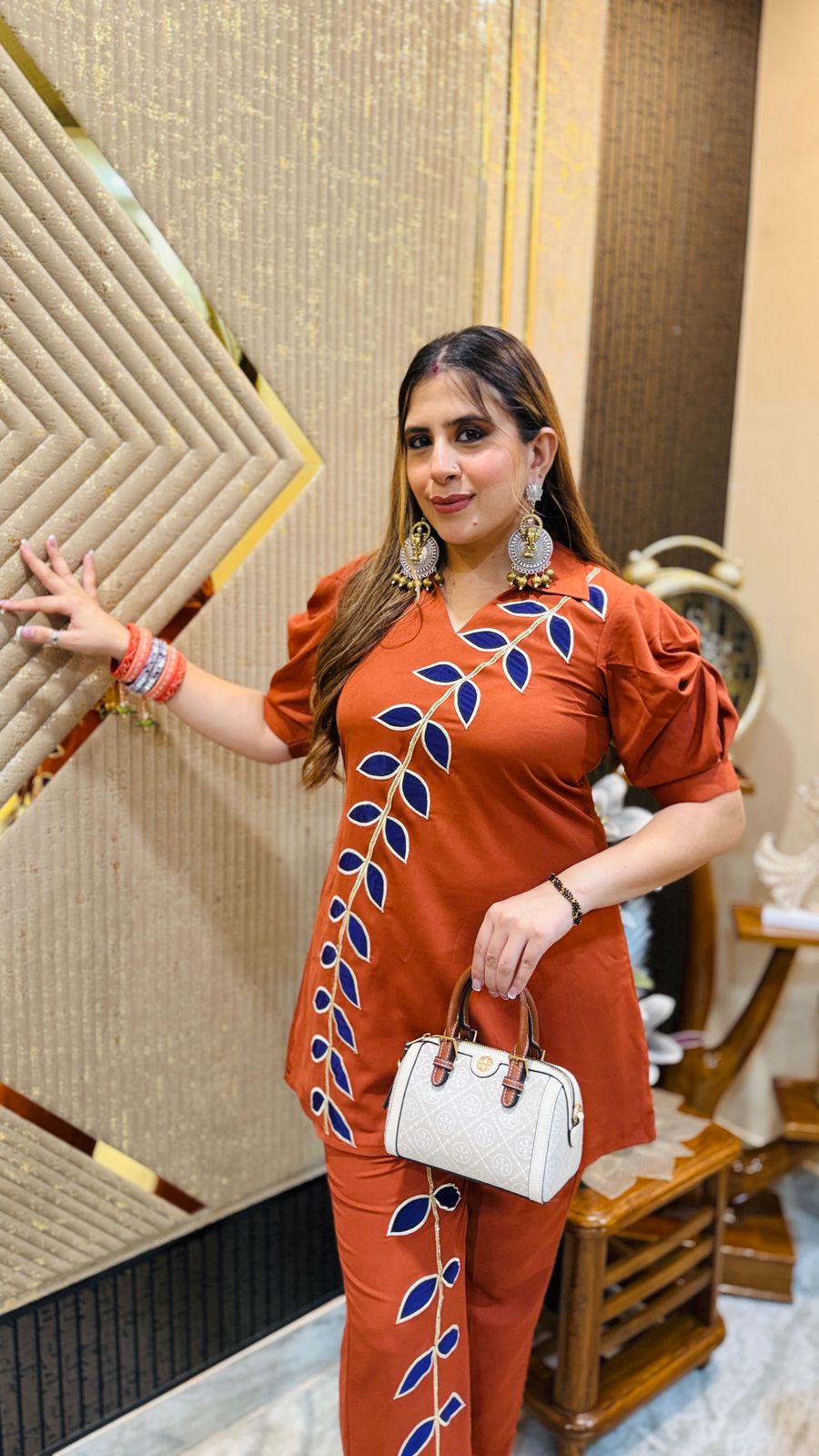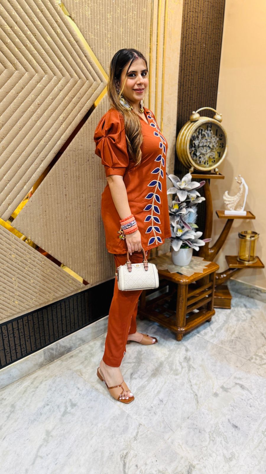 Stylish 🌟 Rust Purple Leaves Co-Ord featuring puff-sleeve kurta with bold leaf embroidery 🍃 running across the front, paired with matching straight pants 👖. Accessorized with statement earrings 💎, chic bangles 🎀, mini bag 👜, and tan flats 👡. |
