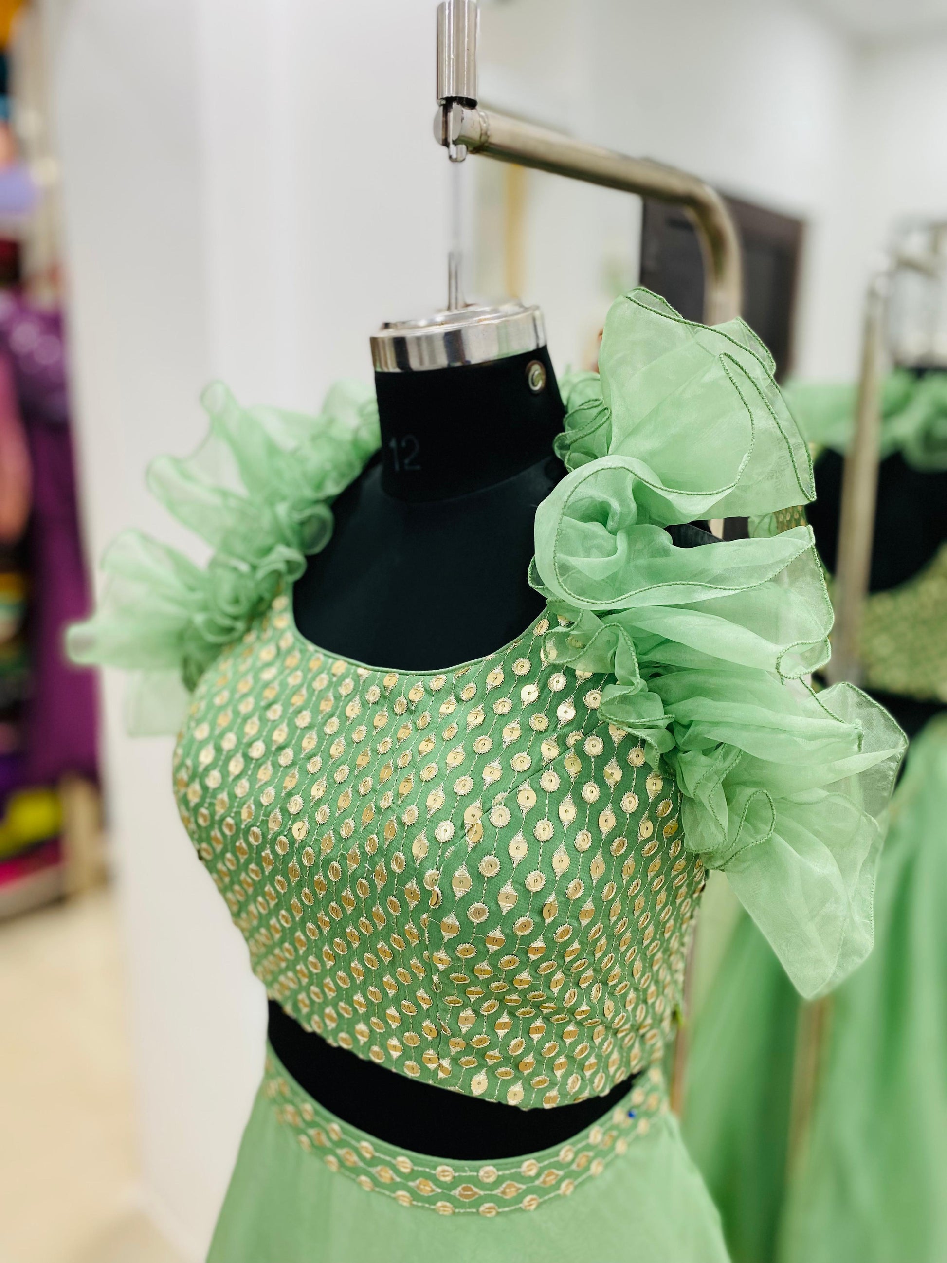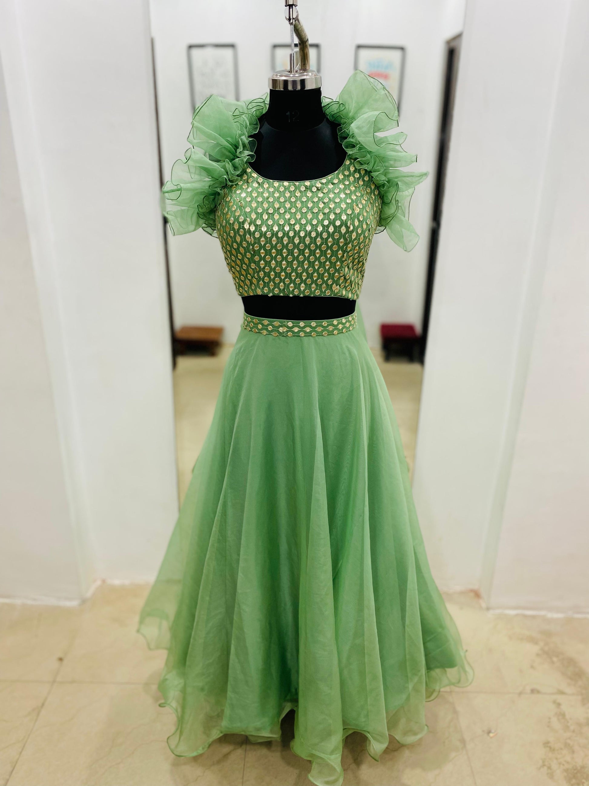 Sage Green Organza Lehenga: 🍃 Embrace elegance with this ethereal sage green lehenga, featuring intricate embroidery accents and a flowy organza dupatta. Perfect for adding grace to any celebration! ✨ |