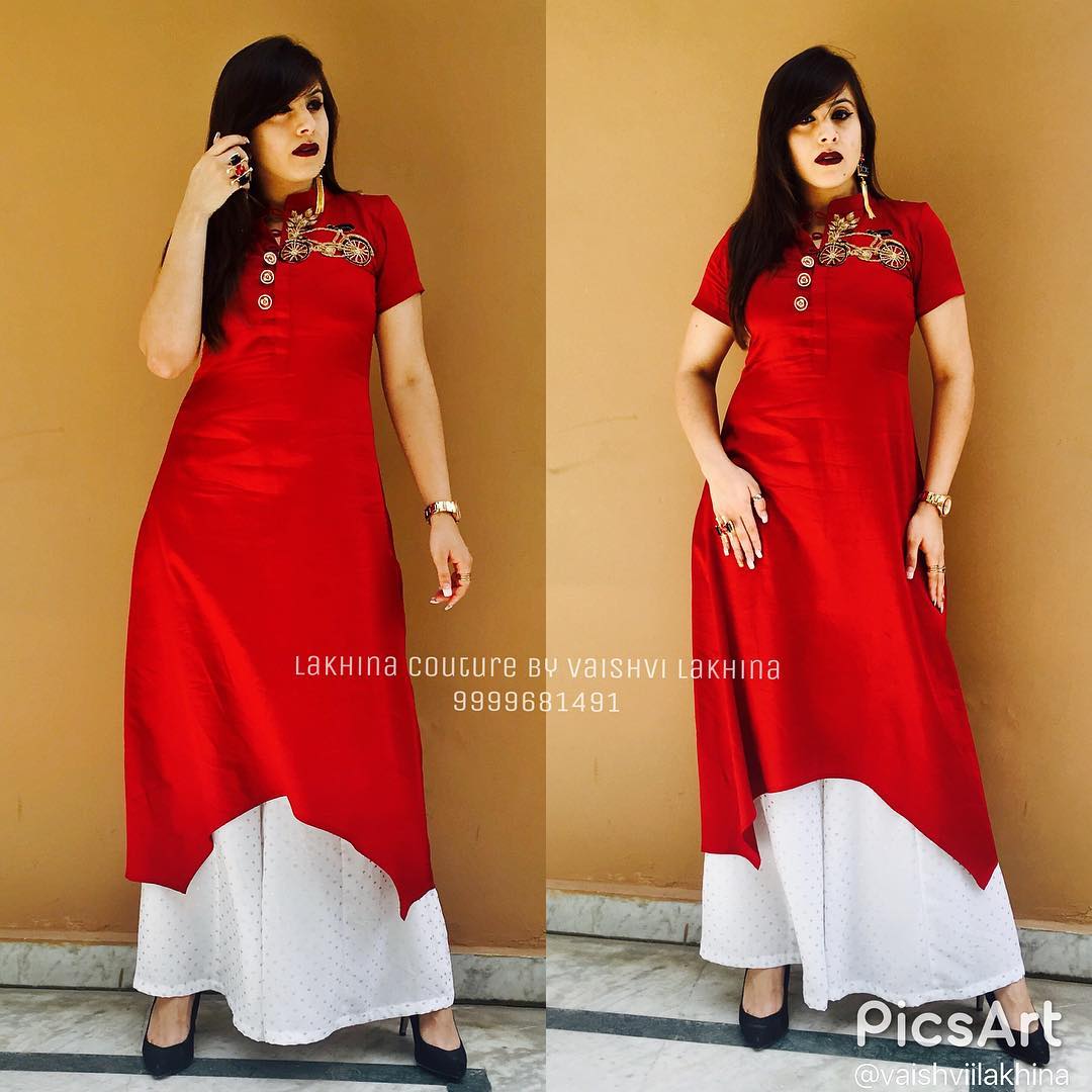 Glacé go ofor n asymmetrical hemline kurti with embroidered cycle and fancy buttons!
