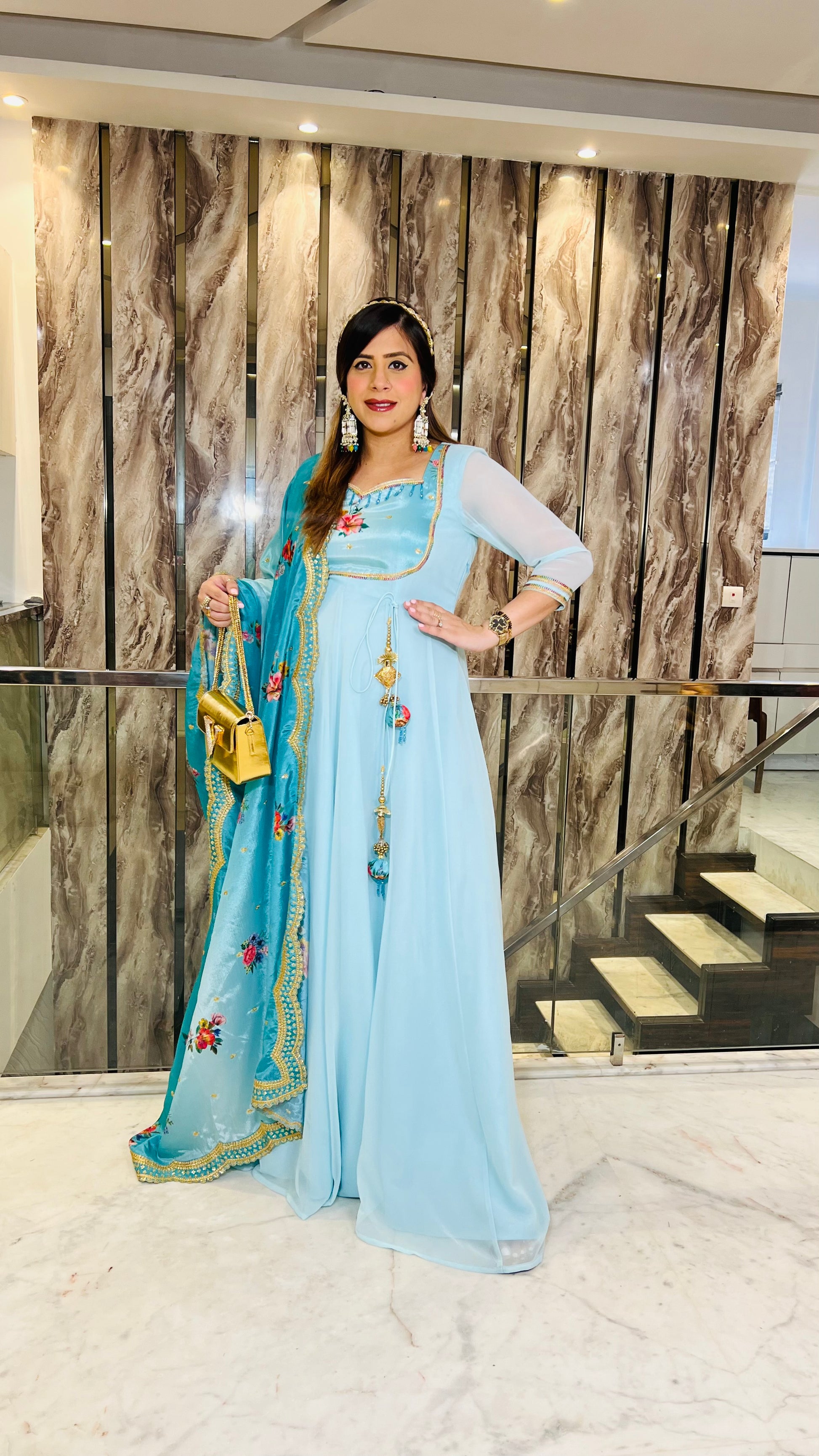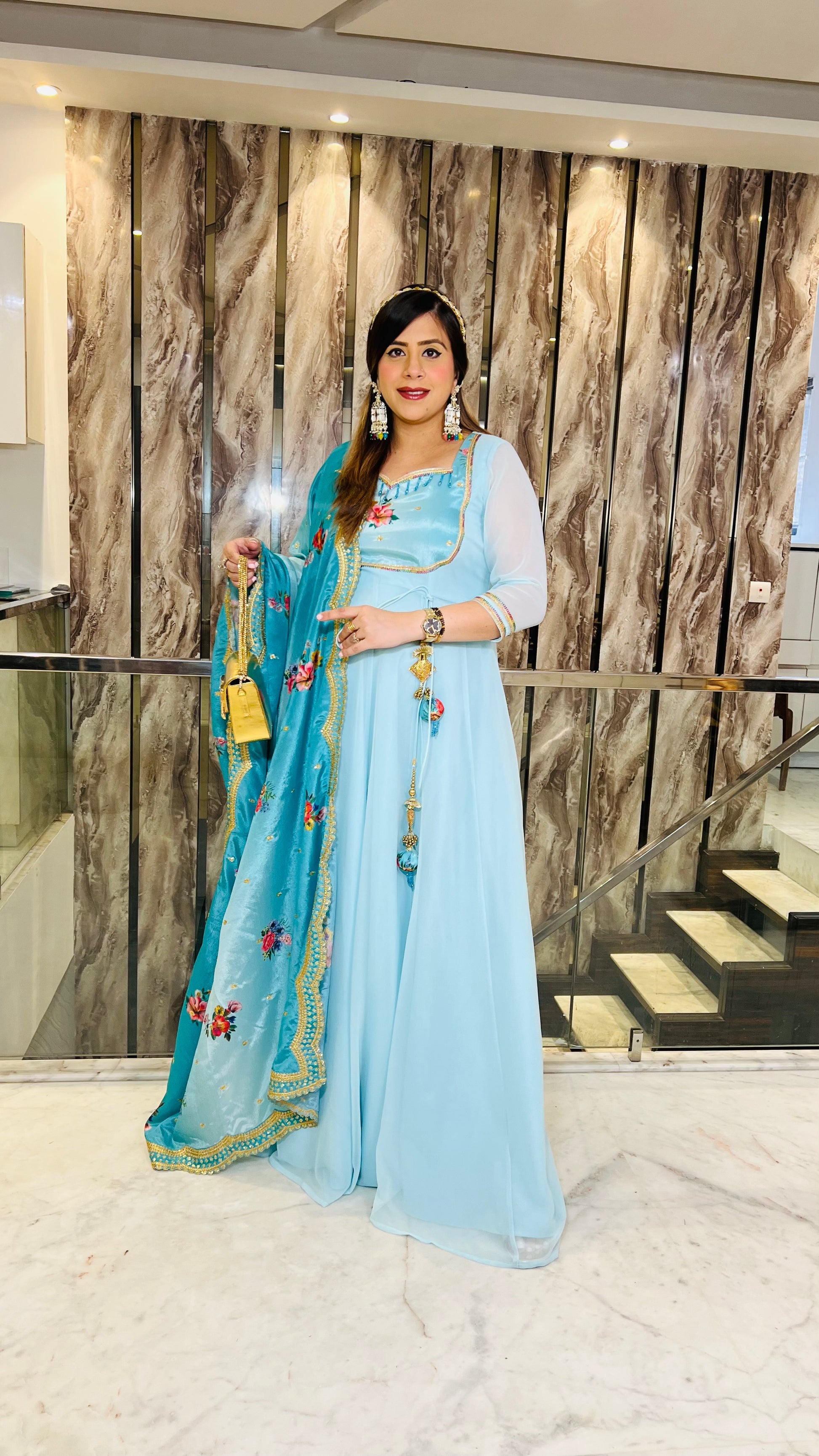Embrace the gentle hues of summer skies in the ethereal beauty of the Sky Blue Anarkali, a graceful ensemble for warm days and dreamy nights." ☁️💙🌞 |