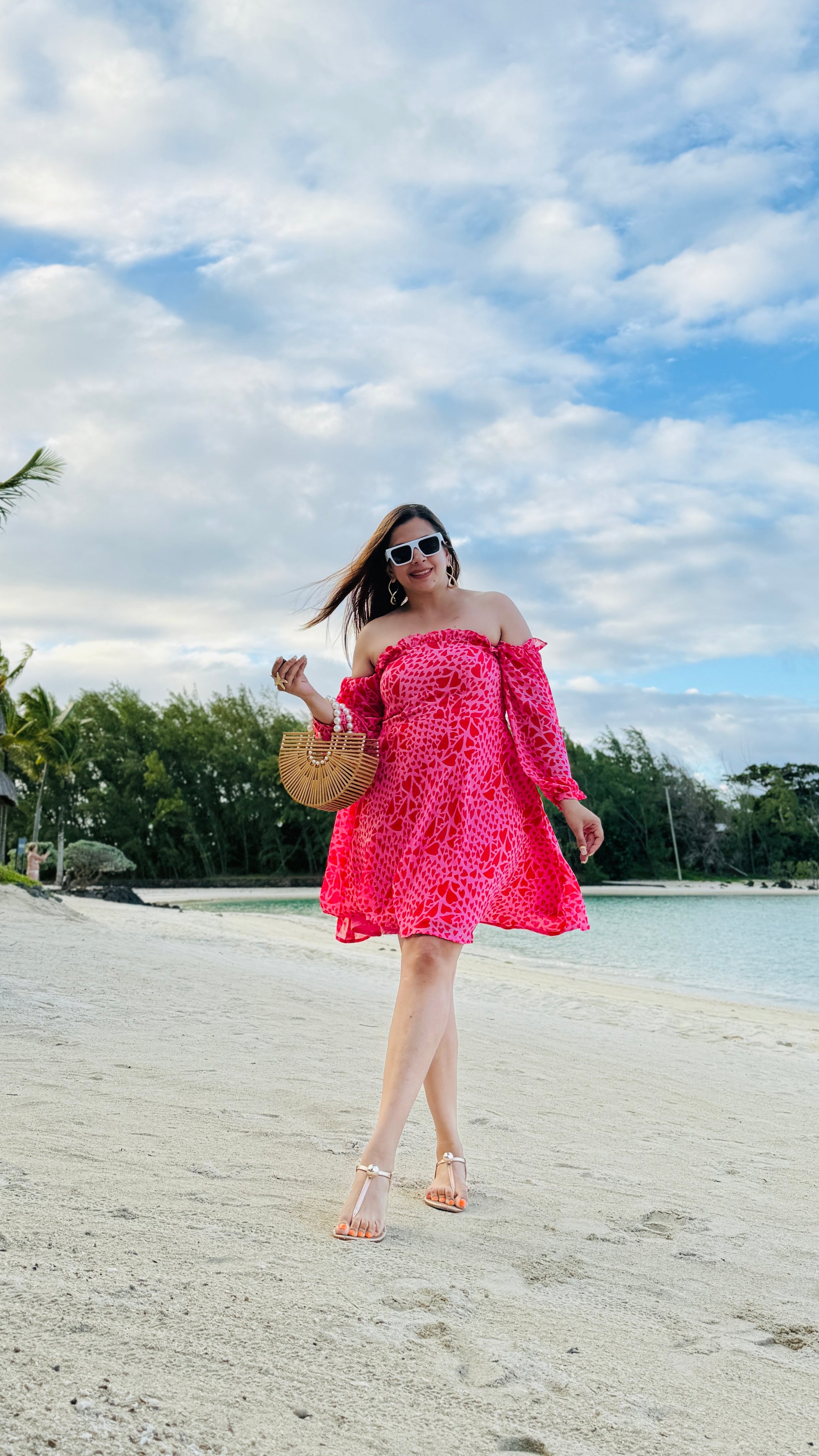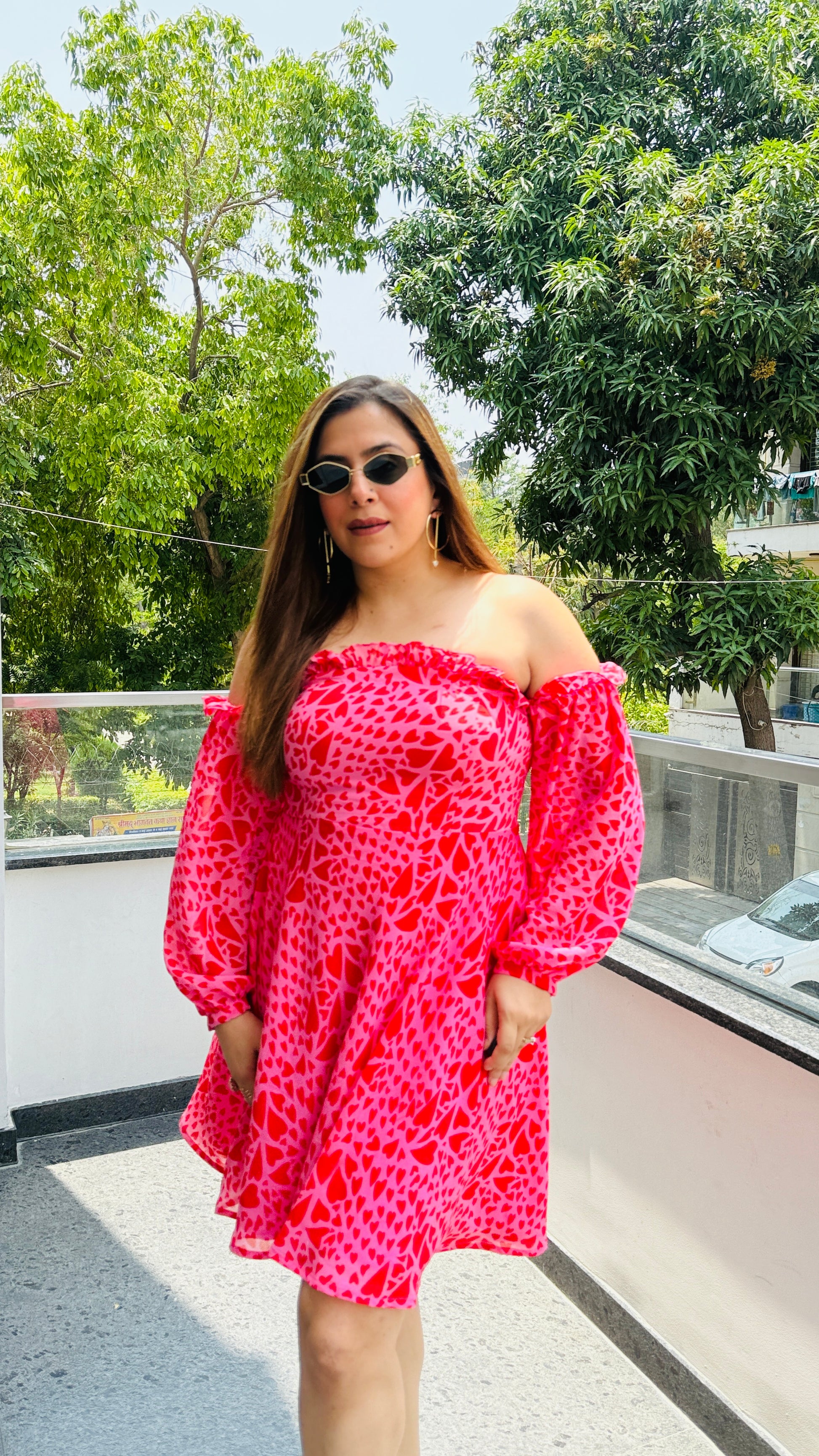 Turn heads in the Stolen Hearts Off-Shoulder Dress 💘—a vibrant pink and red heart-print flare dress with balloon sleeves and a ruffled neckline. Perfect for brunch or a romantic day out! 💃🌸 |