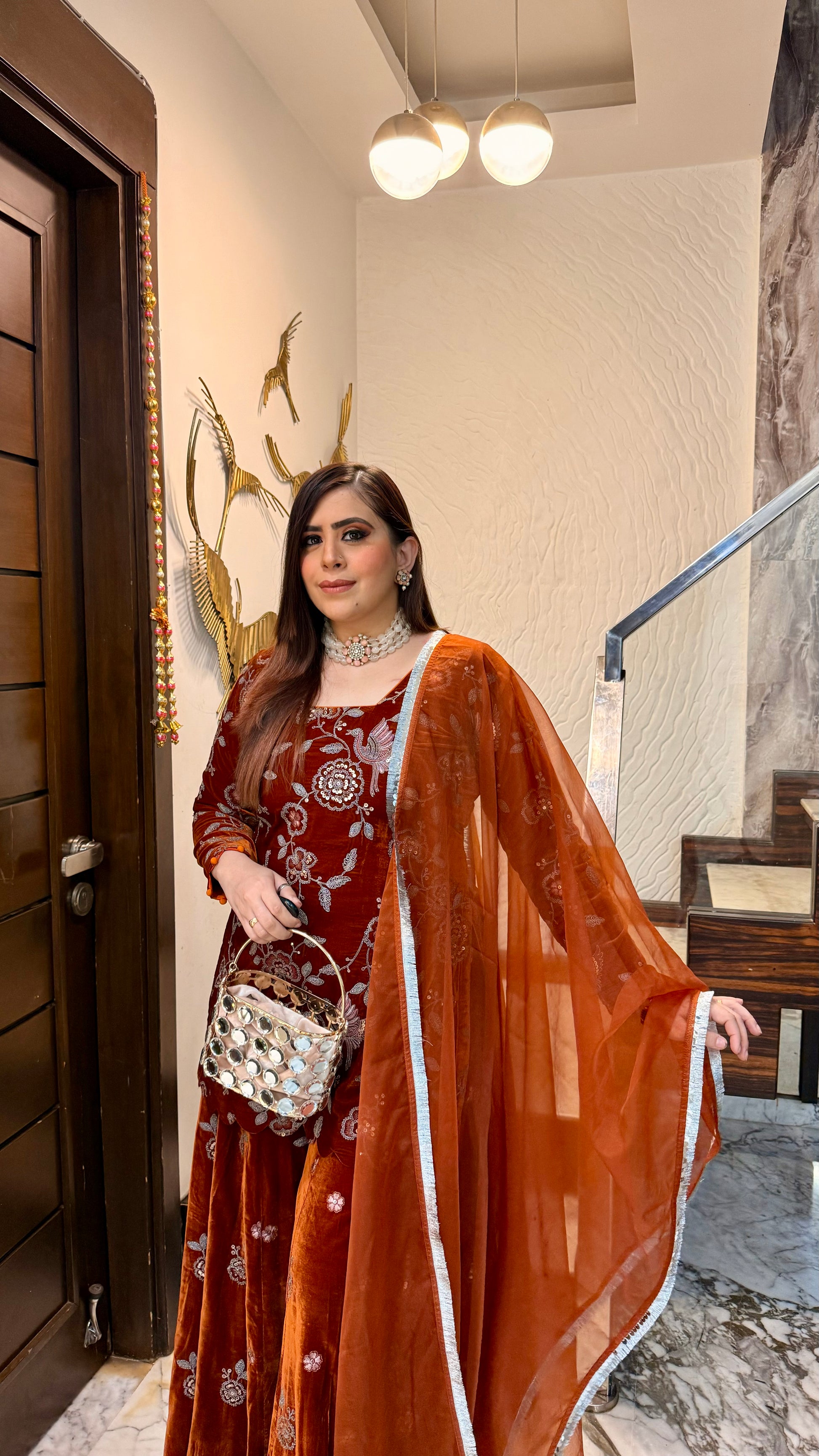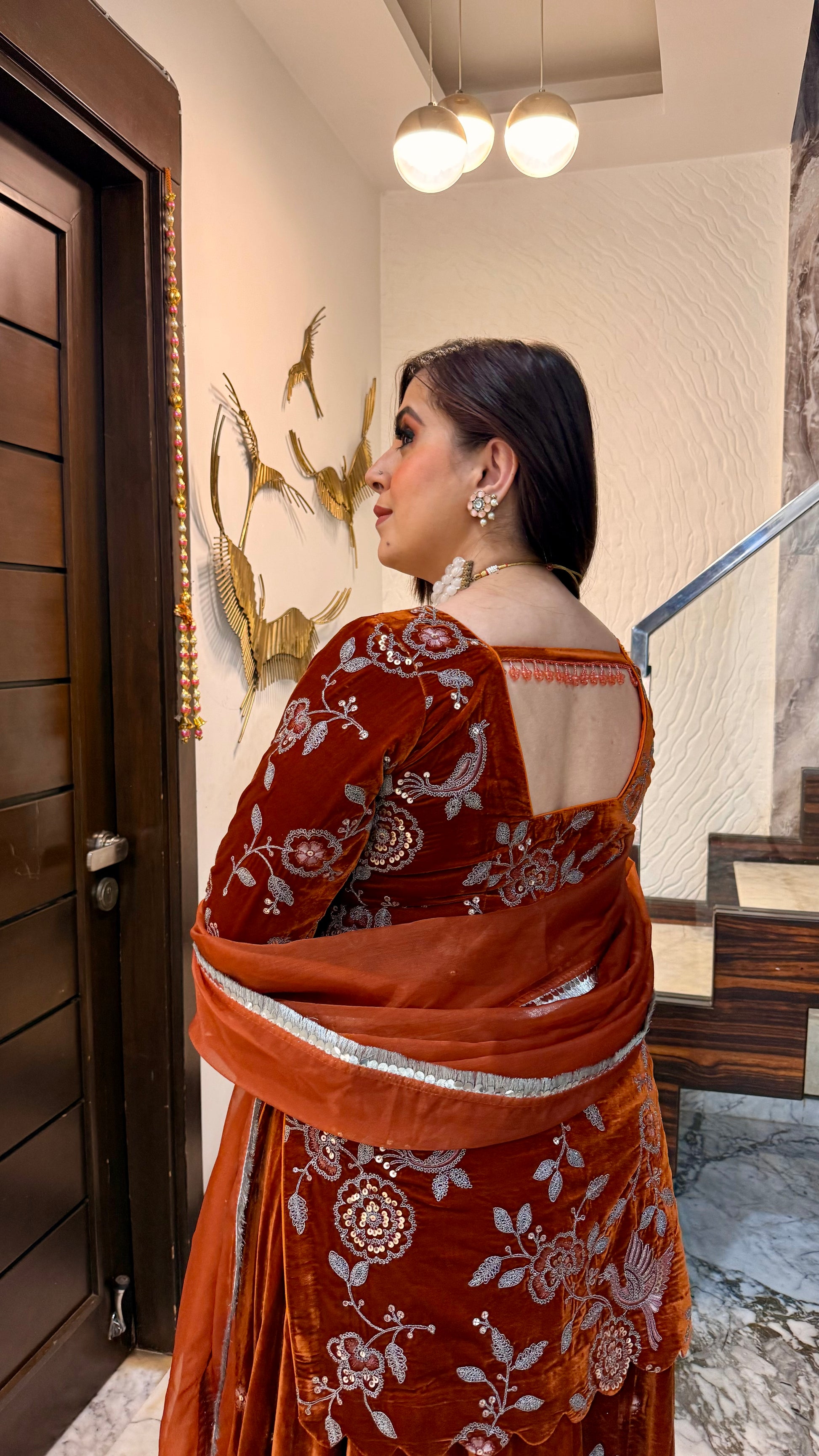 This Sunset Radiance Sharara Suit features intricate floral embroidery, a flowy dupatta with silver edging, and a glamorous silhouette. Perfect for festive evenings, it radiates elegance and charm. 🖤✨🌸 |