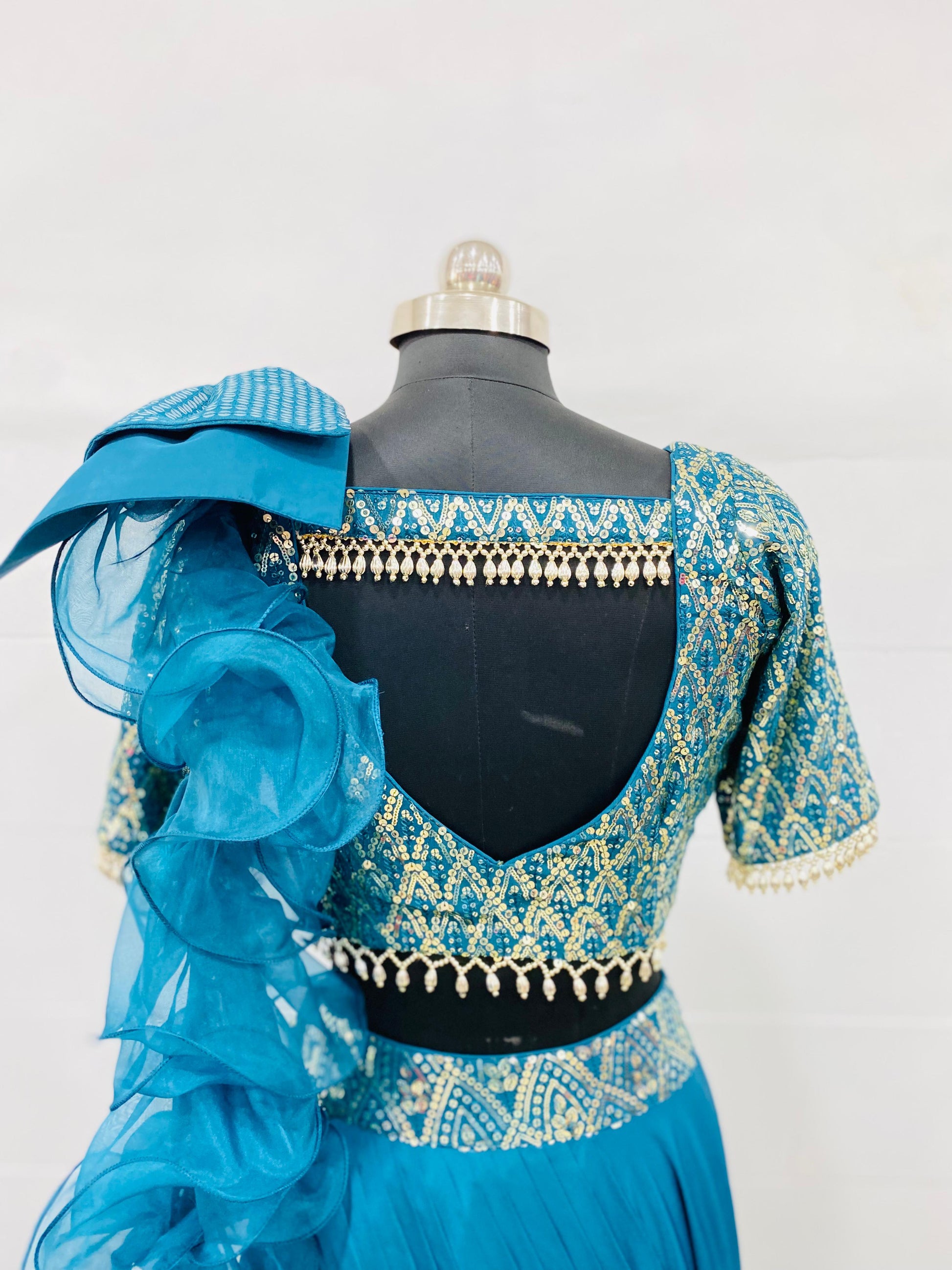 This Teal Glam Embellished Lehenga Set features intricate gold embroidery, ruffled detailing, and a flowing silhouette. Perfect for weddings or festive occasions, it adds a regal and modern touch. 💫👗 #FestiveGlam