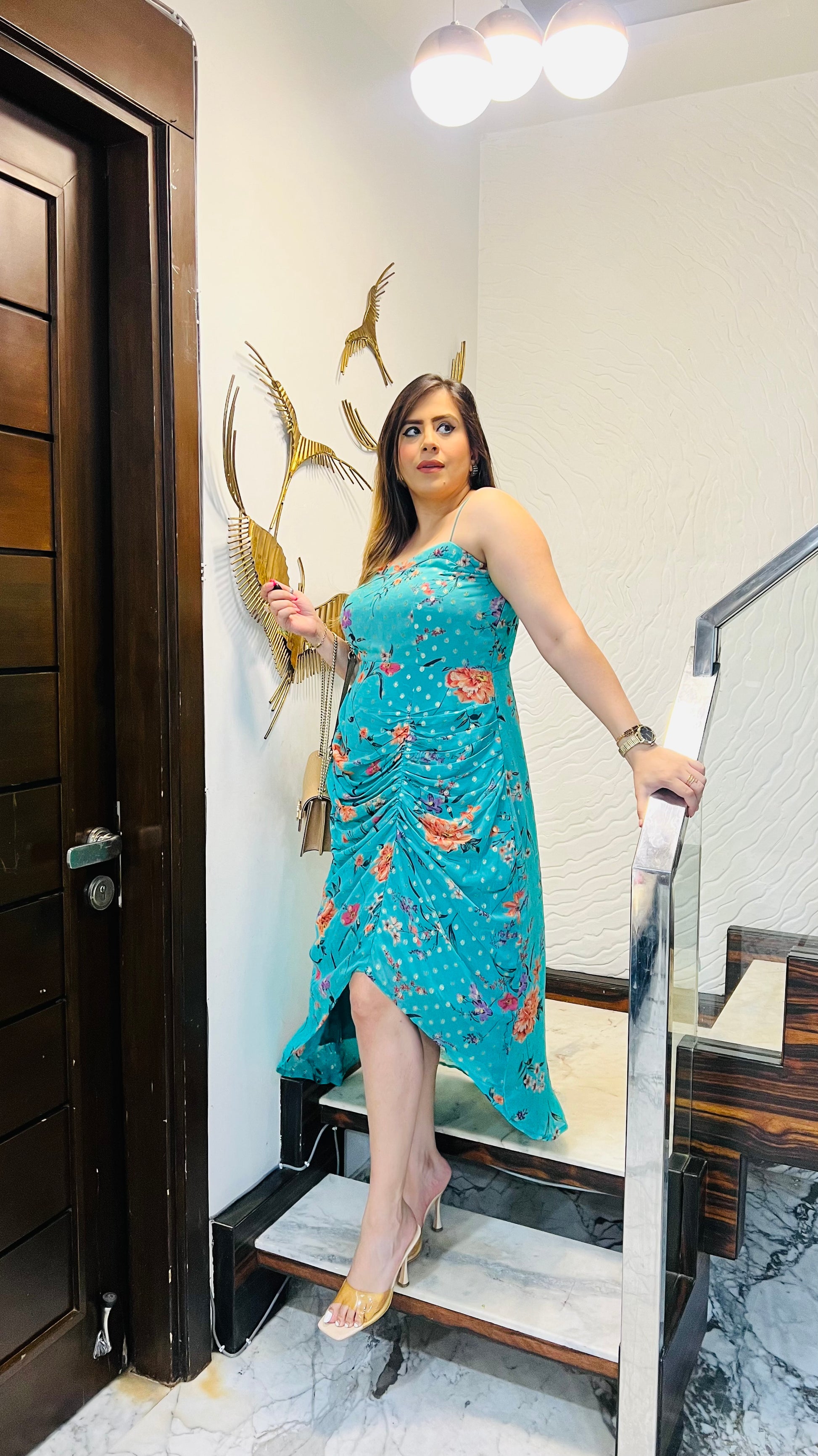 A stunning teal lurex midi dress adorned with vibrant floral prints and delicate ruching. The spaghetti straps and subtle shimmer create an effortlessly elegant look, perfect for any special occasion! 🌸✨ |