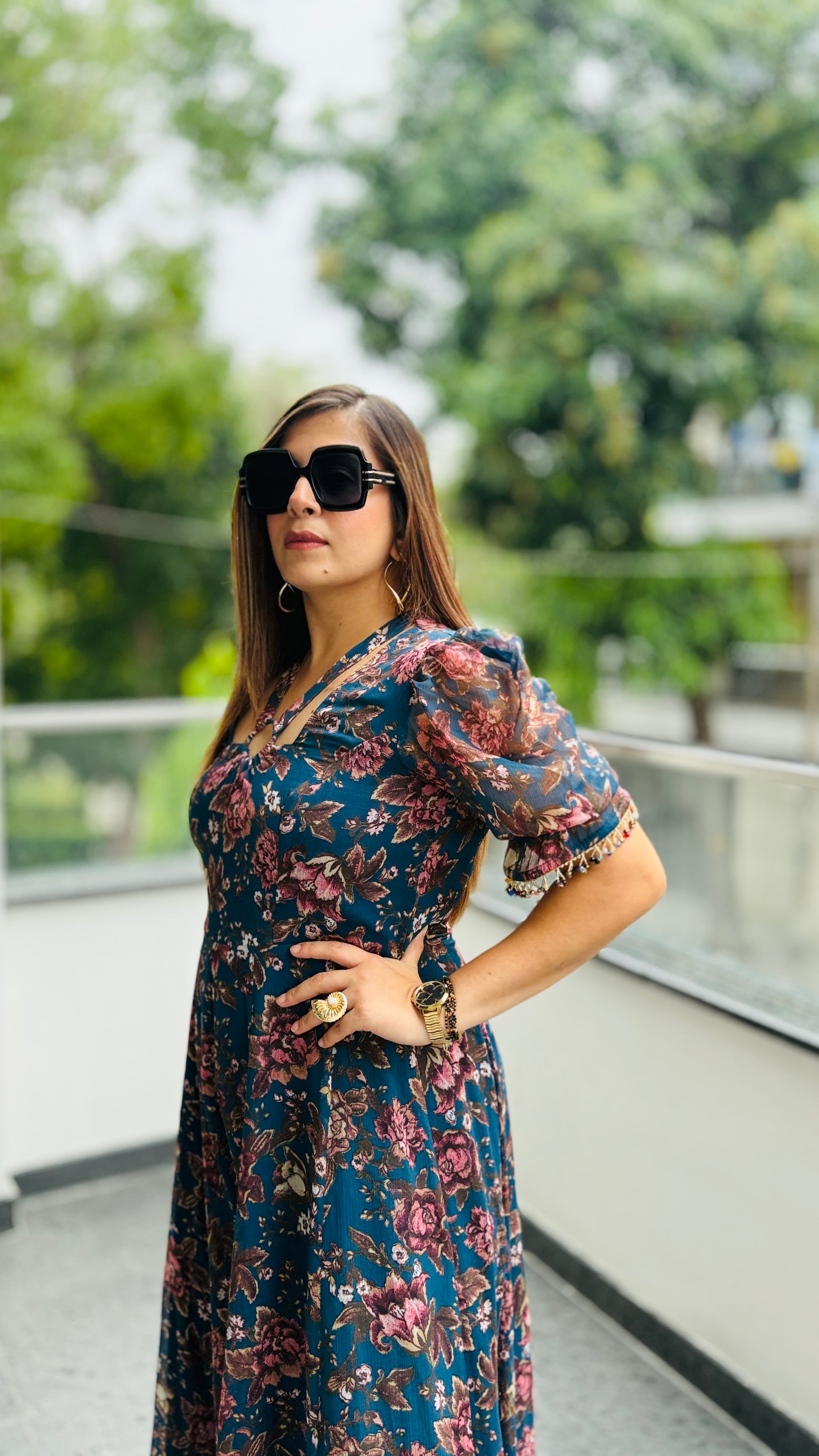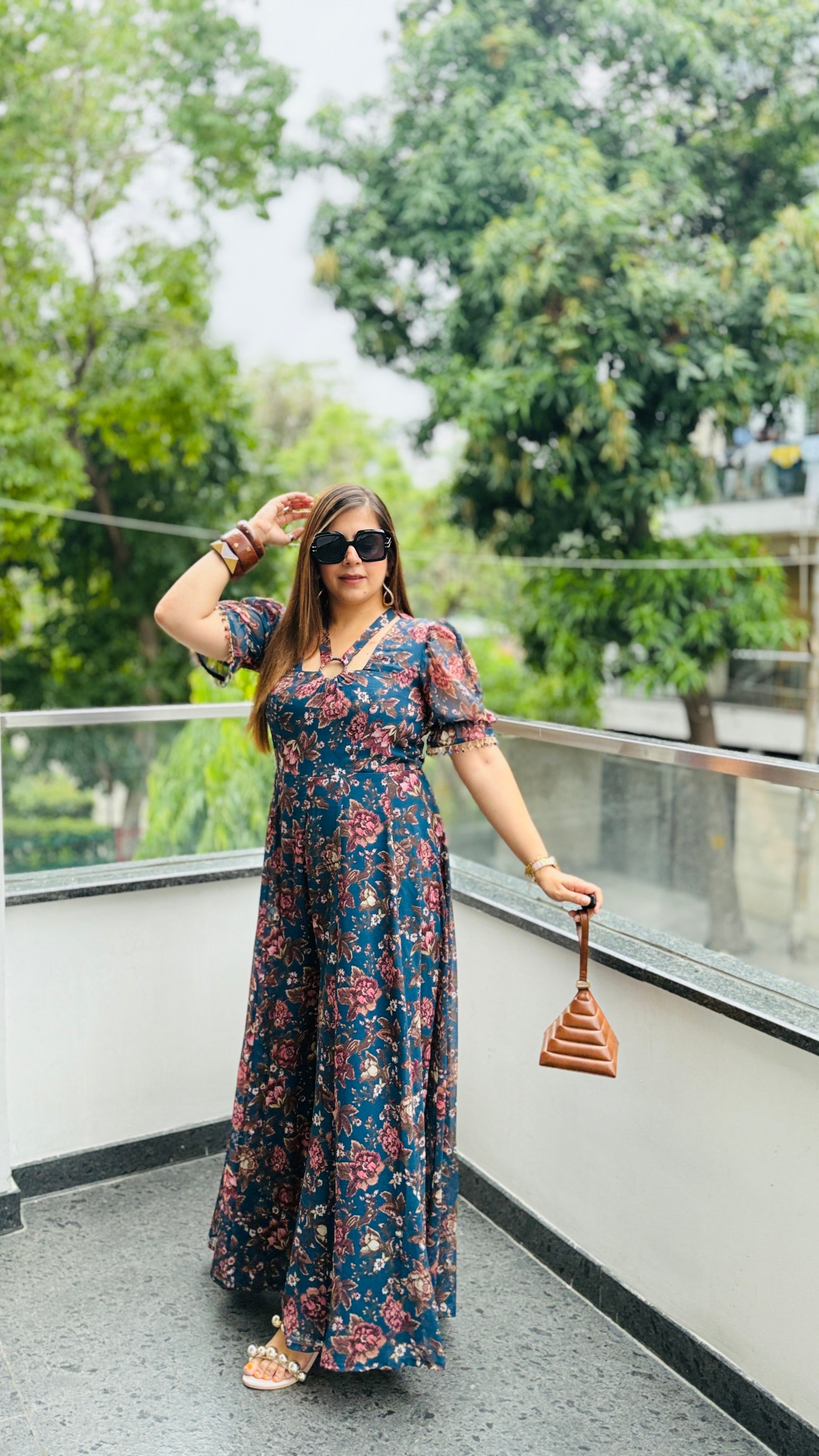 Turn heads in this teal floral jumpsuit featuring puffed sleeves with tassel details, a flattering Glass Shape with ring detailing-neckline & cinched waist. Perfect for festive flair & elegant comfort! 🌸🦚💃👑
