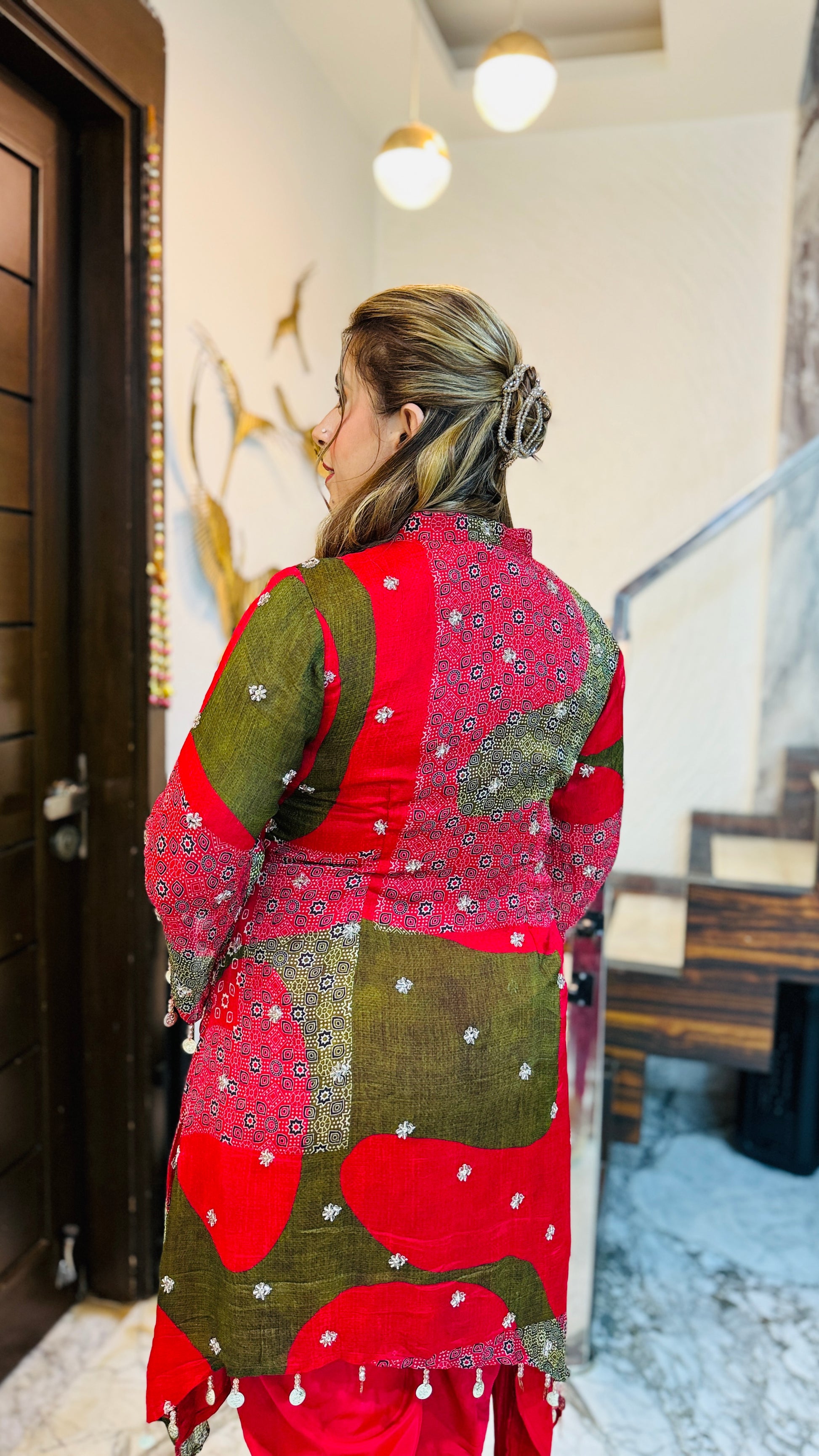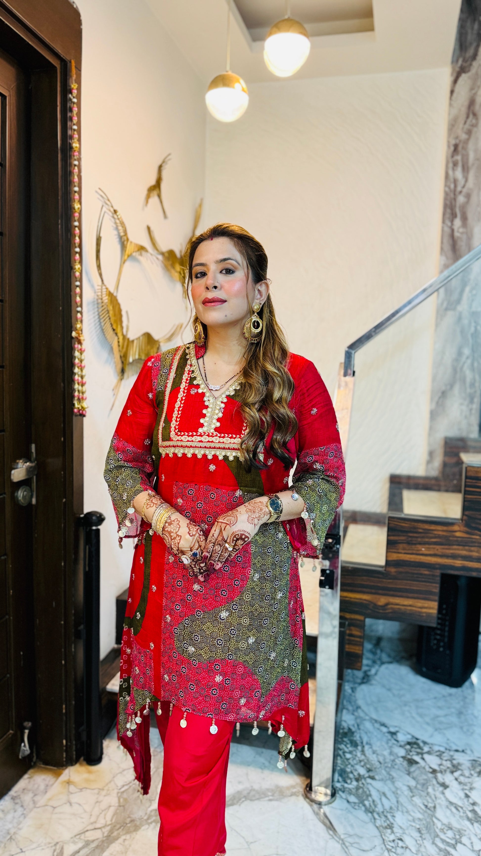 ✨ Vaishvi’s Sargi Look 🌸 – She shines in a vibrant red embroidered kurta with olive-green patchwork 💫 adorned with pearl lace details 🤍 paired with red pants and golden heels 👠💃 perfect festive charm! 🎉 |