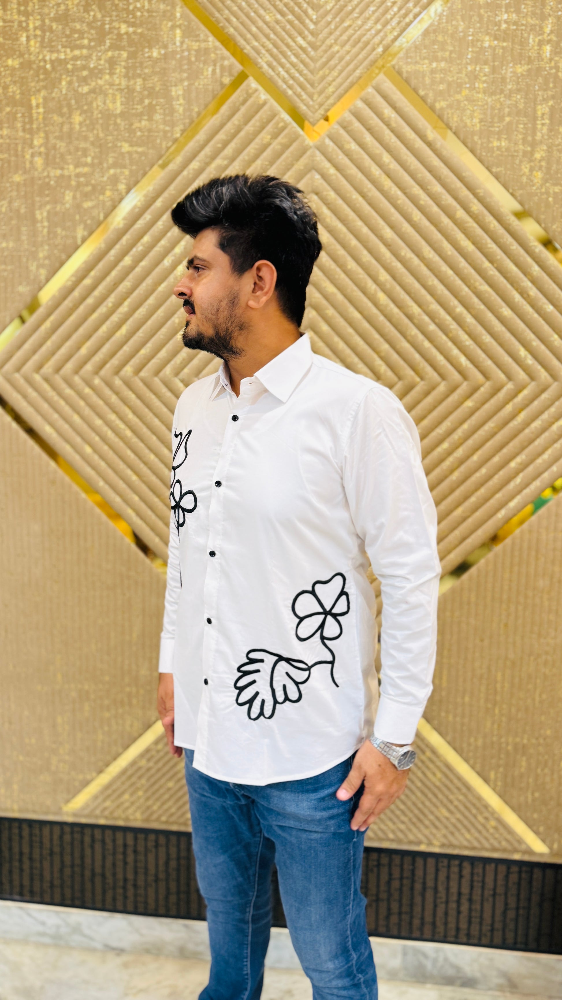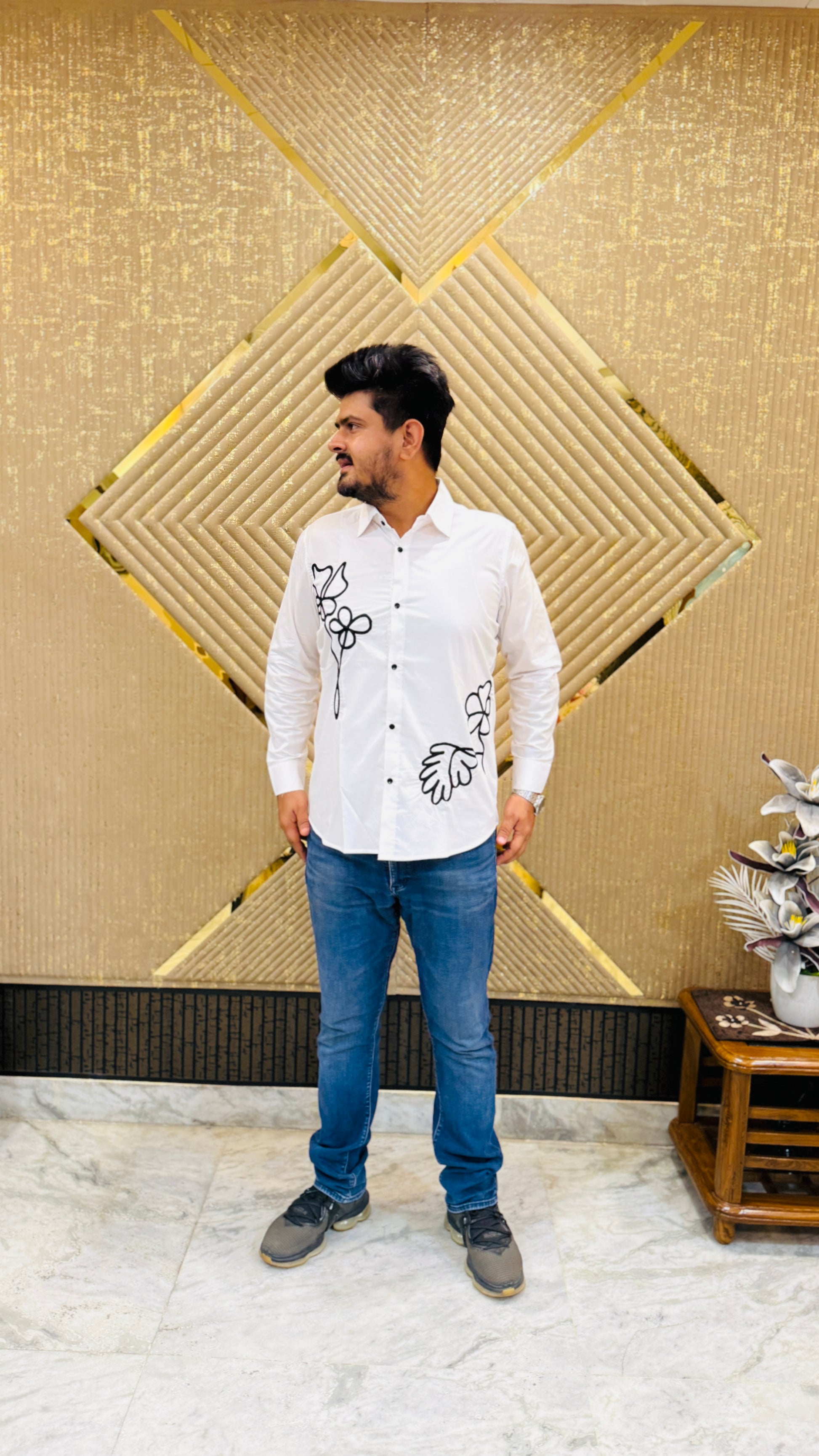 ๐ค Elegant White Embroidered Shirt featuring abstract black floral motifs ๐ธ๐ค, crisp button-down style ๐, and a tailored fit for modern sophistication โจ. Perfect for casual outings or semi-formal events ๐๐. |