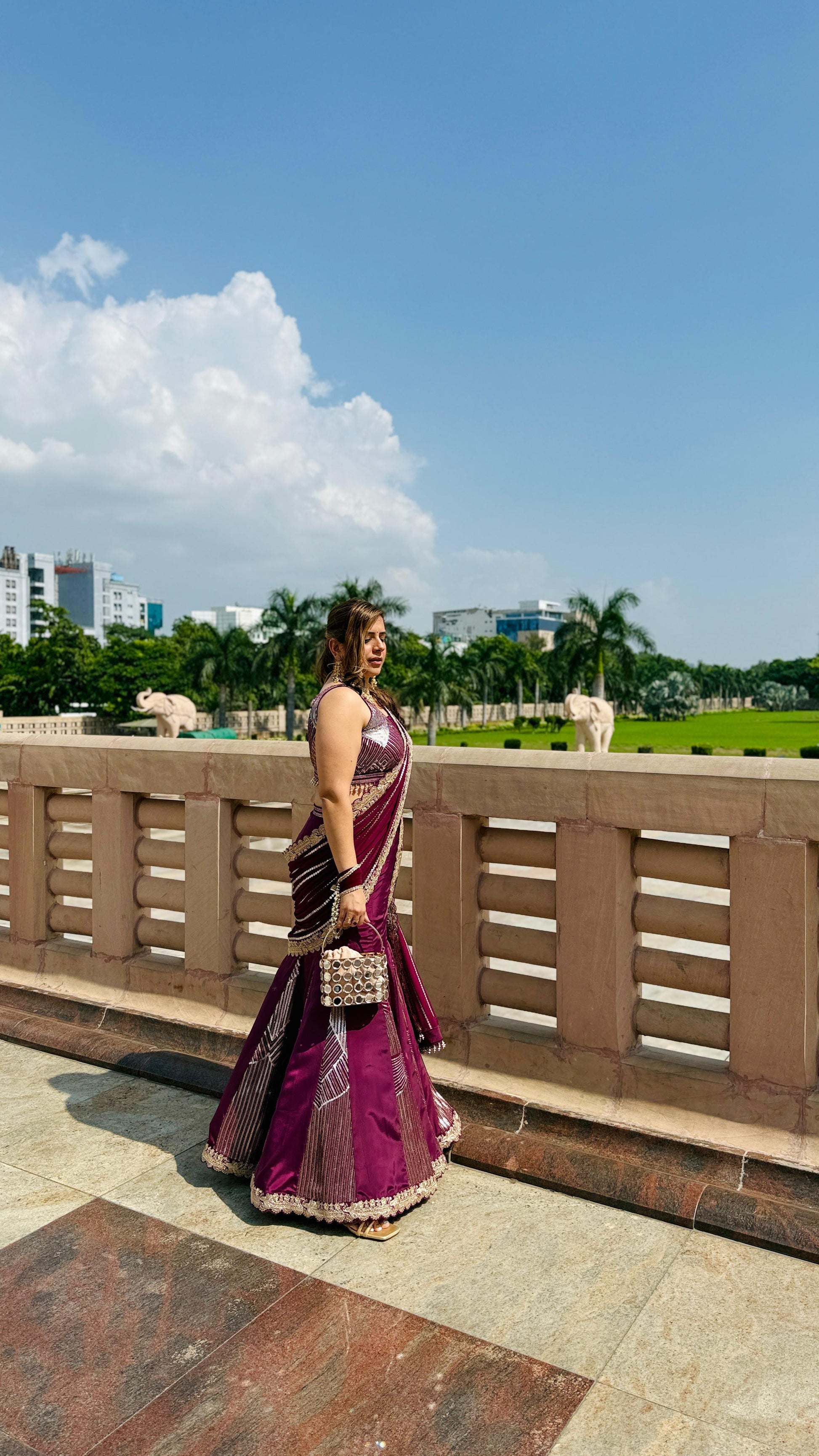 Elegant charm 🍷✨ This Wine Cocktail Saree features a mermaid-style drape with golden embroidery 🌟, sequin blouse shimmer ✨, and scalloped border 🪡. Paired with chic potli bag 🎀—perfect for glamorous evenings 💃. |