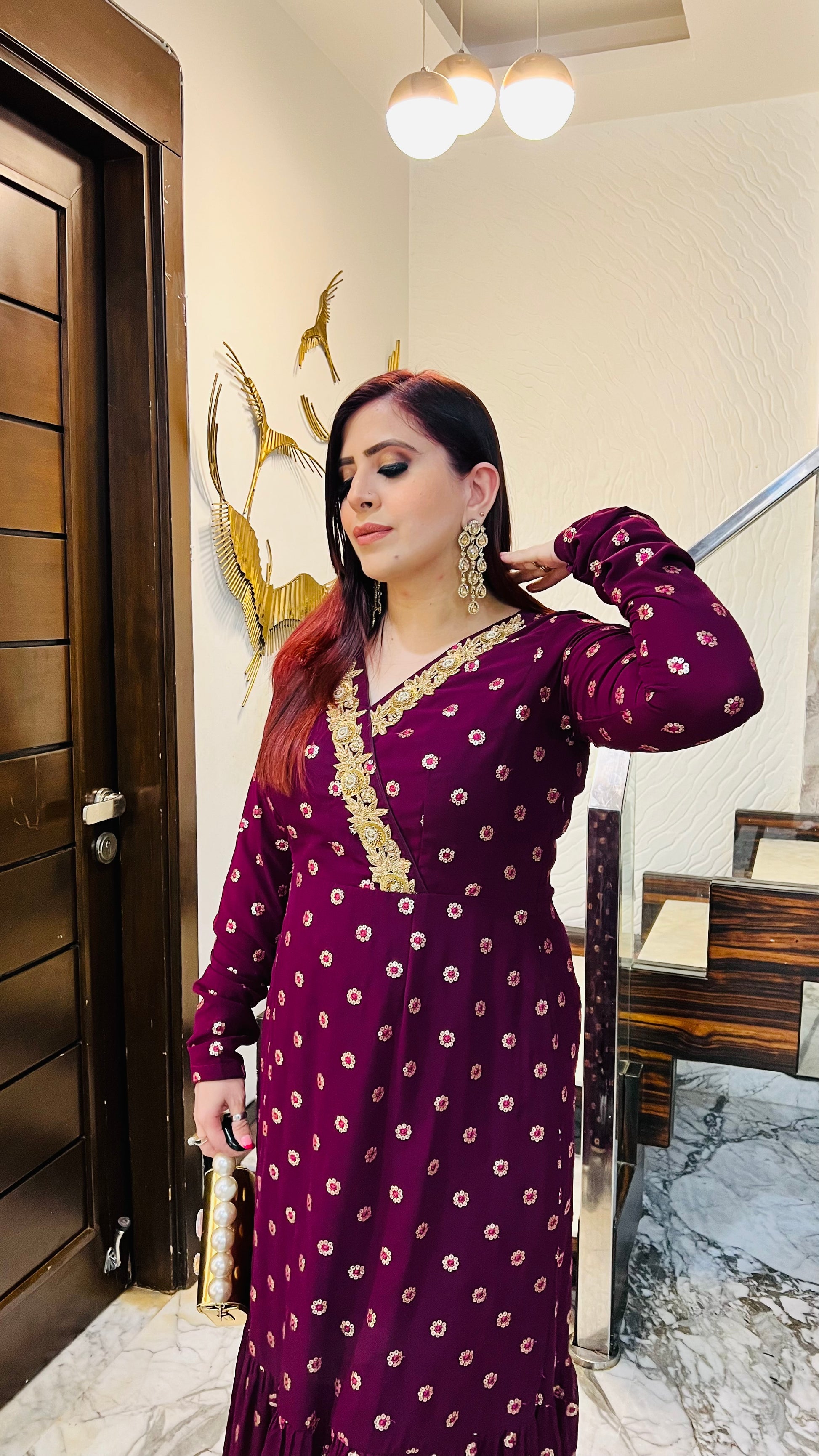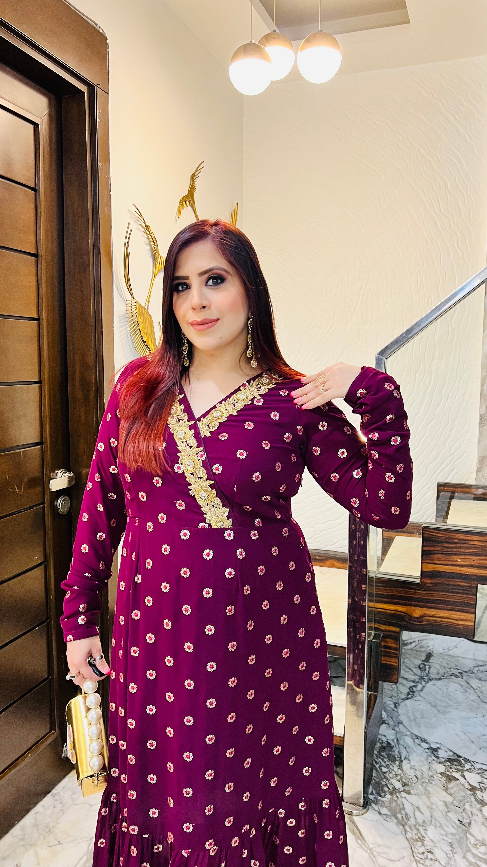 This wine-colored embroidered ethnic maxi dress features intricate gold detailing on the neckline and sleeves ✨. Paired with a stylish handbag and statement earrings, it's perfect for festive occasions 🌟👗. |